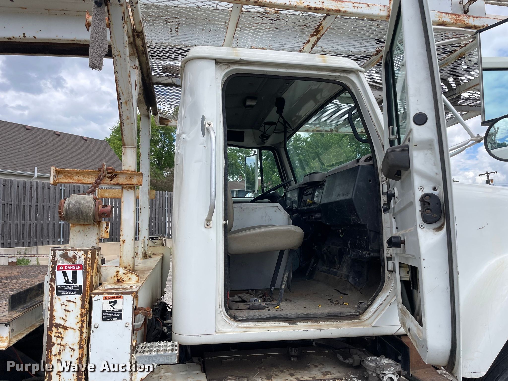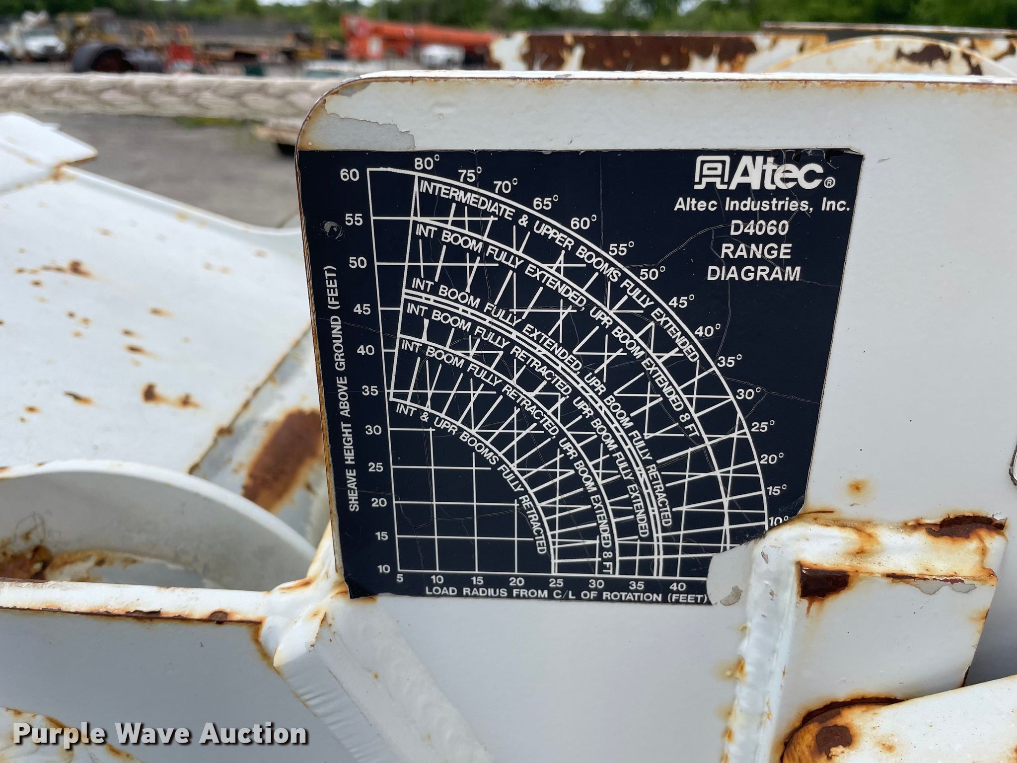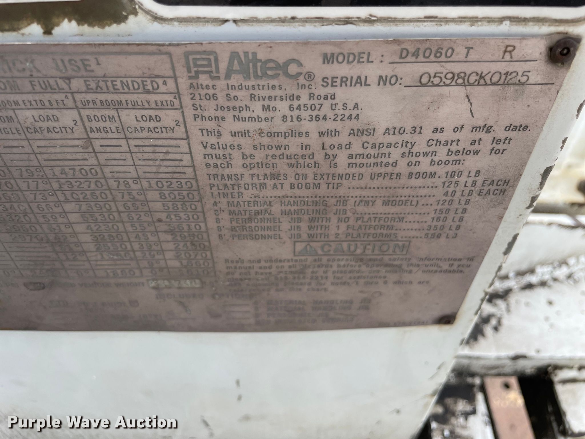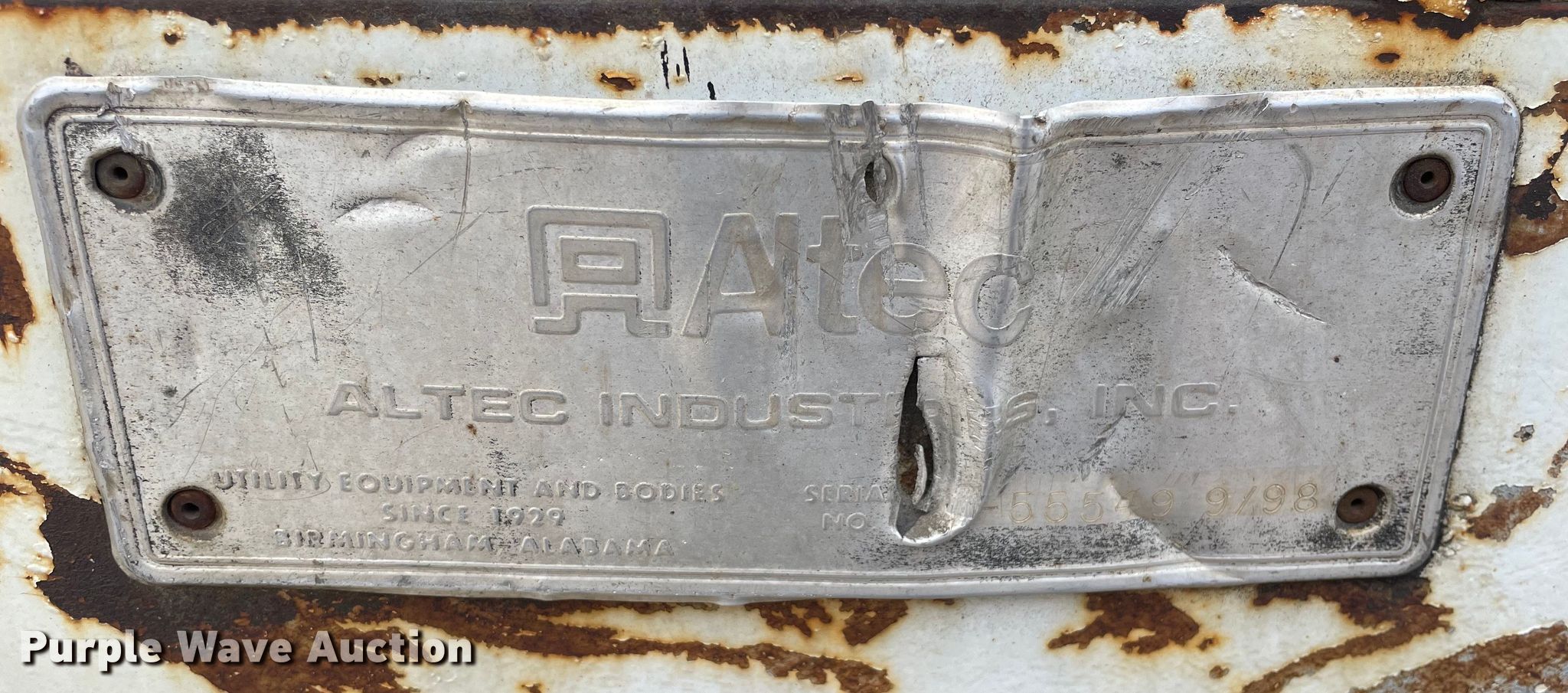 1998 International 2554 digger derrick truck. Miles: 66,538 on odometer, Hours: 10,834 on meter, VIN: 1HTGCADR8WH589316, Unit #: 71. Engine International DT530, Cylinders: 6, Fuel type: Diesel. Transmission Automatic. Chassis Axles: Tandem, Suspension: Spring over walking beam, Brakes: Air, PTO. Interior Heat, Cruise control, Brake controller. Features Bed Altec, 17' 6" L x 93" W, Boom Altec D4060T, Serial: 0598CK0125, Mast height: 60', Boom type: Insulated, Telescopic, Boom controls Ground, Platform/ basket, Material handler, Pole guide, Auger. Tires Size: 11R24.5. Notes Auger bit missing, Hydraulic valve body issues Possible solenoid issues. Illinois title. Title distribution may be delayed up to 14 days from verification of funds. Hecker & Company. Aurora, IL 60502