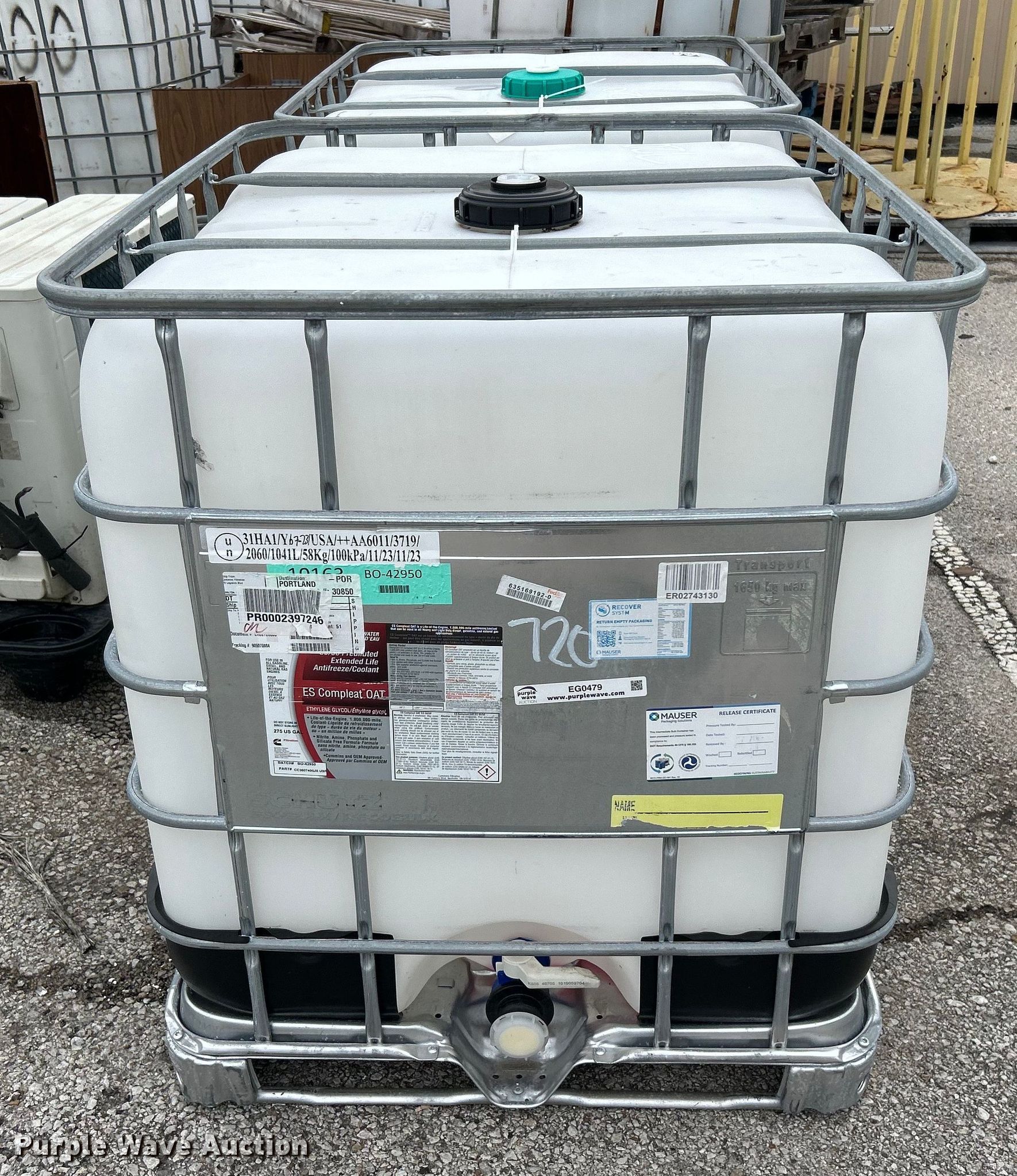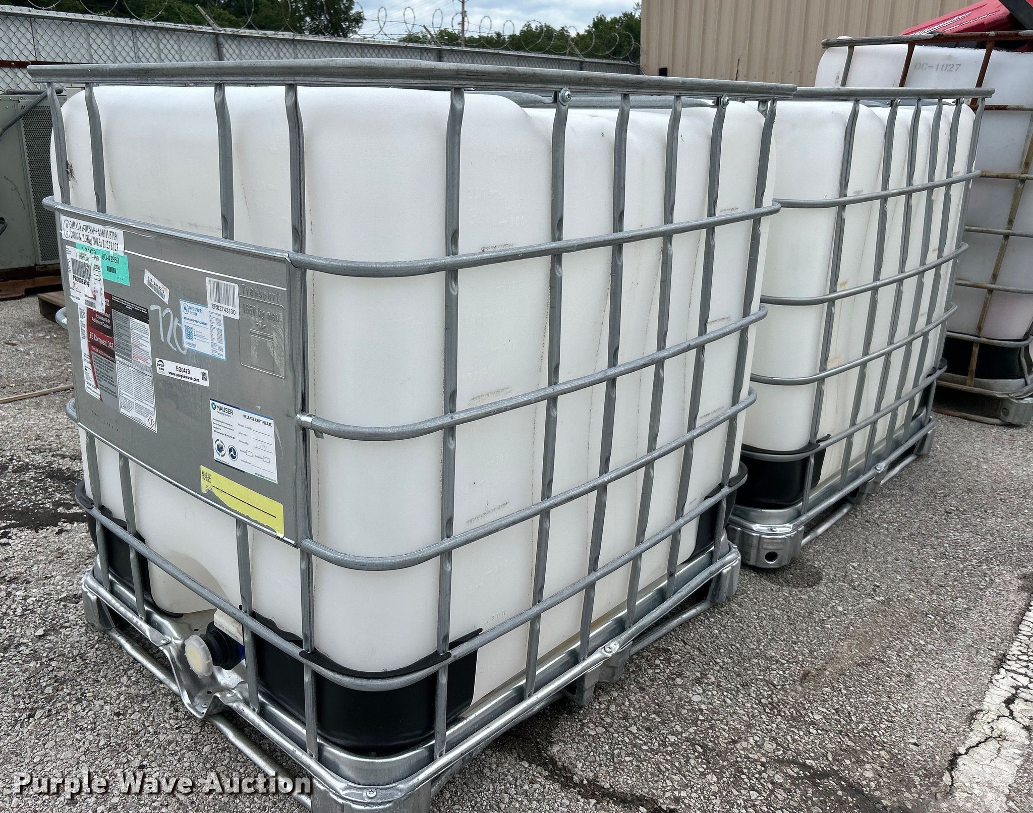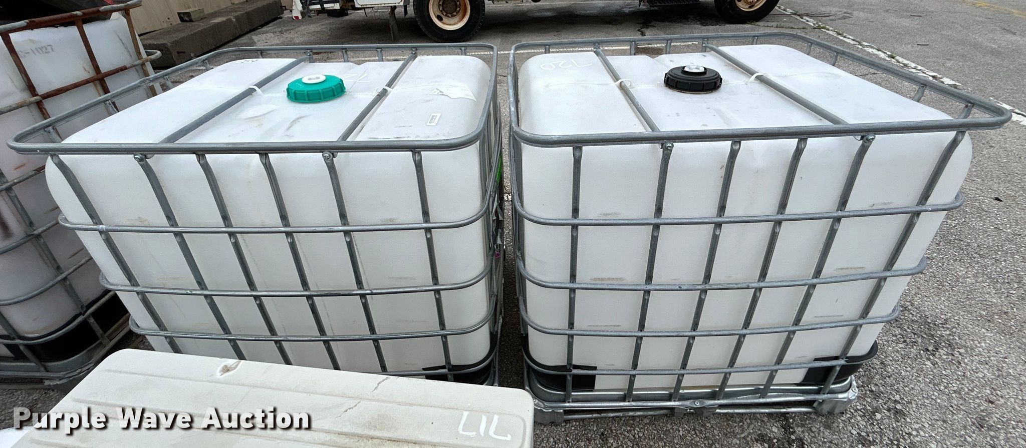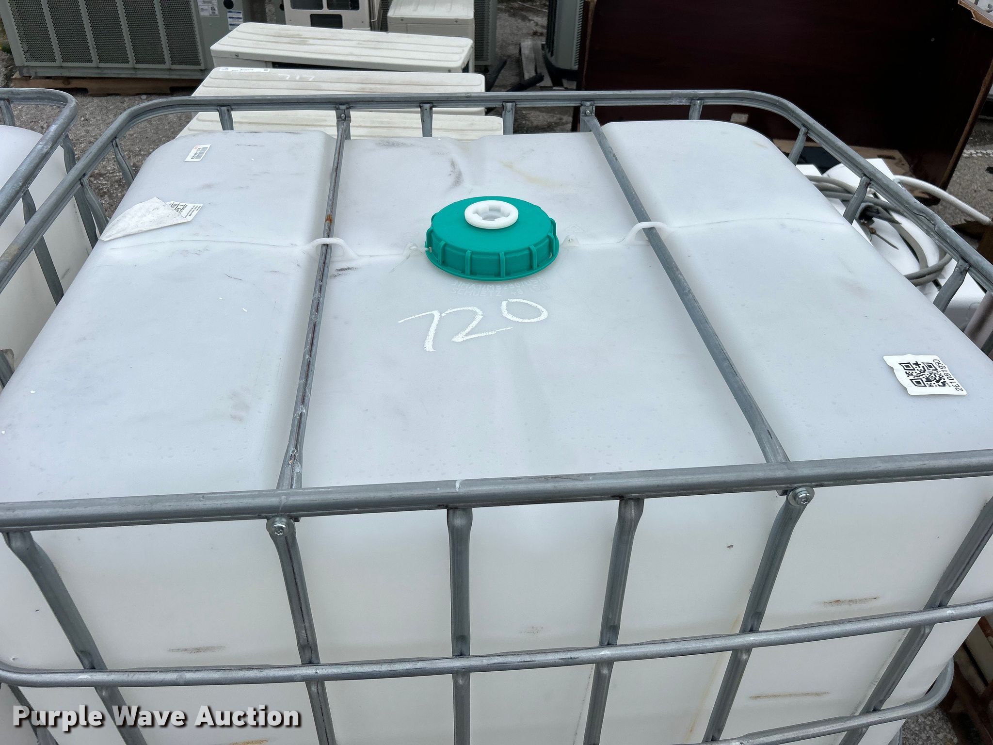Purple Wave is selling a used Tanks in Oklahoma. This item is a (2) poly totes with the following: 47" x 39" x 46", Capacity: 250 gallons, Unit #: 720