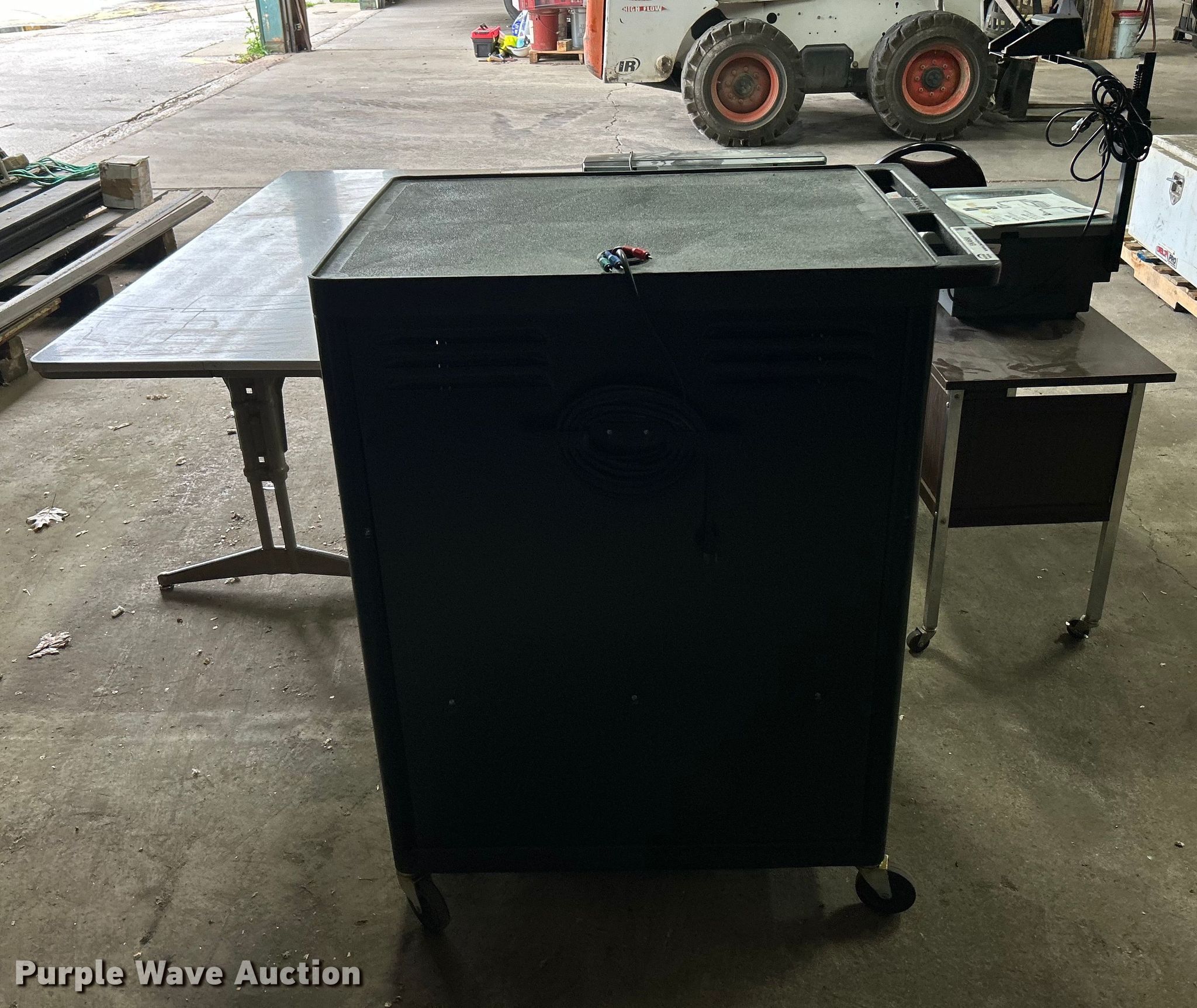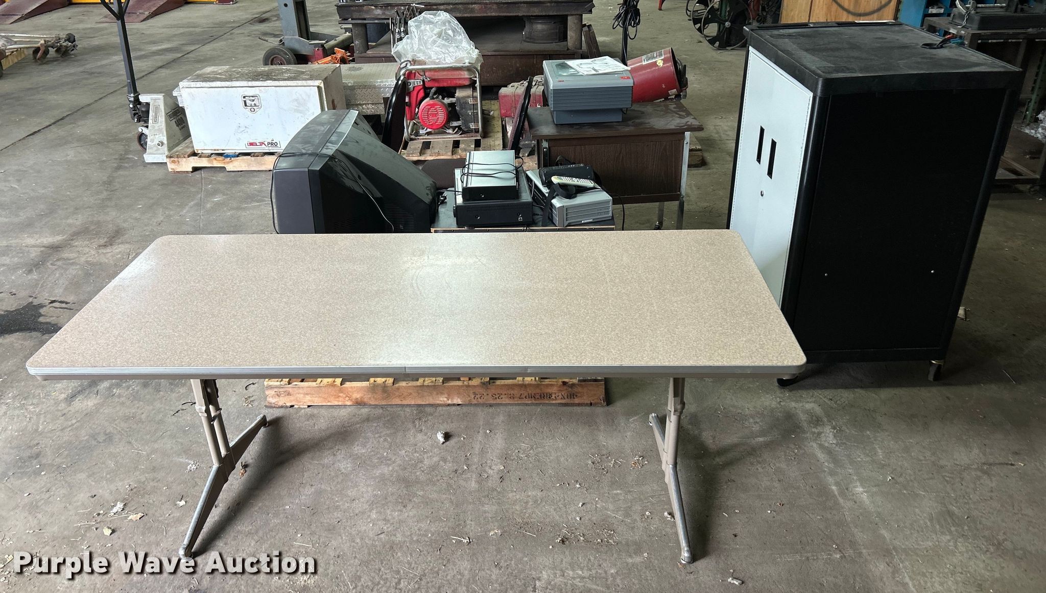 Purple Wave is selling a used Furniture in Missouri. This item is a Furniture with the following: Cart, Table, Projector, TV, (2) chairs, Cabinet and more