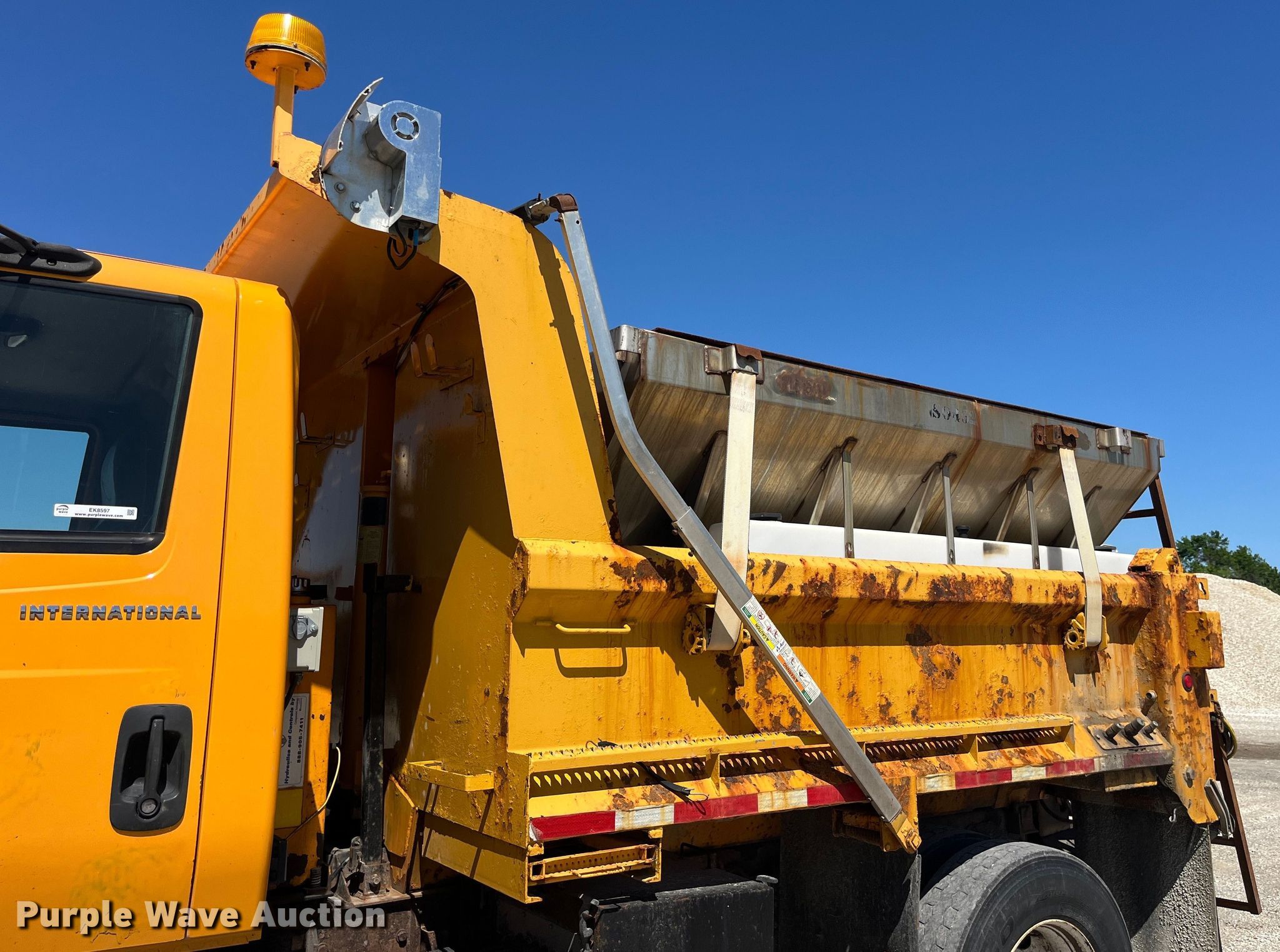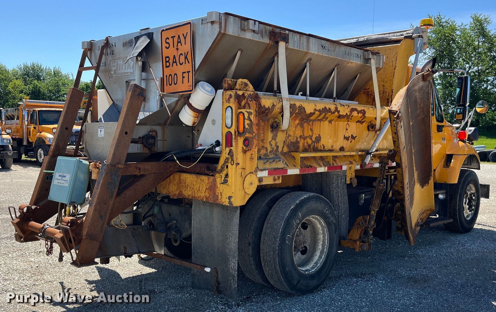 2006 International 7400 dump truck. Miles: 199,588 on odometer, Hours: 12,953 on meter, VIN: 1HTWDAAR86J204178, Unit #: 7423. Engine International DT466, Displacement: 7.6L, Cylinders: 6, Fuel type: Diesel. Transmission Automatic. Chassis Axles: Single, Suspension: Spring, Brakes: Air, Front mount PTO, GVWR: 35,000 lbs FAWR: 14,000 lbs, RAWR: 21,000 lbs. Interior AC, heat, Heated mirrors, Power windows, power locks, Cruise control. Features Dump bed 10' L x 8' W, Side height: 28", Bed type: Steel, Bed vibrator, Roll tarp, Ram: Single, End gate: Air operated, Spreader Flink, Plow Width: 144", Wing plow Henke, Width: 96". Tires Front: 315/80R22.5, Rear: 11R22.5. Missouri title. Missouri Department of Transportation (MODOT). Macon, MO 63552