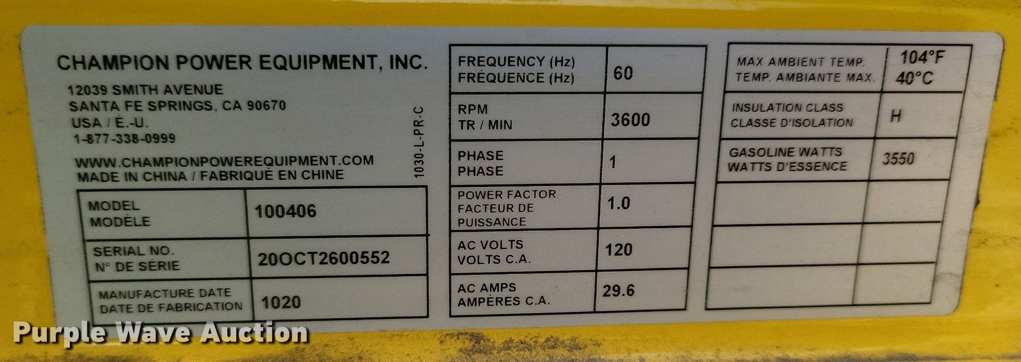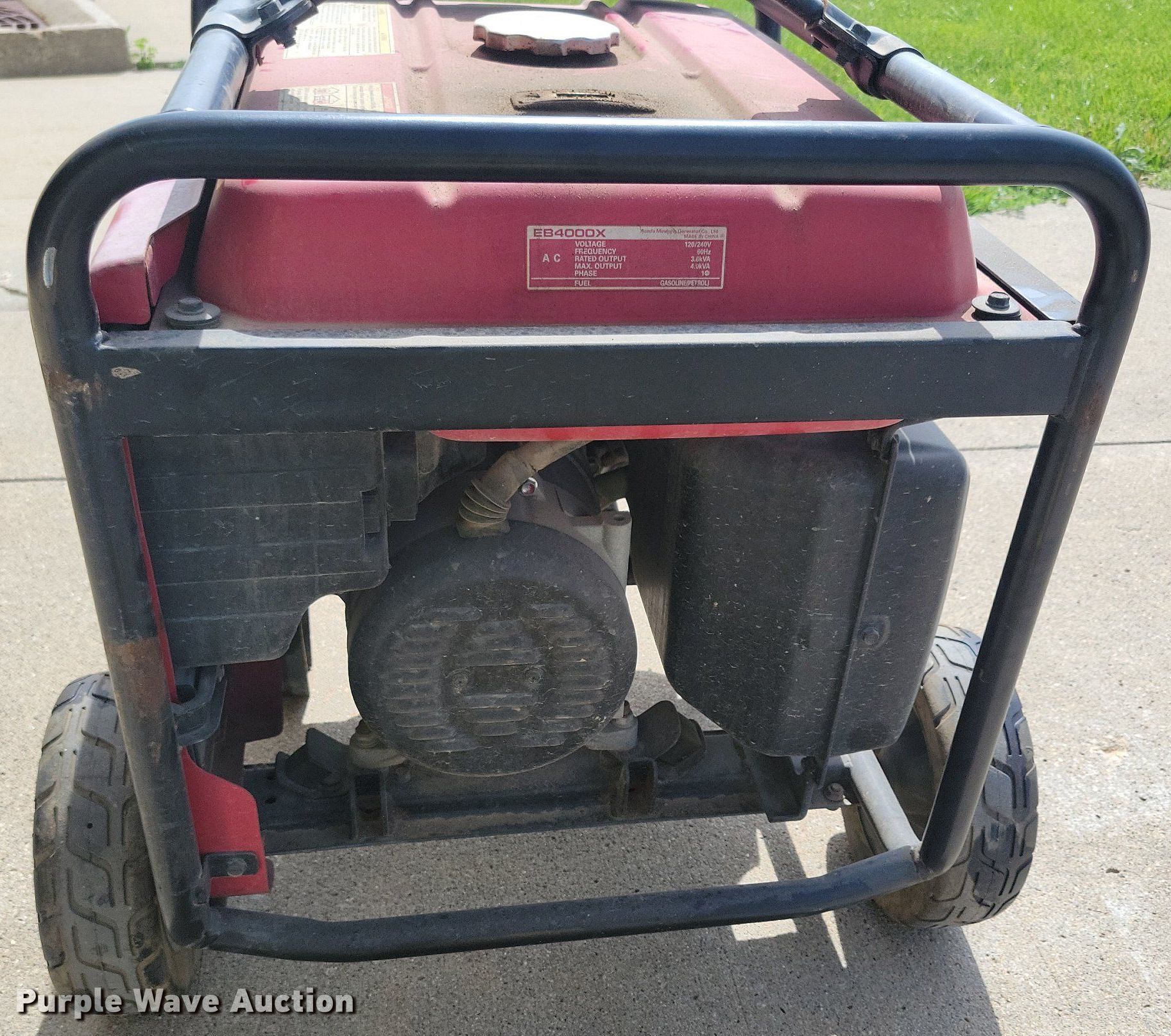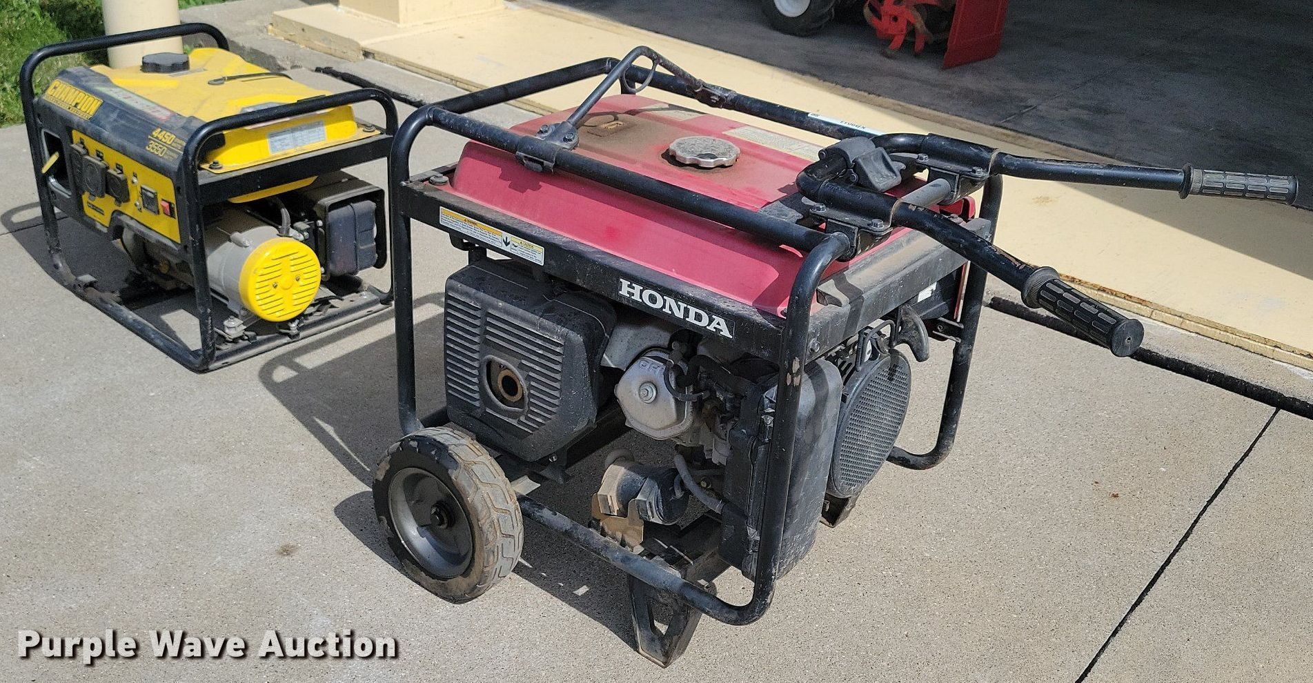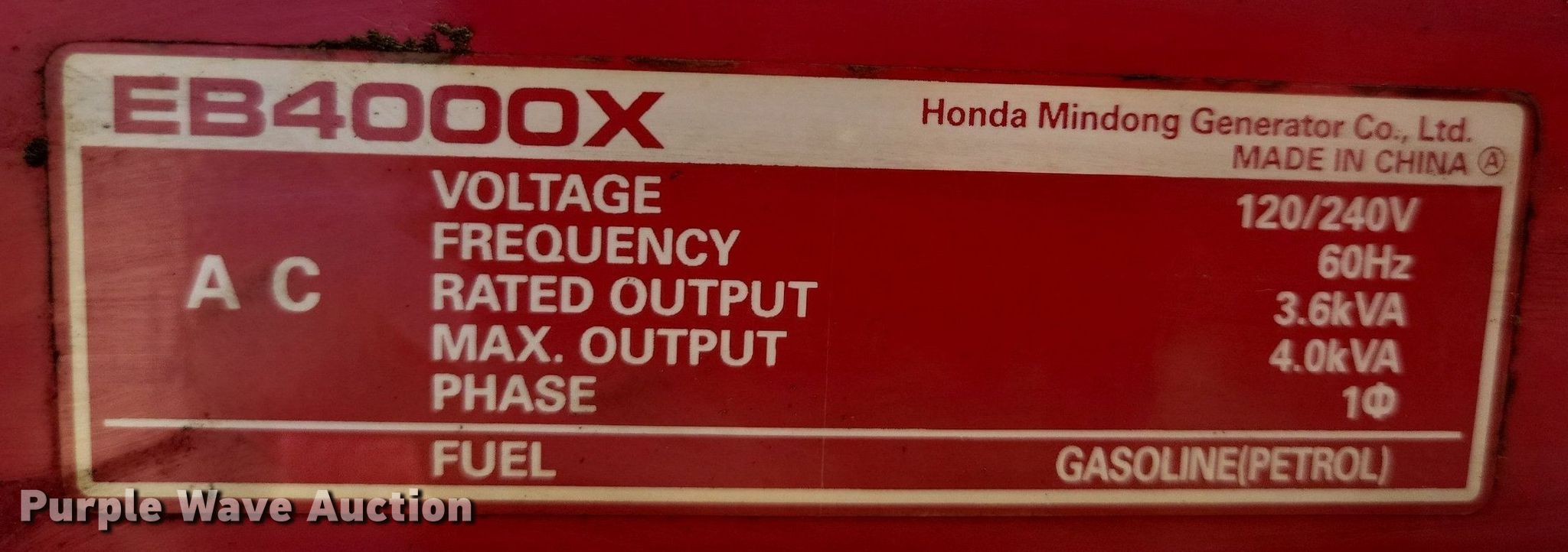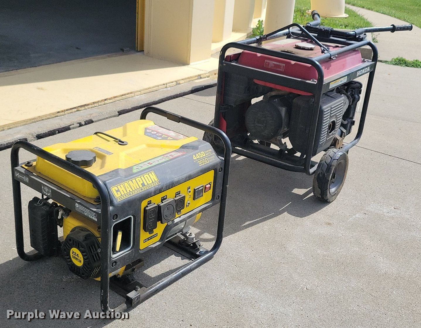 (2) generators. Honda EB4000X. Serial: 20OCY2600552. Engine Cylinders: 1, Fuel type: Gas. Features Generator Honda EB4000X, Watts: 4,000, Phase: Single, Electric start, Fuel tank. Champion 100406 Serial: 20OCT2600552. Engine Displacement: 224 cc. Features Generator Phase: Single. Urbandale Water Utility. Urbandale, IA 50322