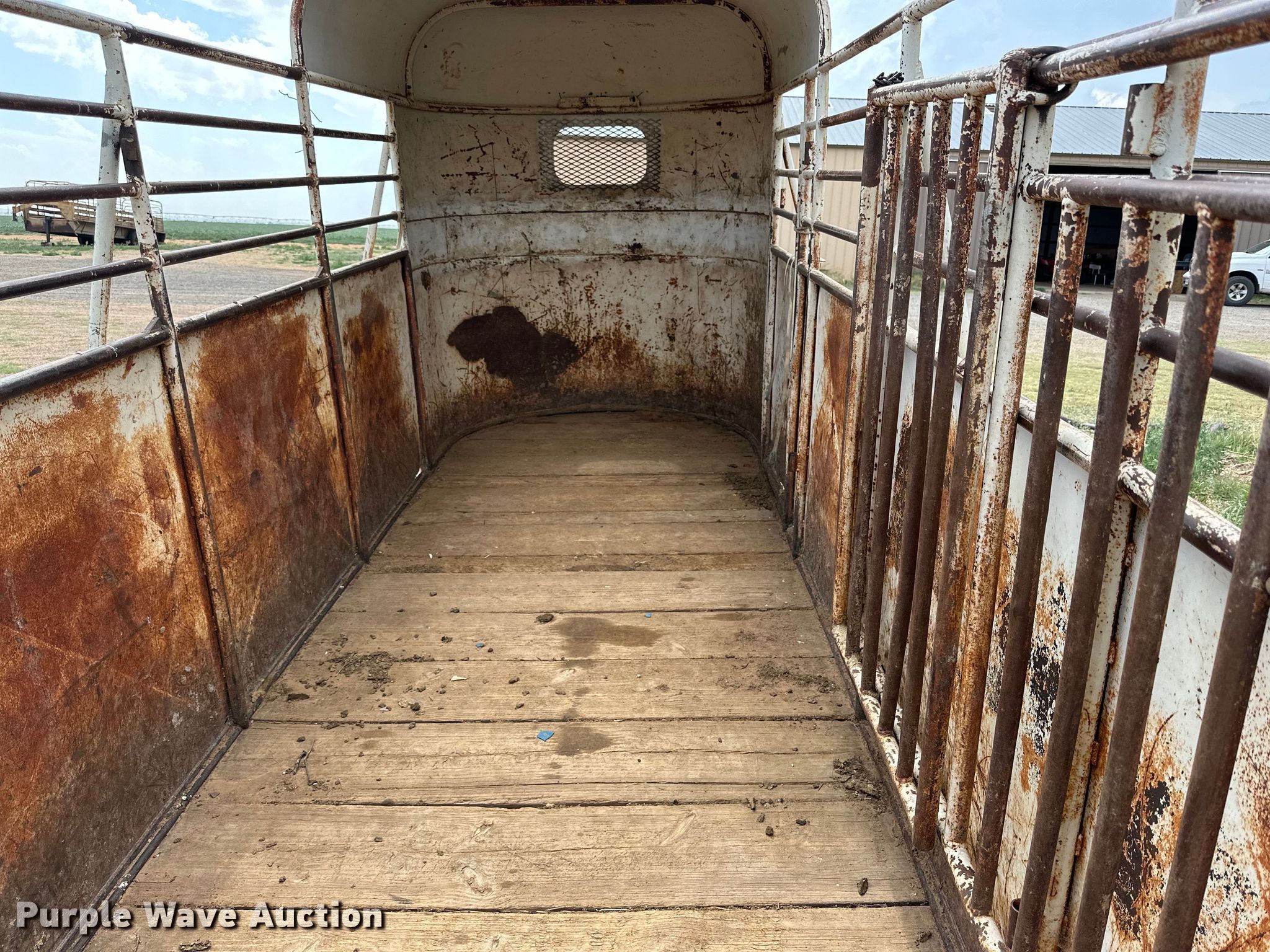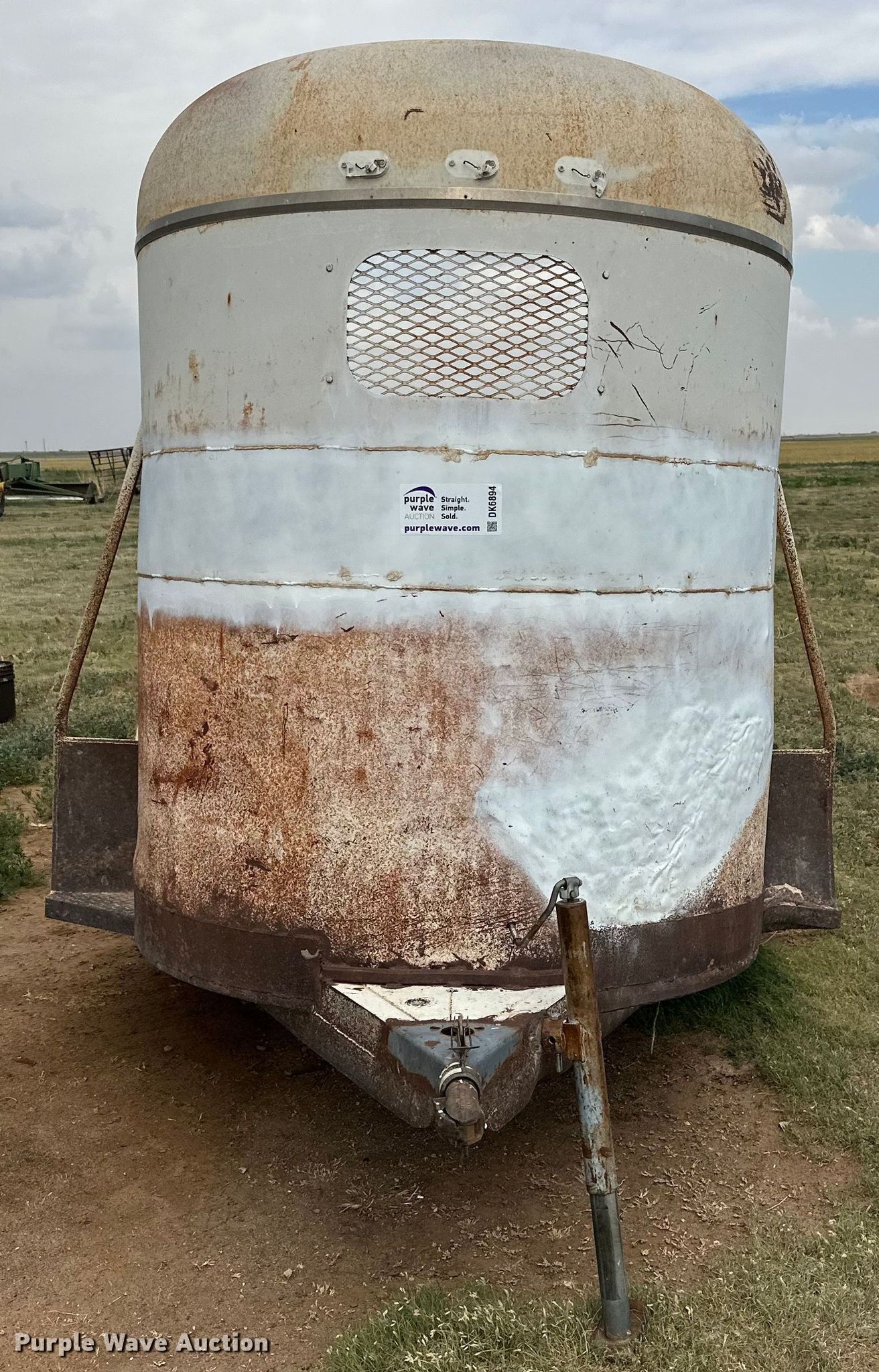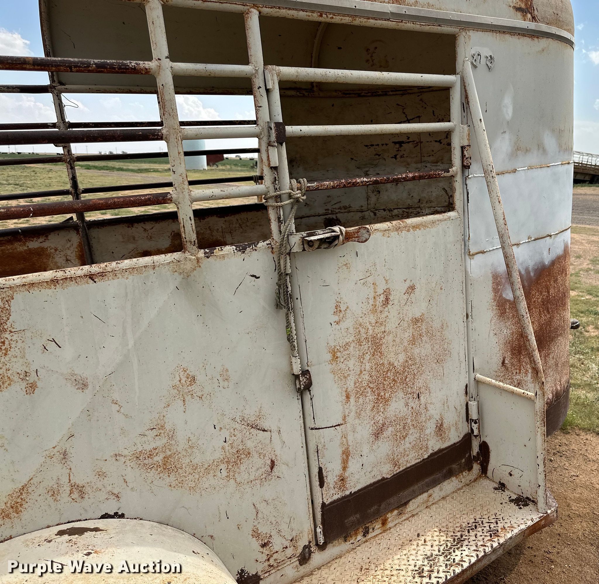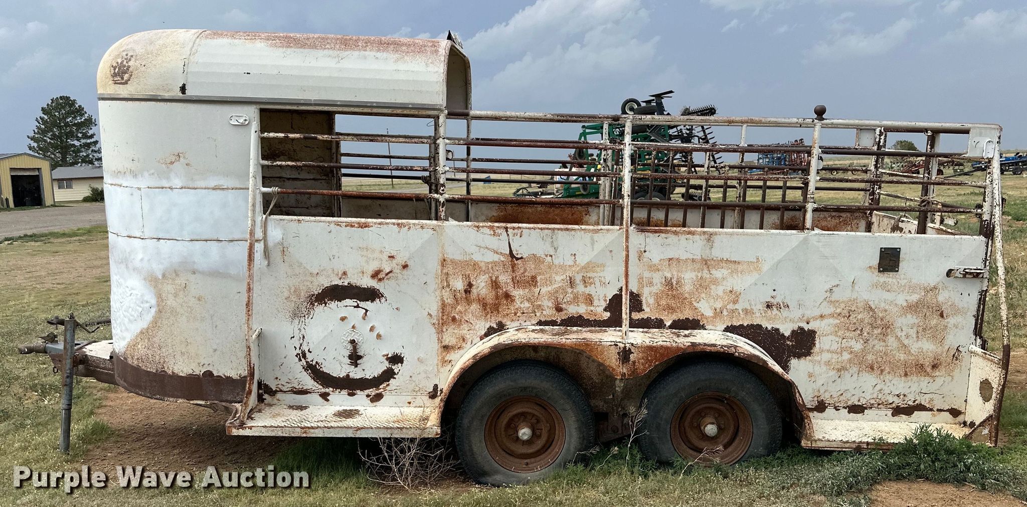 Shop built livestock trailer. Dimensions. Overall: 18' L x 92" W, Body: 16' L x 57" W. Features Horse capacity: 4, Ground load. Chassis Ball hitch: 2", Landing gear: Single, Suspension: Spring, Axles: Tandem. Tires Steel wheels, Size: 205/90R15. Notes Flat tires. Pursuant to New Mexico law, Purple Wave will not be collecting sales taxes on any of the purchases made in this business liquidation auction. Transfer of ownership documentation will be a bill of sale. Estate of Robert J. Podzemny. Sedan, NM 88436
