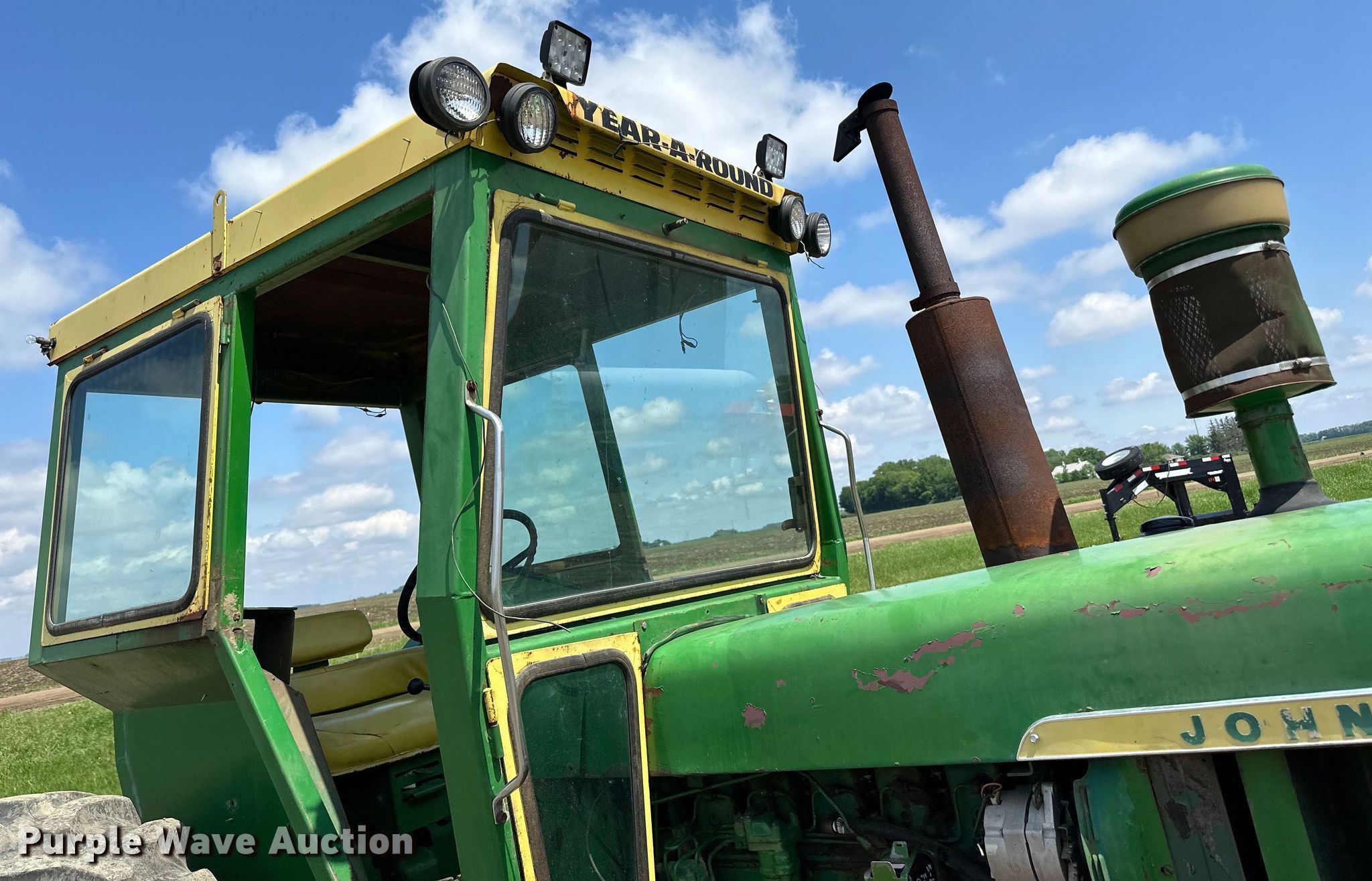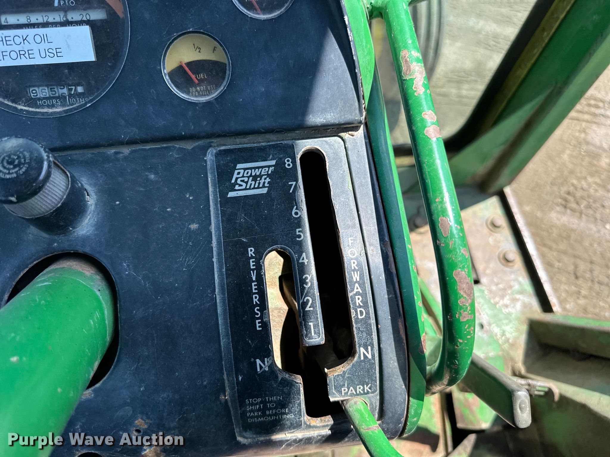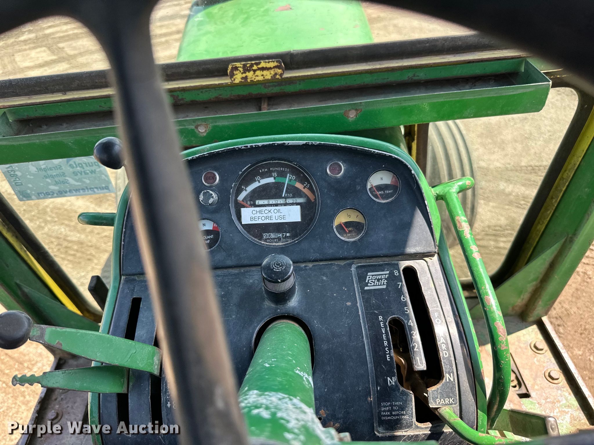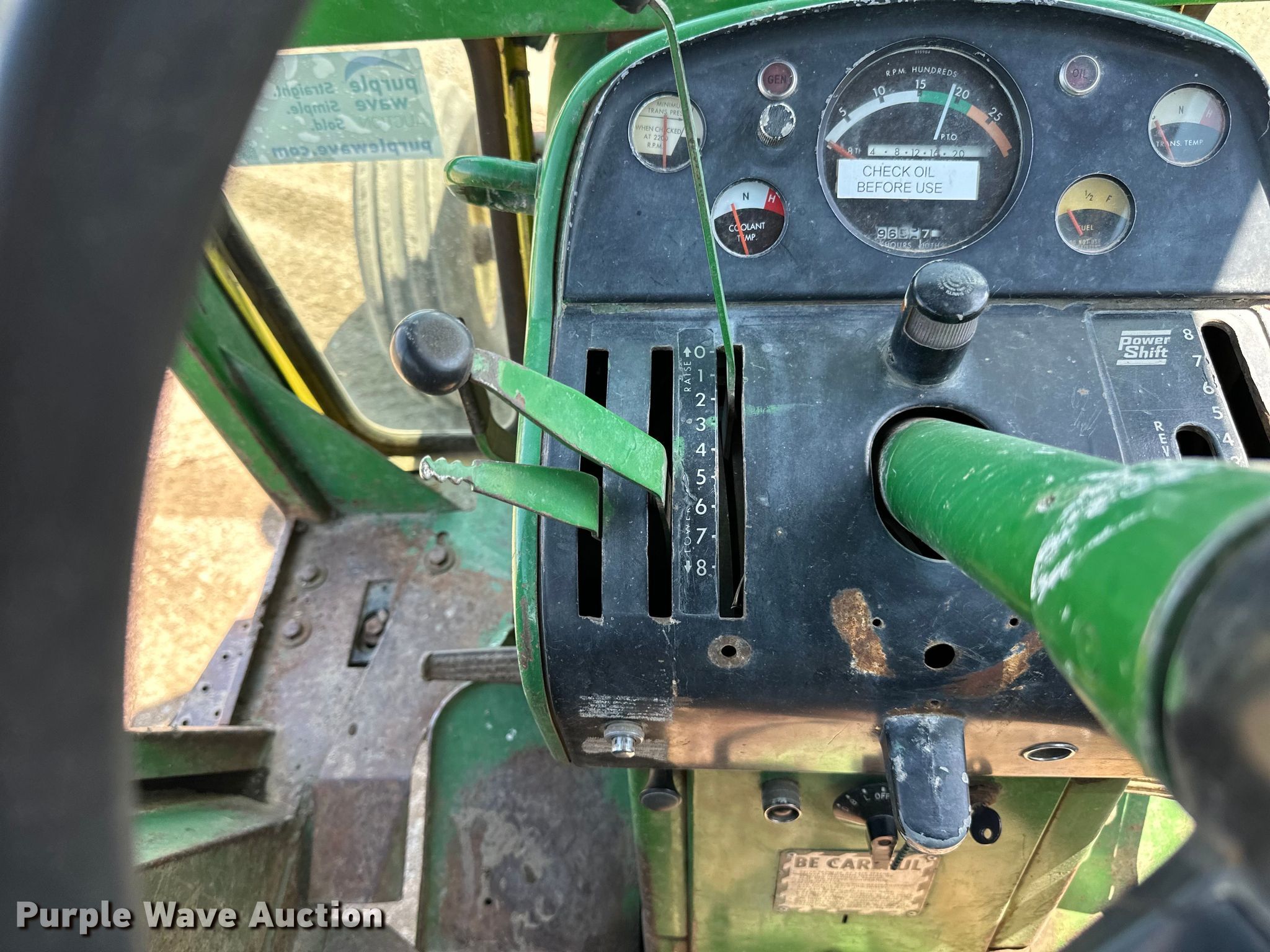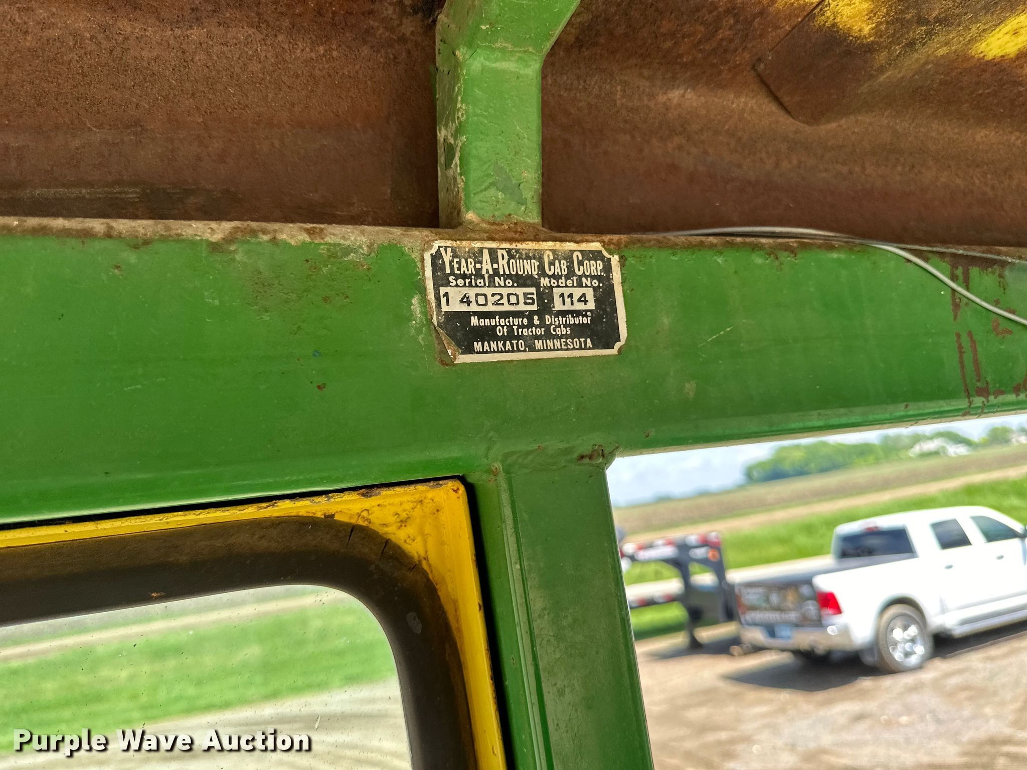 1966 John Deere 4020 tractor. Hours: 9,656 on meter, Serial: T213 144423R. Engine John Deere, Cylinders: 6, Fuel type: Diesel. Transmission Powershift, 8F - 4R. Features PTO: 540, 1000, Three point Top link. Tires Front: 10.00-16, Rear: 18.4-34. Notes Doors missing, Back window missing. Christensen Family Farms. Sleepy Eye, MN 56085