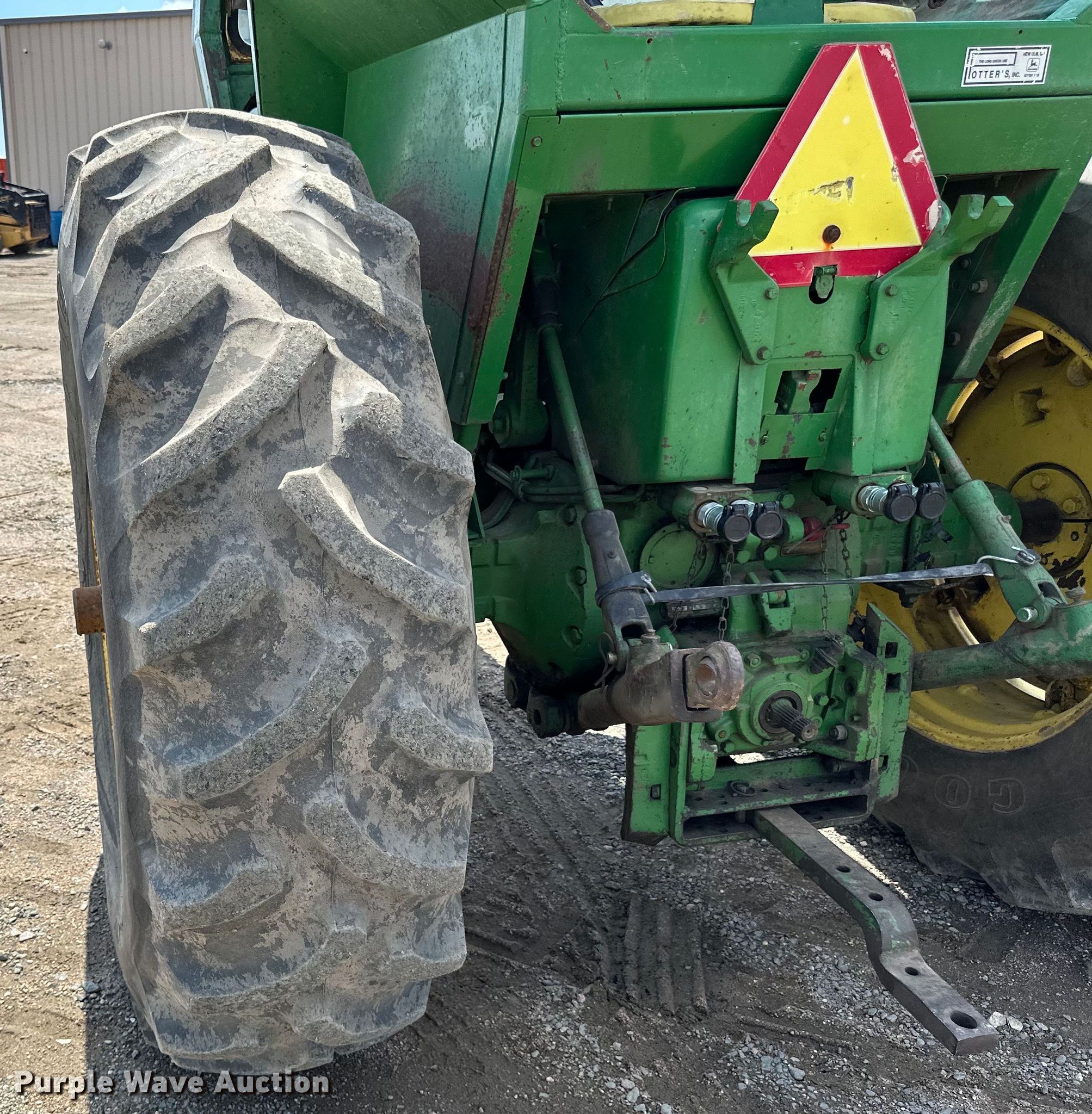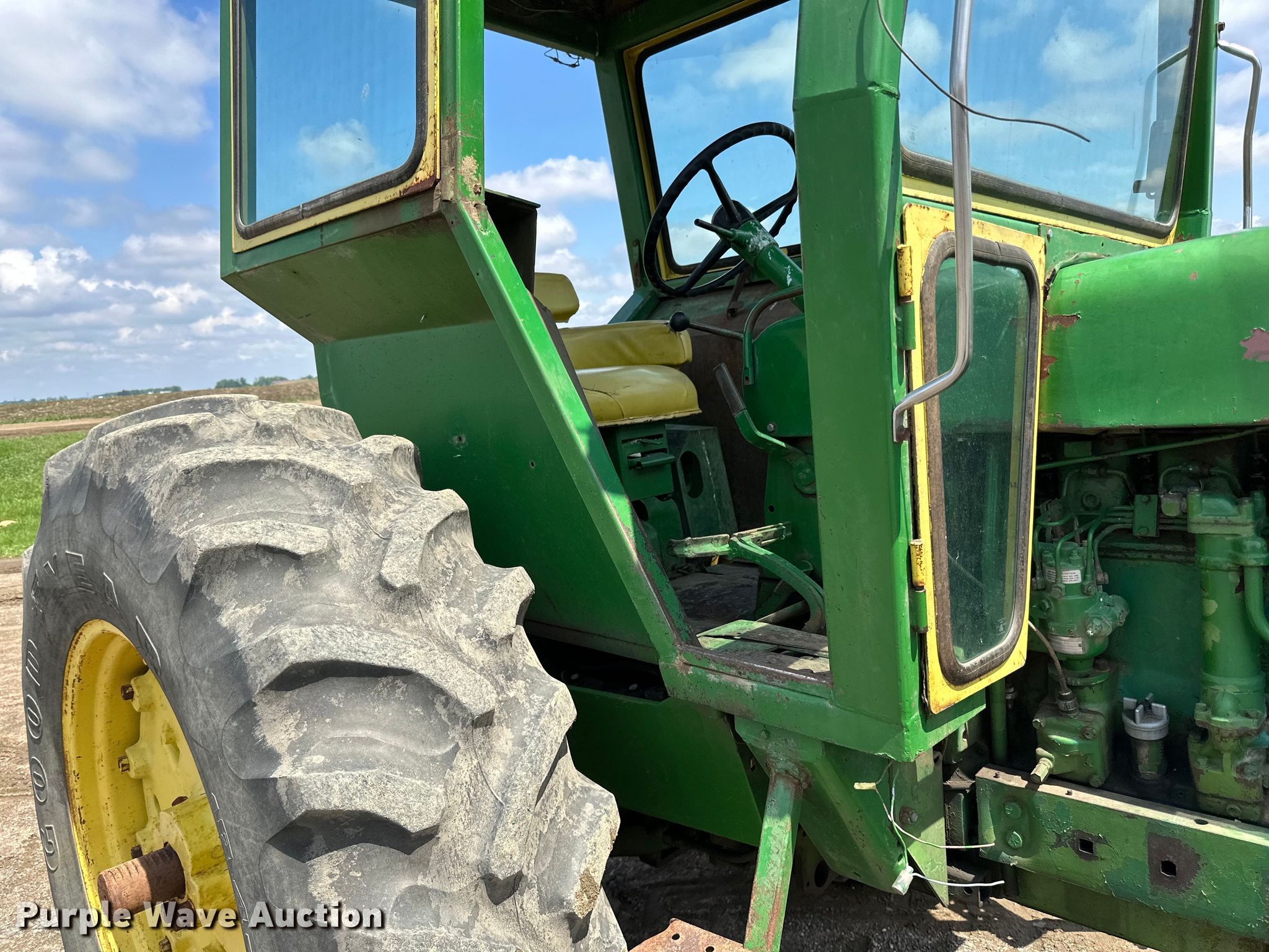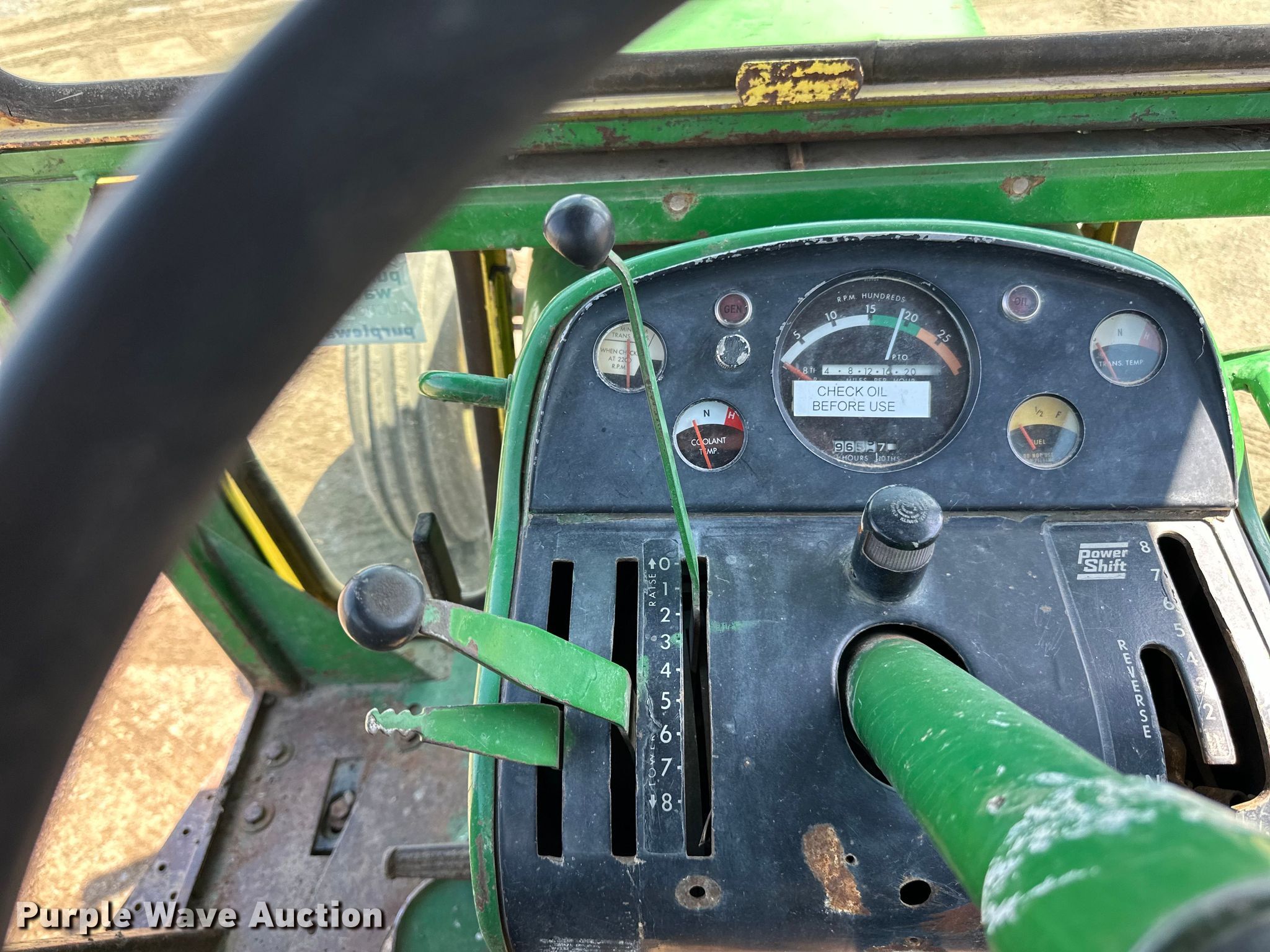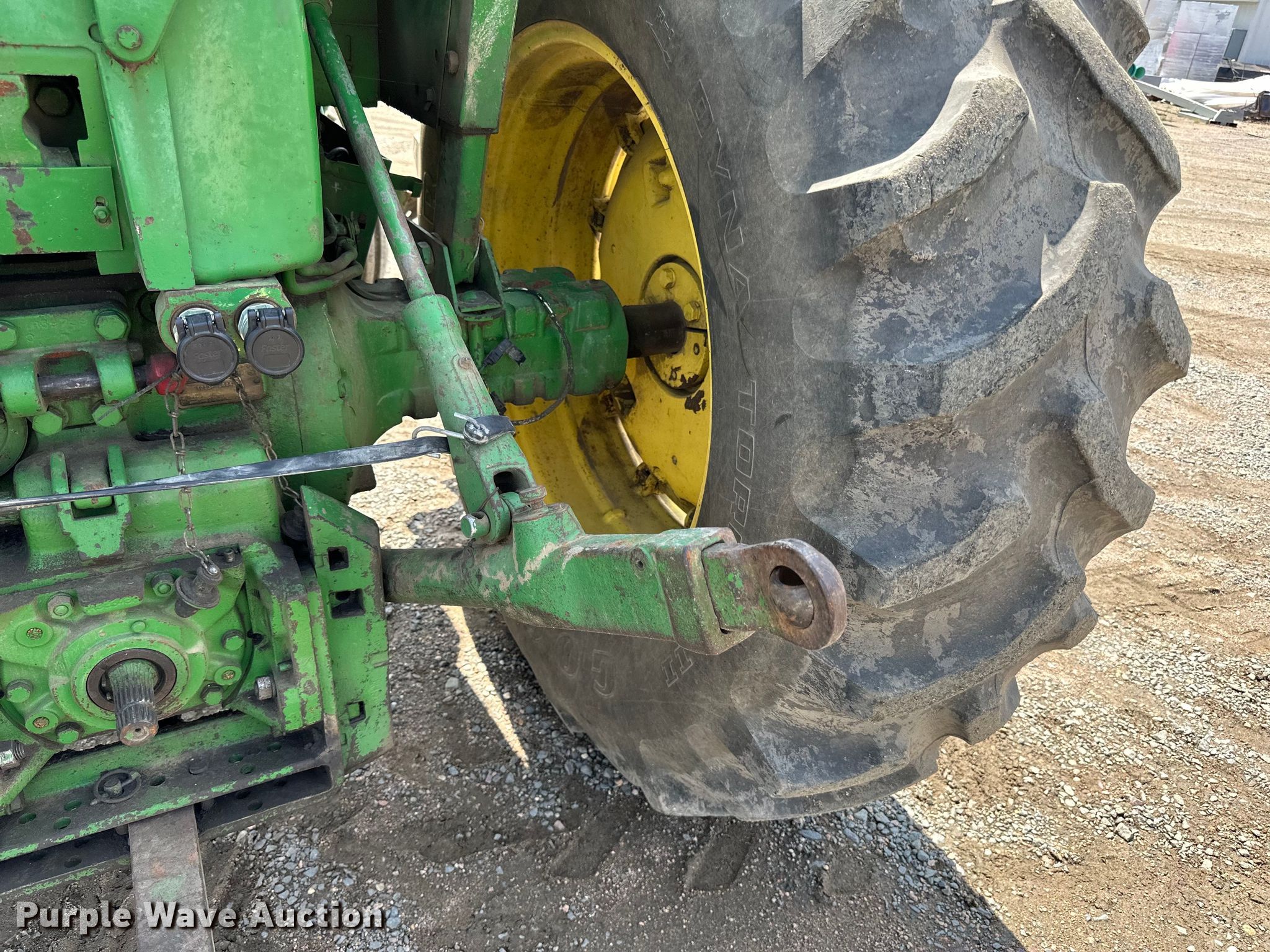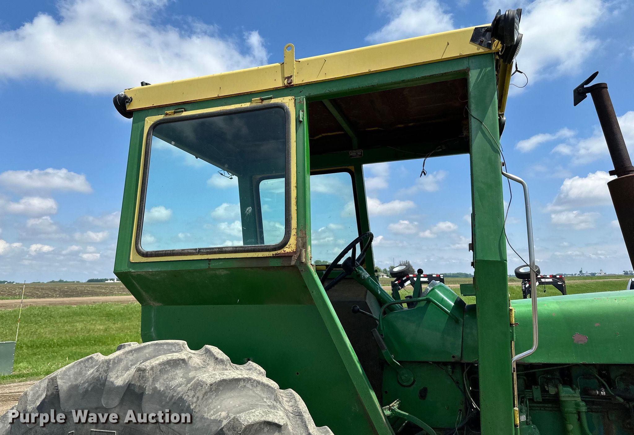 1966 John Deere 4020 tractor. Hours: 9,656 on meter, Serial: T213 144423R. Engine John Deere, Cylinders: 6, Fuel type: Diesel. Transmission Powershift, 8F - 4R. Features PTO: 540, 1000, Three point Top link. Tires Front: 10.00-16, Rear: 18.4-34. Notes Doors missing, Back window missing. Christensen Family Farms. Sleepy Eye, MN 56085