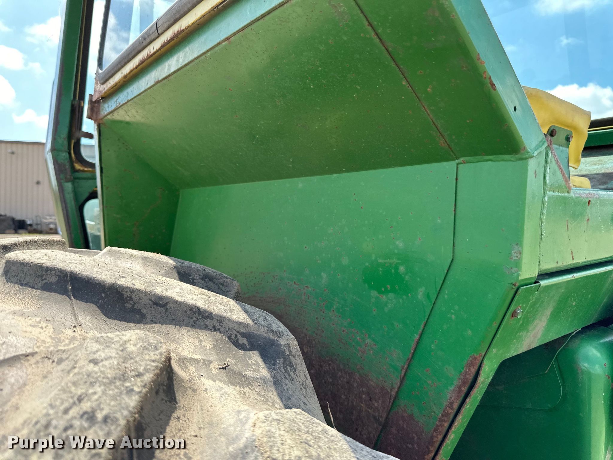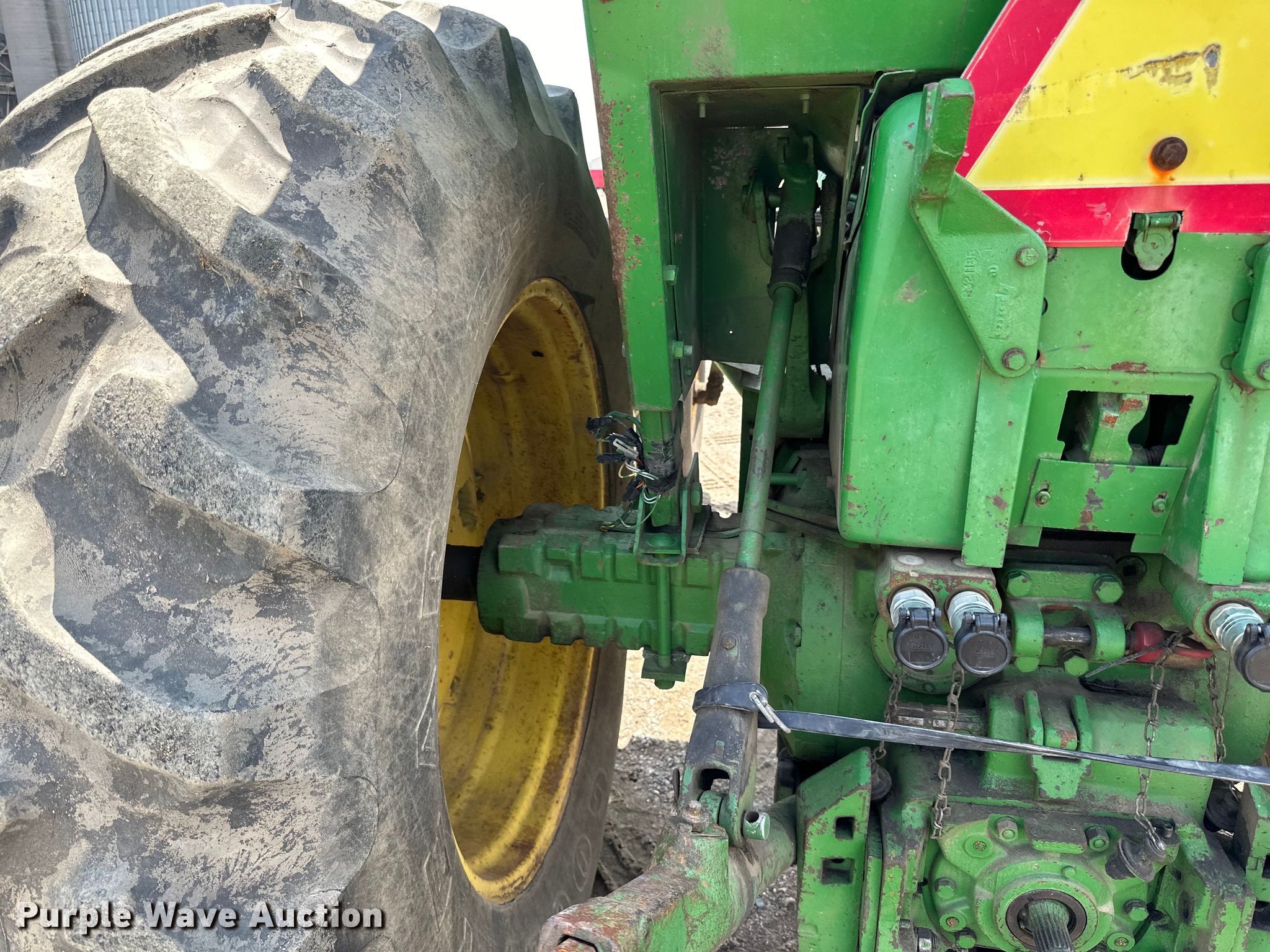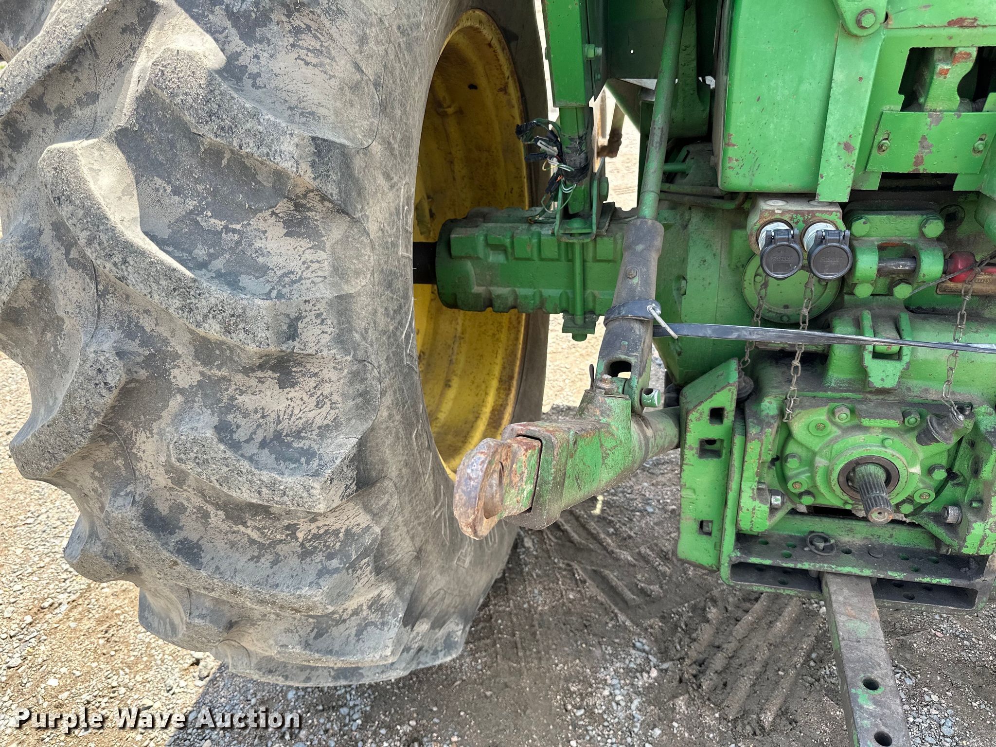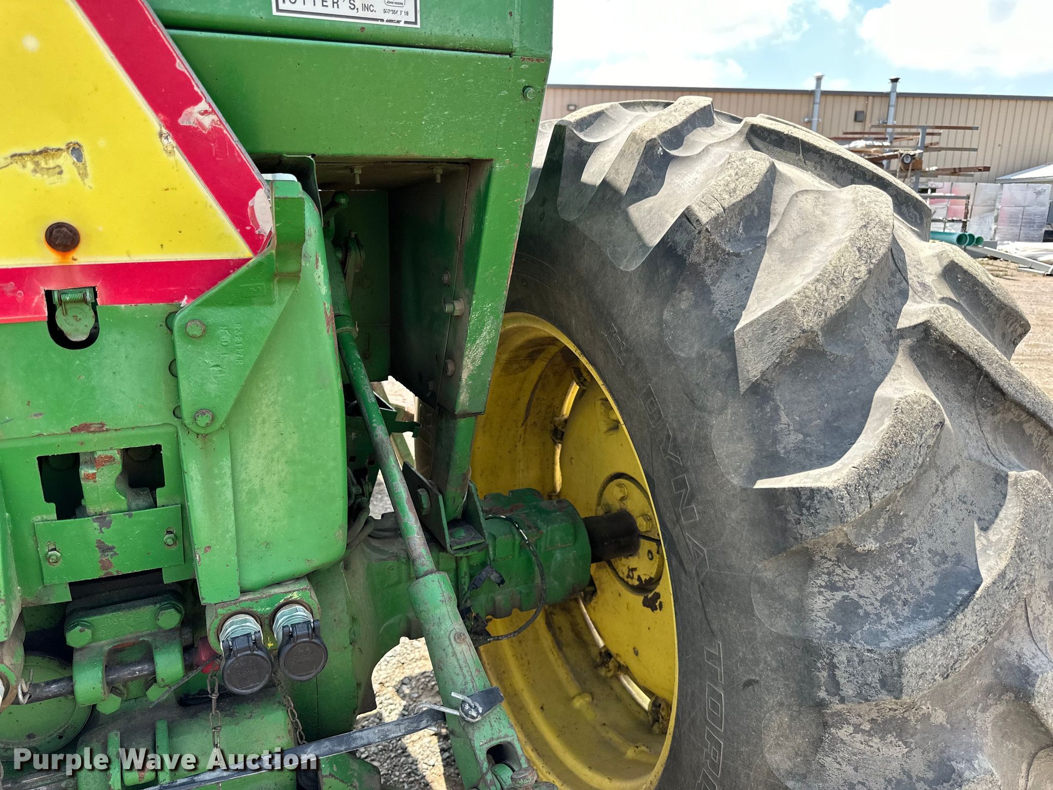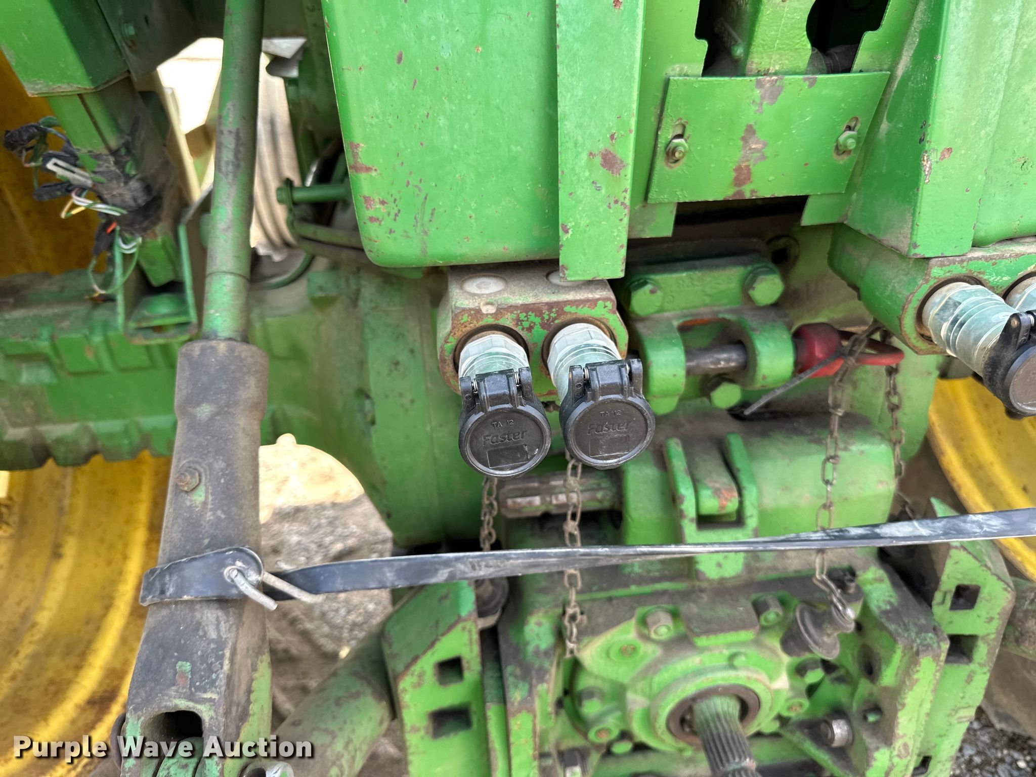1966 John Deere 4020 tractor. Hours: 9,656 on meter, Serial: T213 144423R. Engine John Deere, Cylinders: 6, Fuel type: Diesel. Transmission Powershift, 8F - 4R. Features PTO: 540, 1000, Three point Top link. Tires Front: 10.00-16, Rear: 18.4-34. Notes Doors missing, Back window missing. Christensen Family Farms. Sleepy Eye, MN 56085