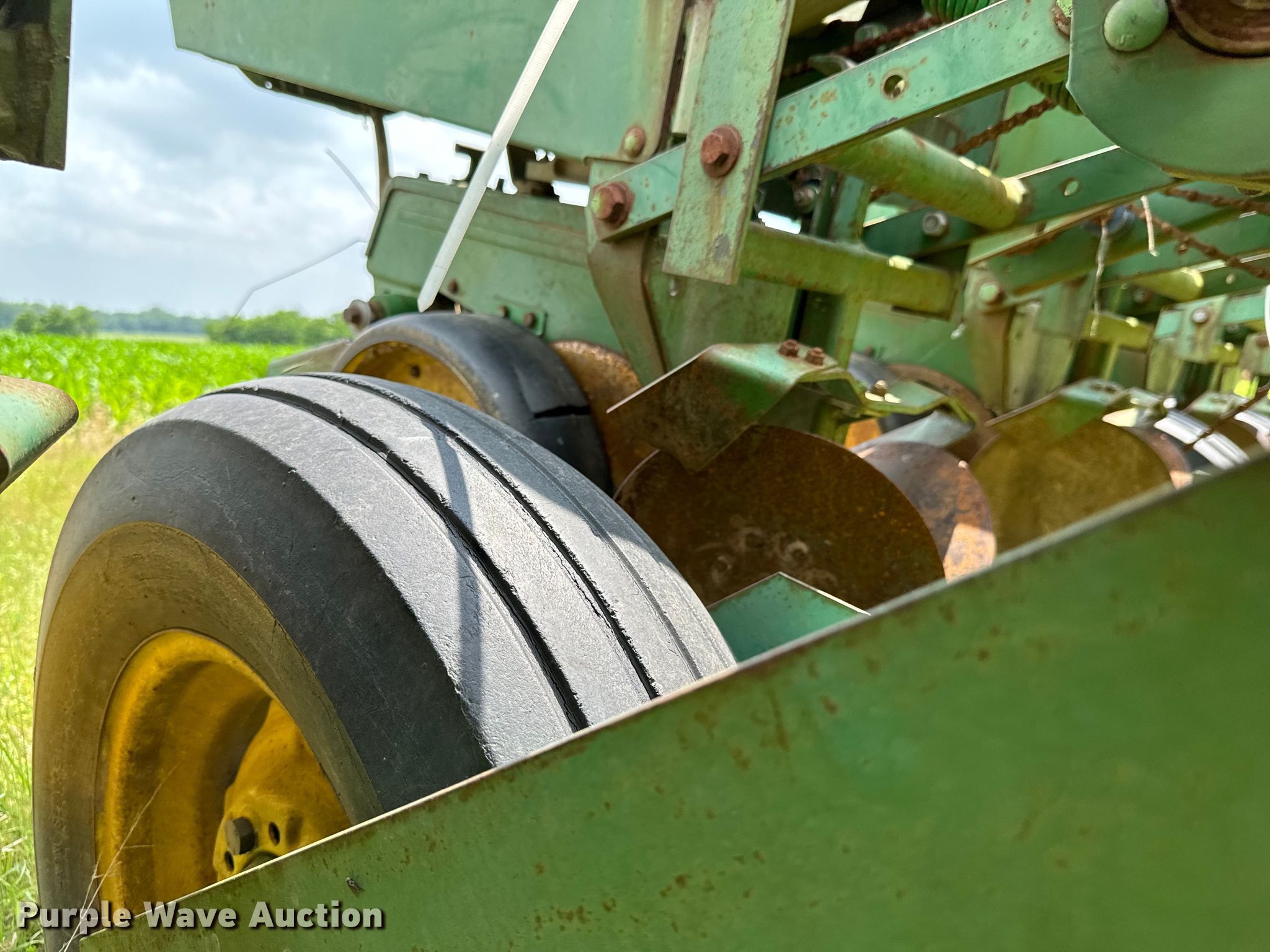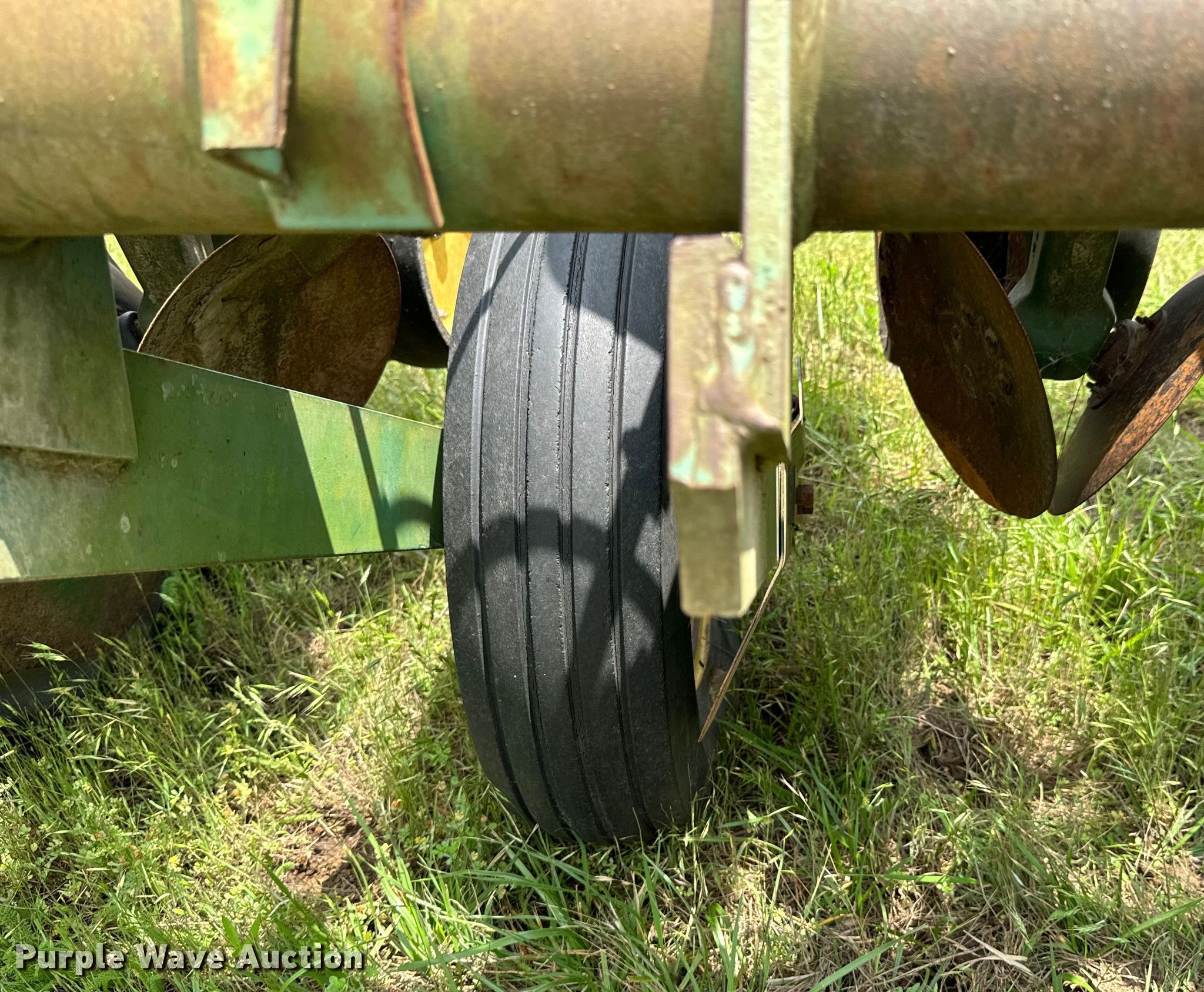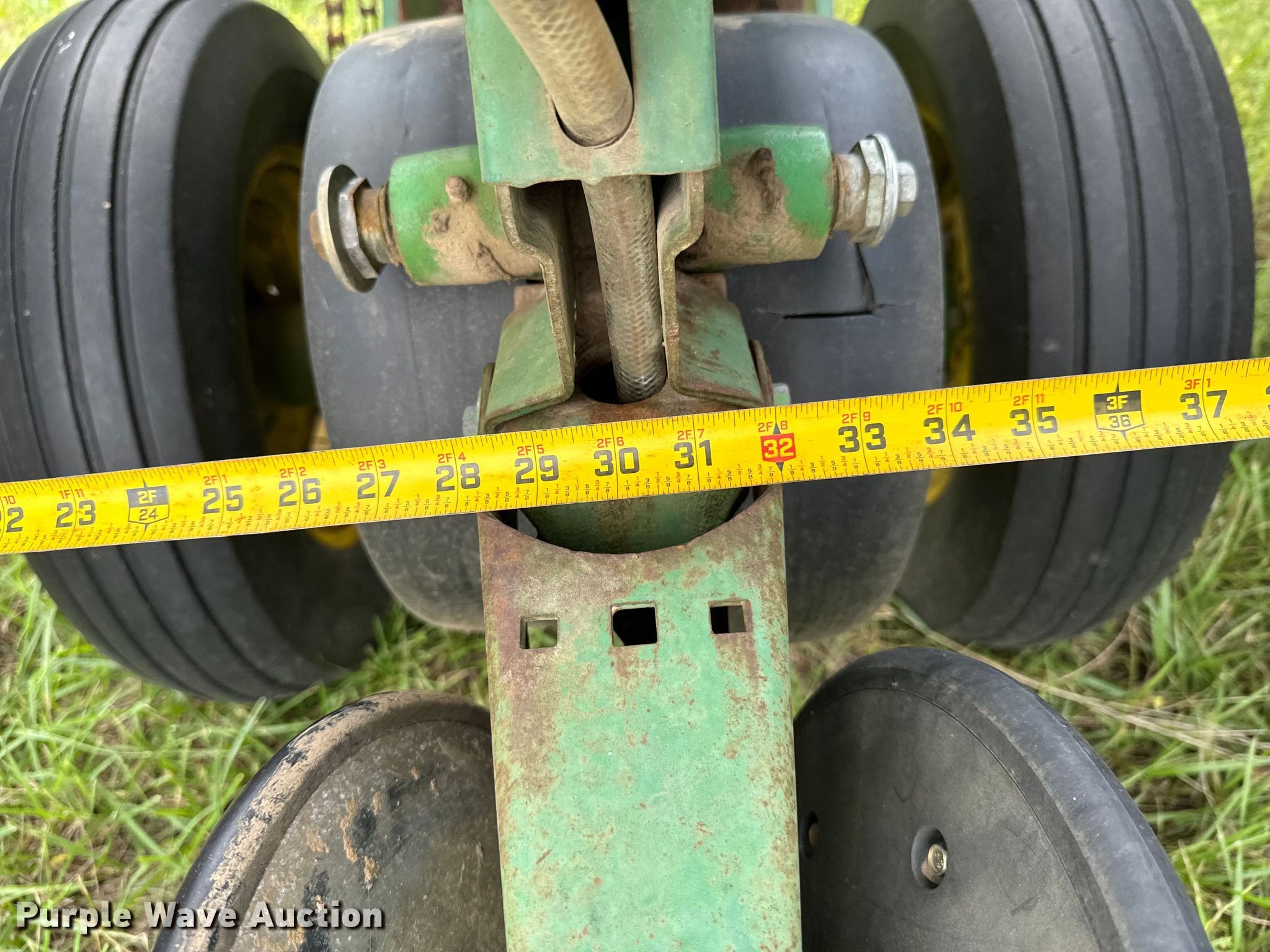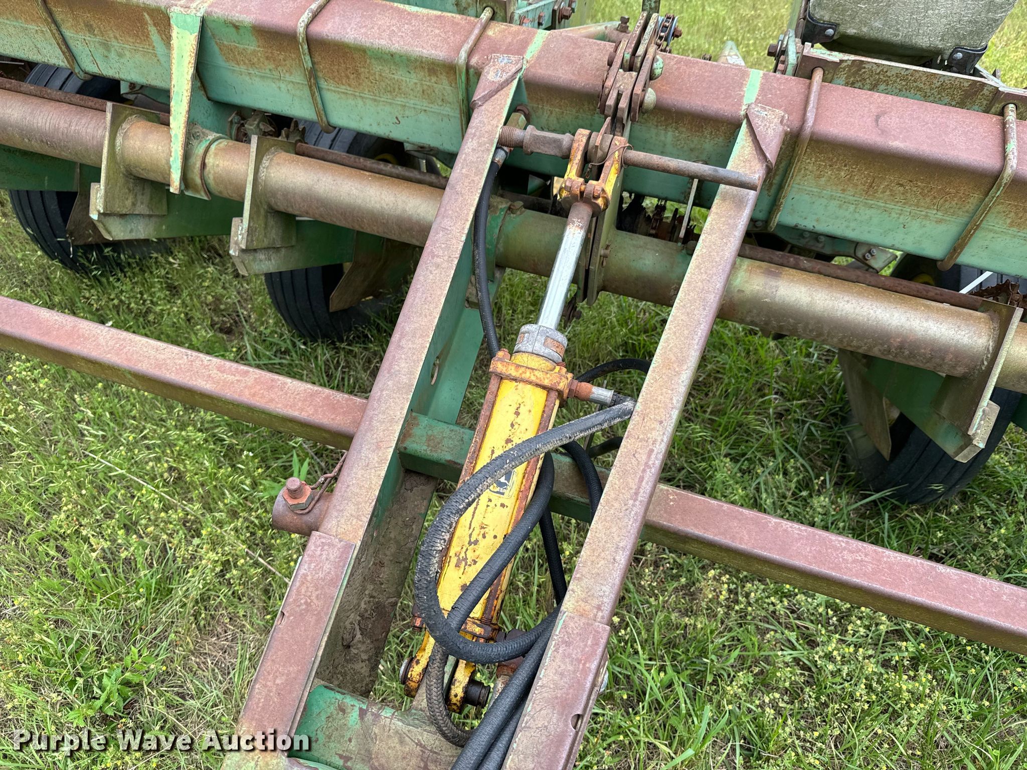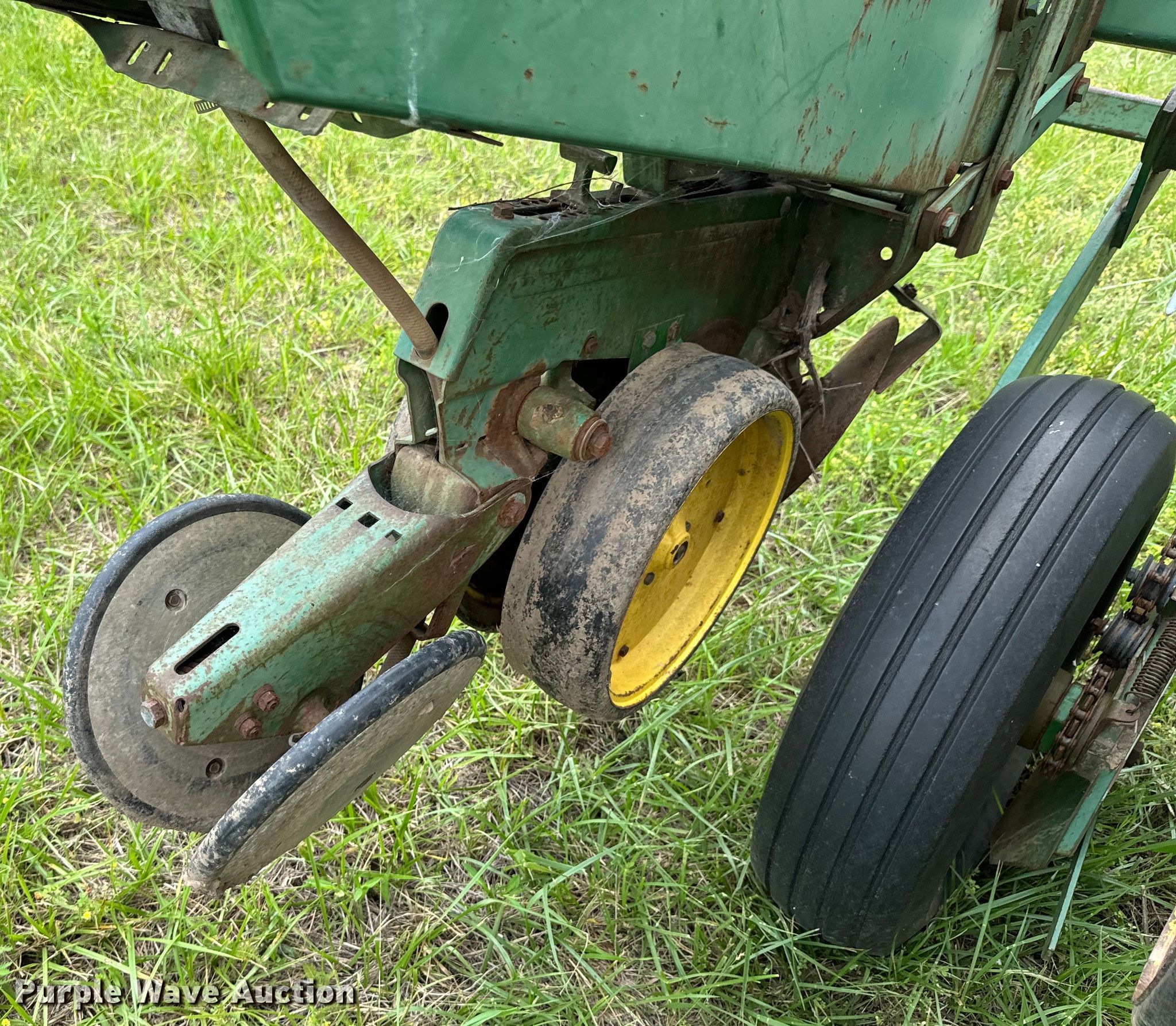 John Deere 7000 planter. Row units: 6, Row spacing: 30", Serial: 123317A. Features Frame Marker arm, Seed delivery Individual seed hoppers, Row units Meter drive: Ground, Down pressure: Hydraulic, Seed firmers, Disk openers: Double, Gauge wheels: Double, Closing system: Double Type: Rubber, Fertilizer/ insecticide Fertilizer, Application method: Seed firmer. Tires Transport tire size: 7.60-15 Quantity: 4. Havana, KS 67347
