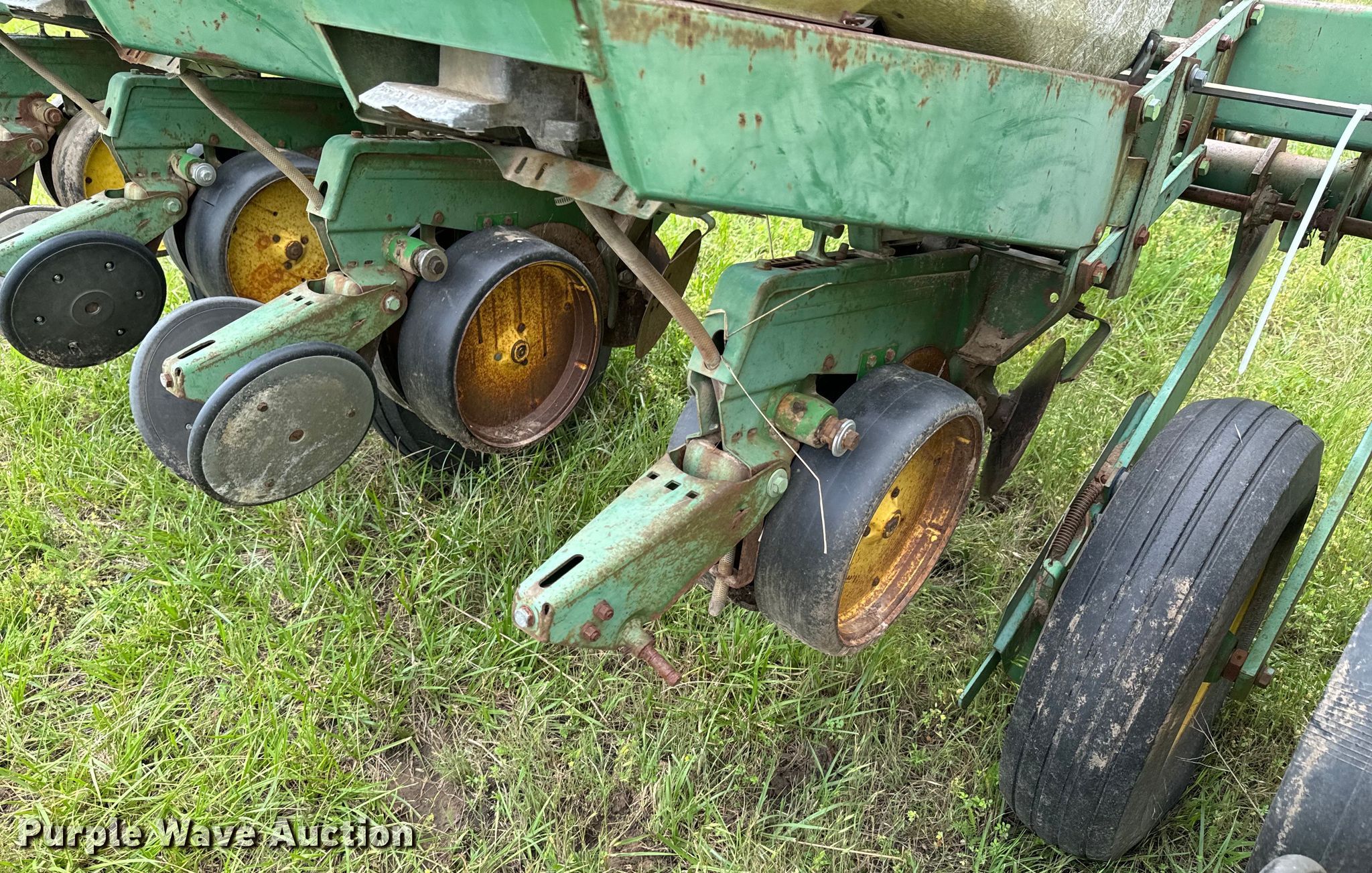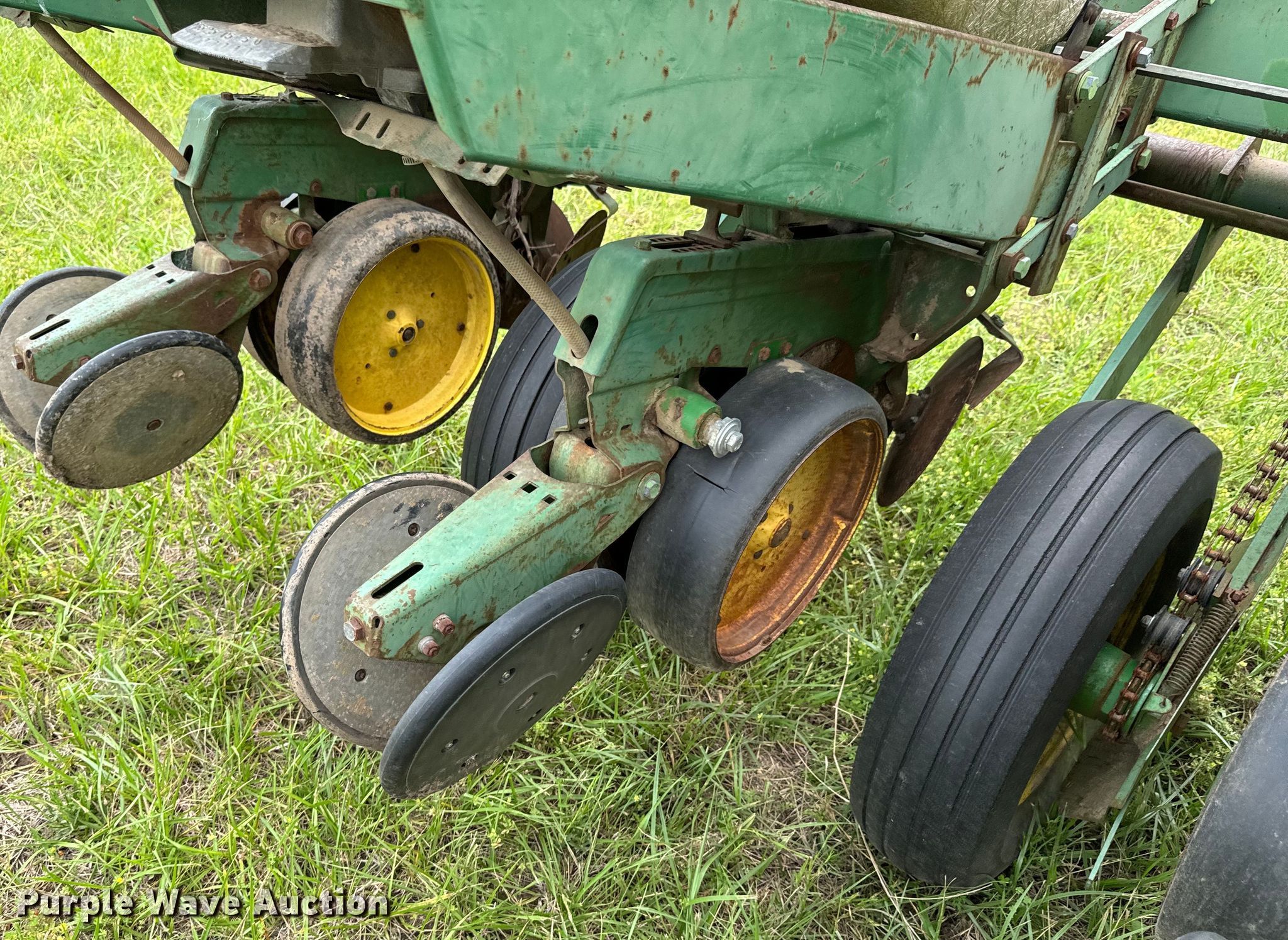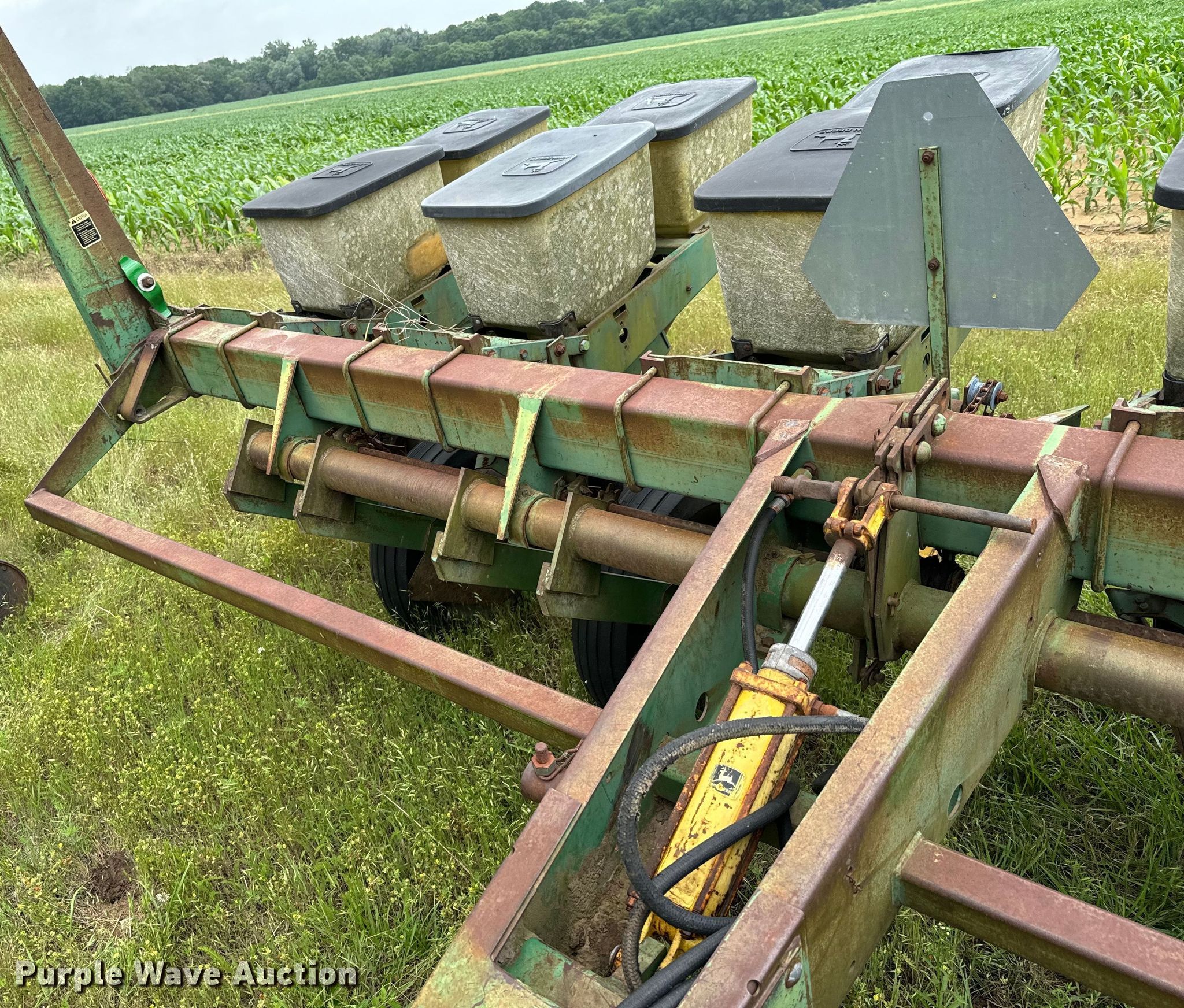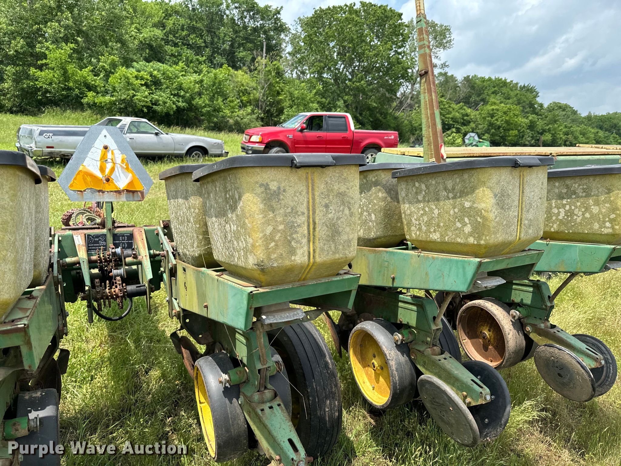John Deere 7000 planter. Row units: 6, Row spacing: 30", Serial: 123317A. Features Frame Marker arm, Seed delivery Individual seed hoppers, Row units Meter drive: Ground, Down pressure: Hydraulic, Seed firmers, Disk openers: Double, Gauge wheels: Double, Closing system: Double Type: Rubber, Fertilizer/ insecticide Fertilizer, Application method: Seed firmer. Tires Transport tire size: 7.60-15 Quantity: 4. Havana, KS 67347
