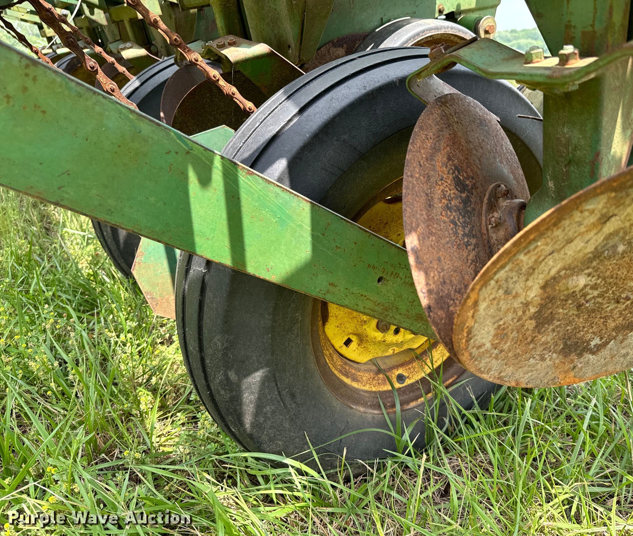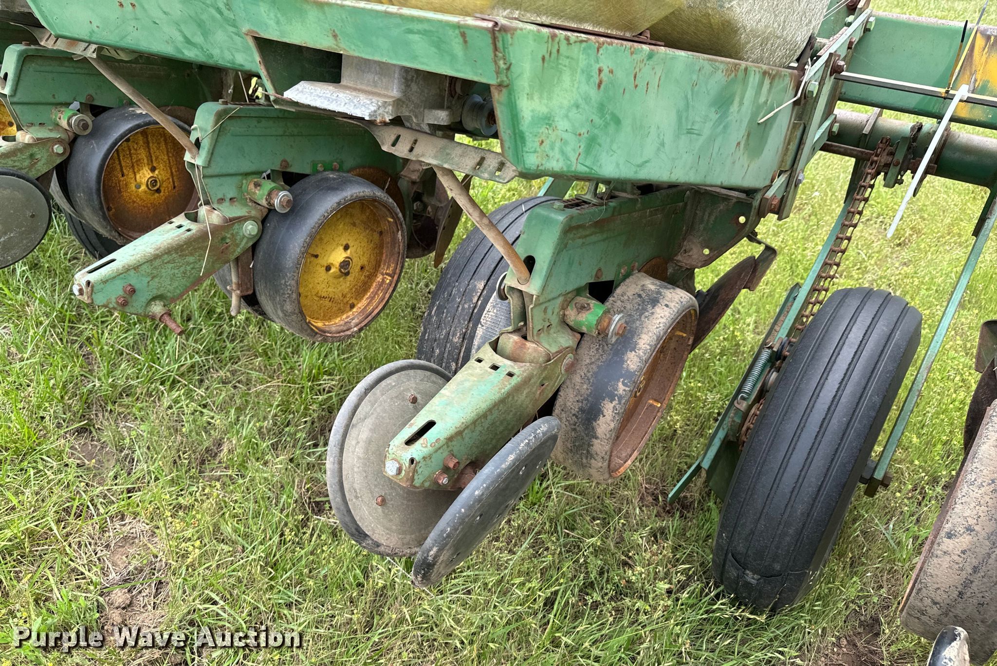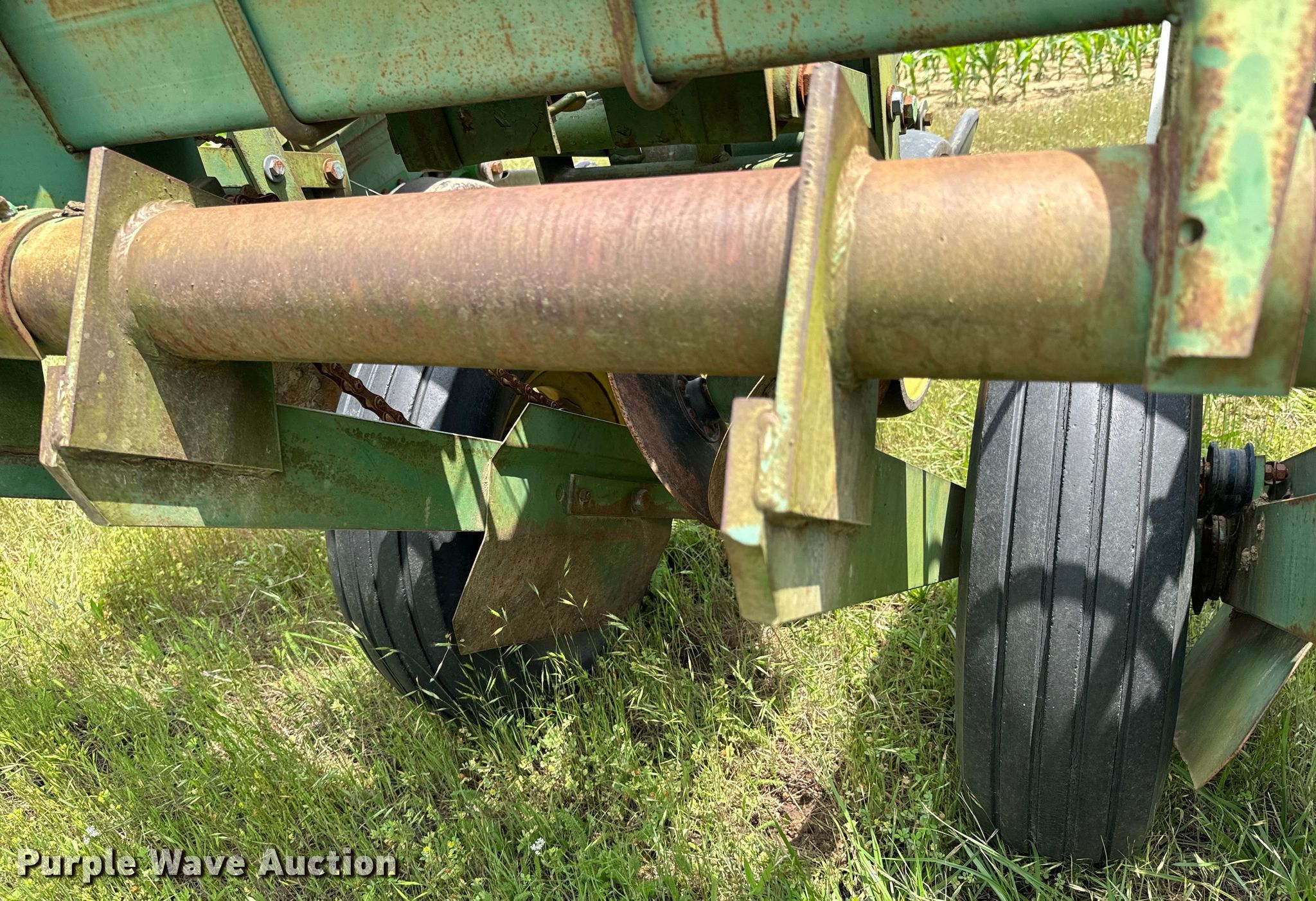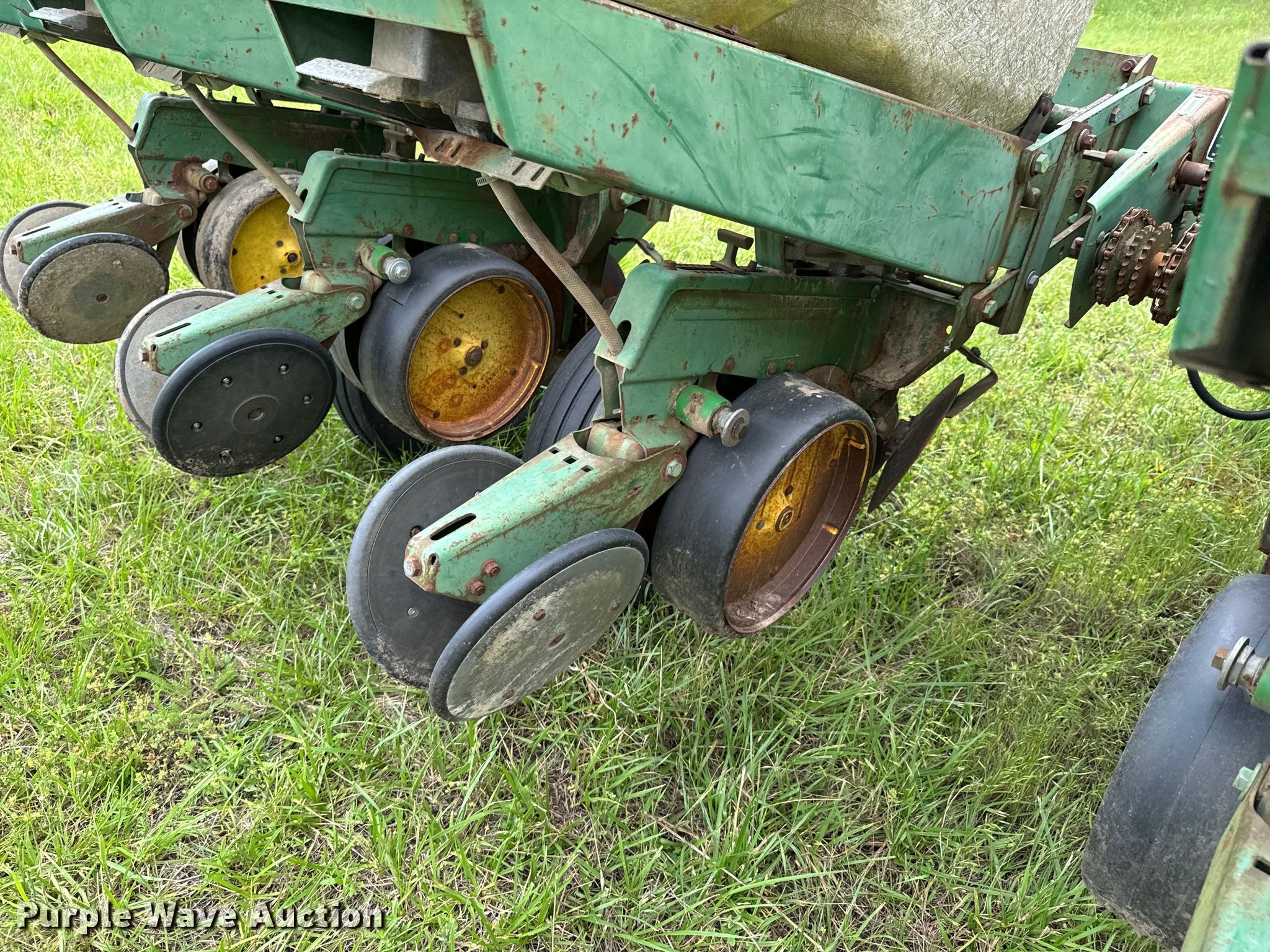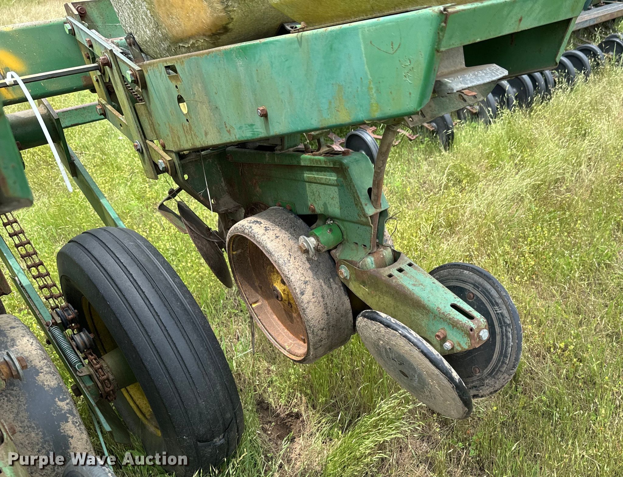 John Deere 7000 planter. Row units: 6, Row spacing: 30", Serial: 123317A. Features Frame Marker arm, Seed delivery Individual seed hoppers, Row units Meter drive: Ground, Down pressure: Hydraulic, Seed firmers, Disk openers: Double, Gauge wheels: Double, Closing system: Double Type: Rubber, Fertilizer/ insecticide Fertilizer, Application method: Seed firmer. Tires Transport tire size: 7.60-15 Quantity: 4. Havana, KS 67347