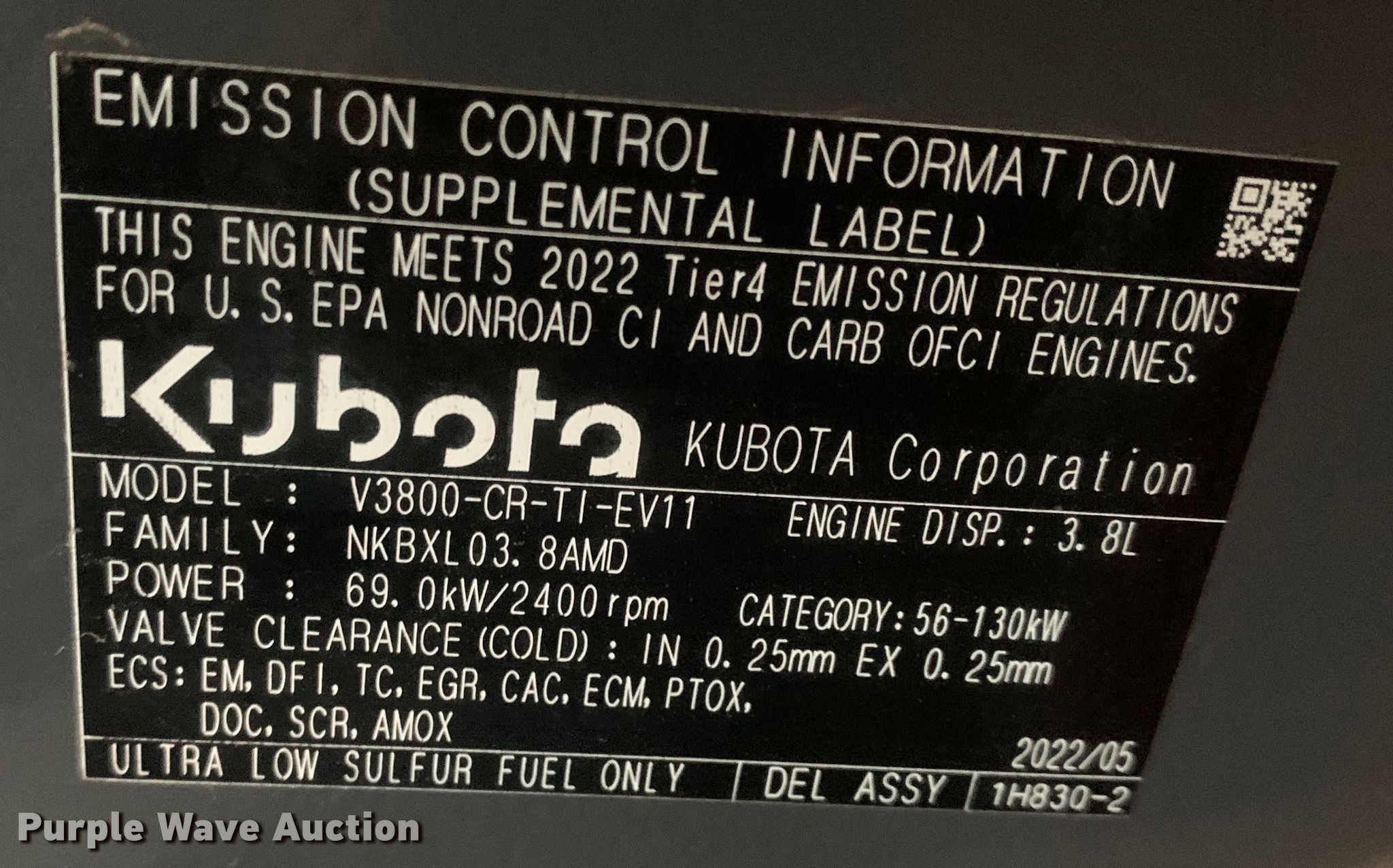 2022 Kubota M5-092 Narrow MFWD tractor. Hours: 9 on meter, Serial: KBUUDKDMJN8F70001. Engine Kubota V3800-CR-T1-EV11, Displacement: 3.8L, Cylinders: 4, Fuel type: Diesel. Transmission Synchro, 24F - 24R, Left-hand reverser, Differential lock. Features PTO: 540, Three point Top link, Seven pin outlet, Hydraulic remote sets Rear: 2. Tires Front: 9.5-16, Rear: 380/85R24. Notes No manufacturer's warranty. Kubota Tractor Corp. Grapevine, TX 76051