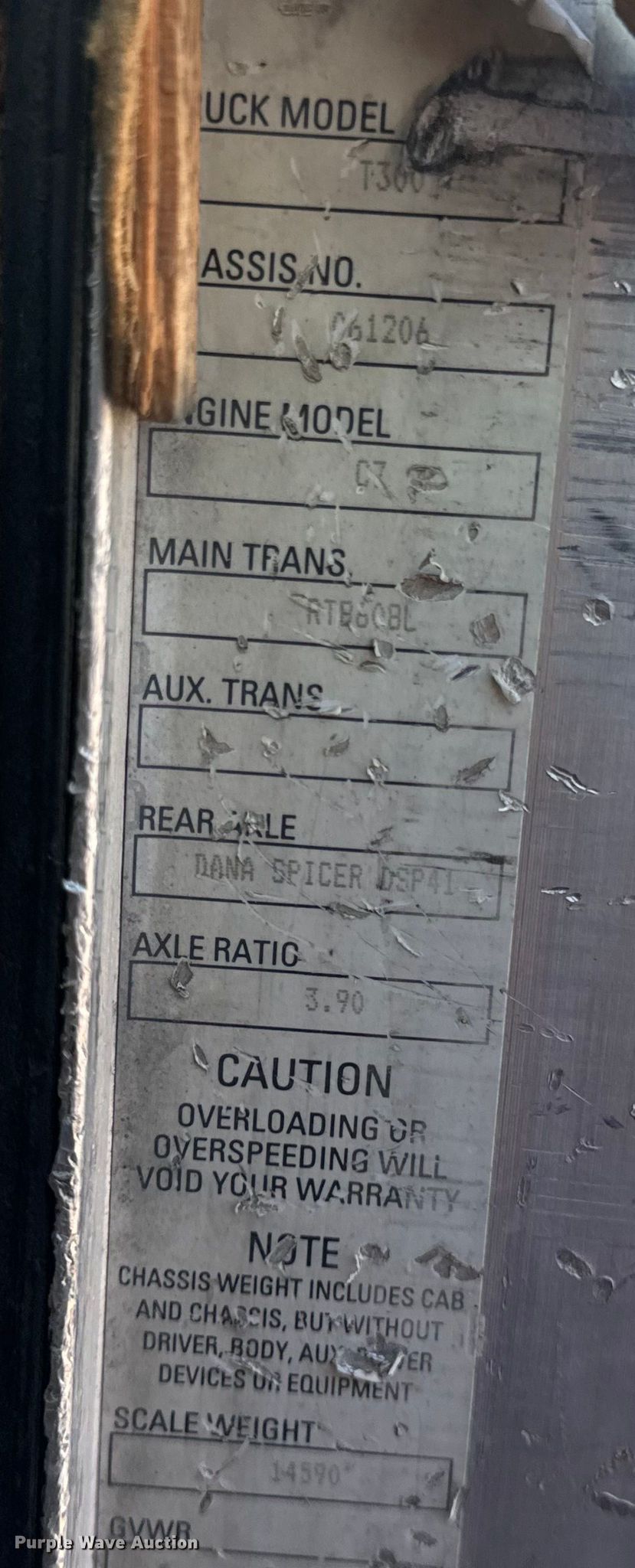 2004 Kenworth T300 dump flatbed truck. Miles: 348,727 on odometer, VIN: 2NKMLD9X54M061206. Engine Caterpillar C7 Acert, Serial: 64117F024, Displacement: 7.2L, Cylinders: 6, Fuel type: Diesel, Engine brake. Transmission Manual, Speed: 8. Chassis Axles: Tandem, Suspension: Spring over walking beam, Brakes: Air, PTO, Wet kit, GVWR: 54,600 lbs. Interior AC, Heat, Heated mirrors, Cruise control. Features Dump flatbed 19' 7" L x 102" W, Ram: Double. Tires Size: 11R22.5. Notes Hydraulic leak. Missouri title. Title distribution may be delayed up to 14 days from verification of funds. Mead Lumber. Grandview, MO 64030