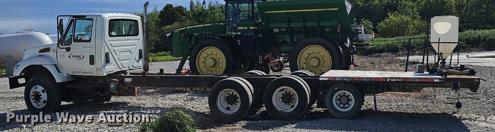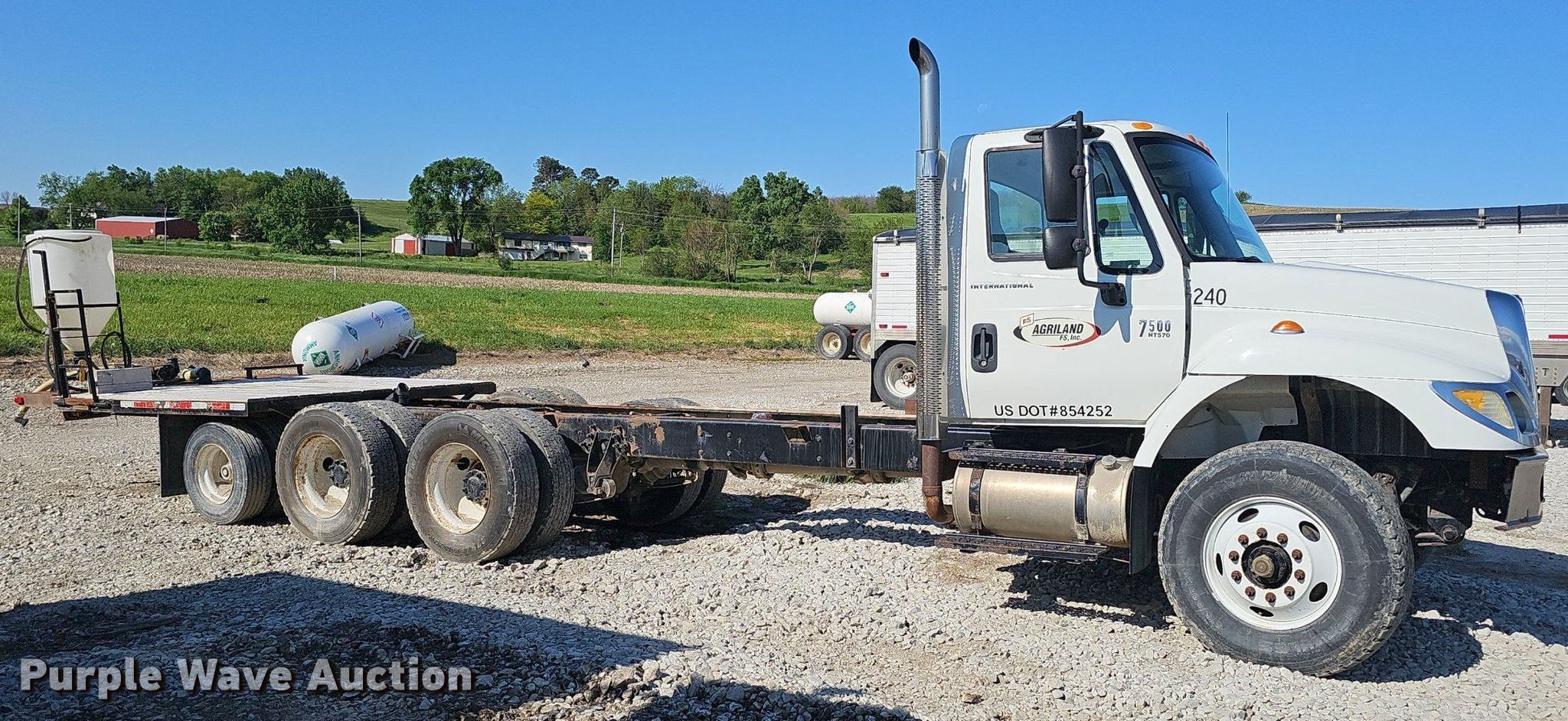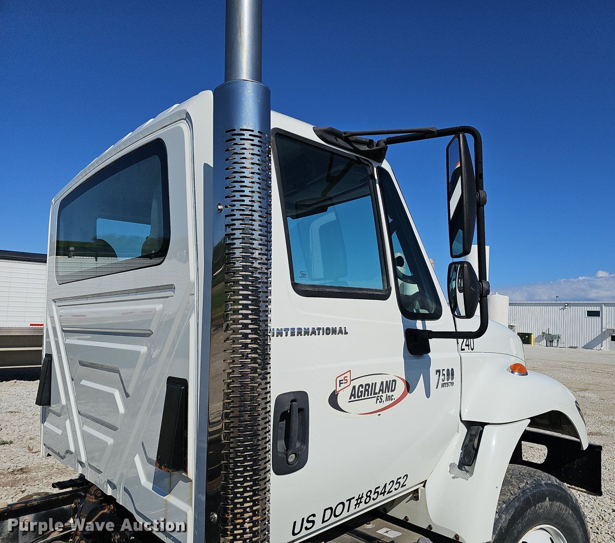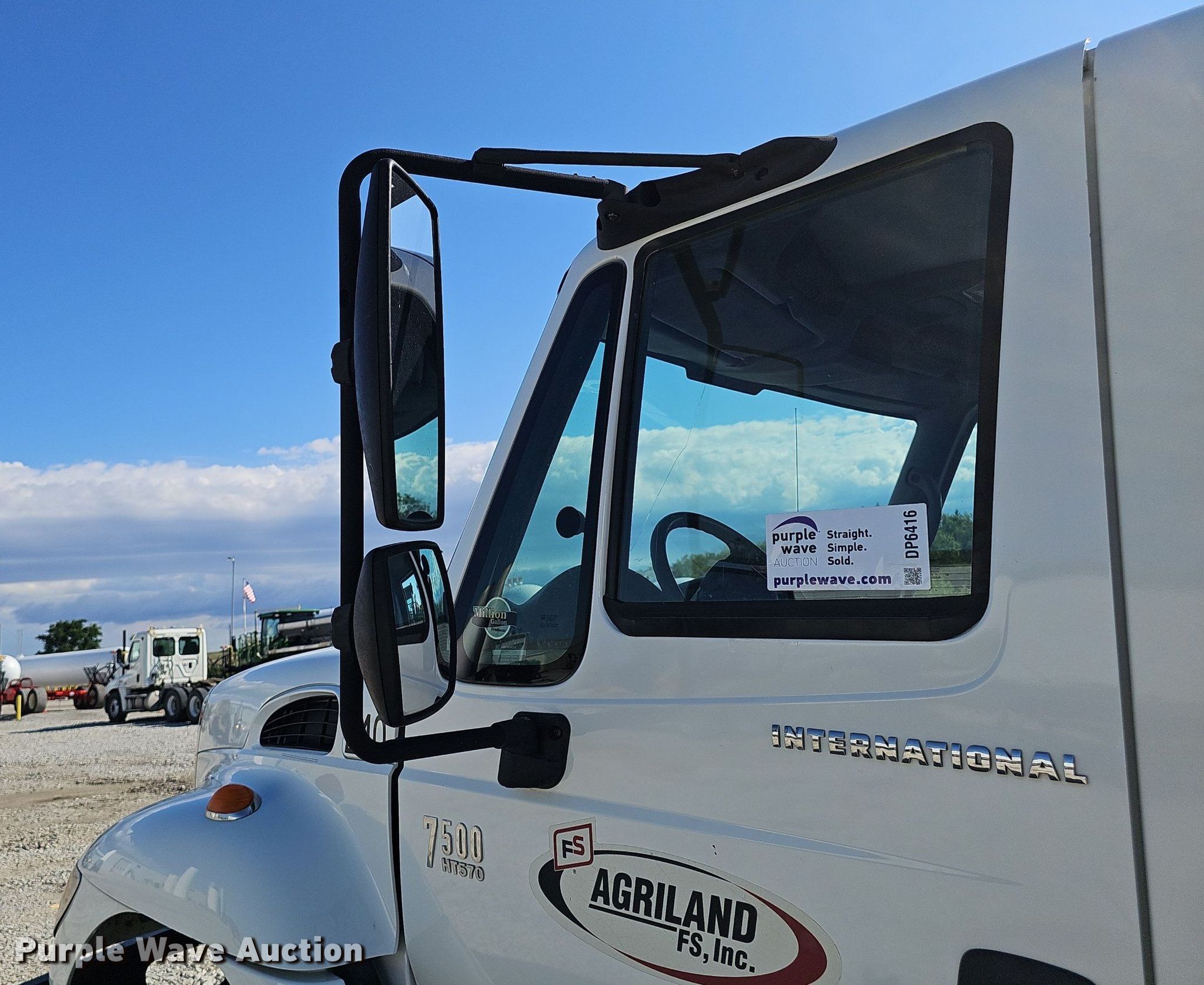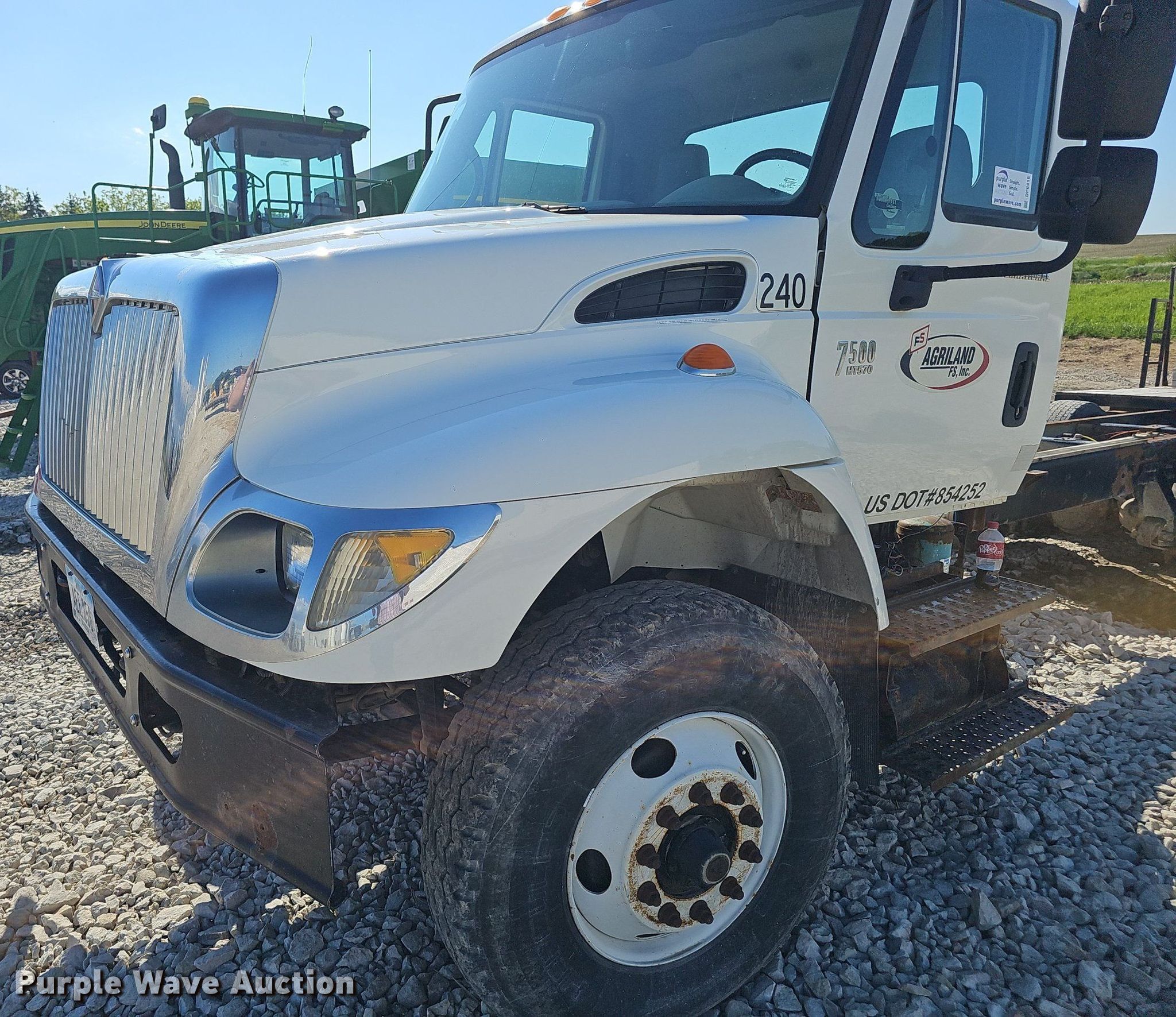 2007 International 7500 truck cab and chassis. Miles: 211,219 on odometer, VIN: 1HTWNAZT37J462994. Engine International HT570, Displacement: 9.3L, Cylinders: 6, Fuel type: Diesel. Transmission Eaton Fuller, Manual, Speed: 10. Chassis Axles: Triple, Tag axle, Differential lock: Inter-axle, Suspension: Air Dump valves, Brakes: Air, Truck chassis: 338", GVWR: 56,000 lbs FAWR: 16,000 lbs, IAWR: 20,000 lbs, RAWR: 20,000 lbs, Wheelbase: 228". Interior AC, Heat, Heated mirrors, Cruise control, Air ride cab. Features Deck 10' 2" L x 96" W, Poly tank Capacity: 50 gallons, Outlet: 3.5". Tires Front: 315/80R22.5, Rear: 295/75R22.5 & 275/80R22.5, Lift axle: 235/75R17.5. Notes Windshield chipped or cracked, Dead battery. Iowa title. Agriland FS. Hamlin, IA 50117