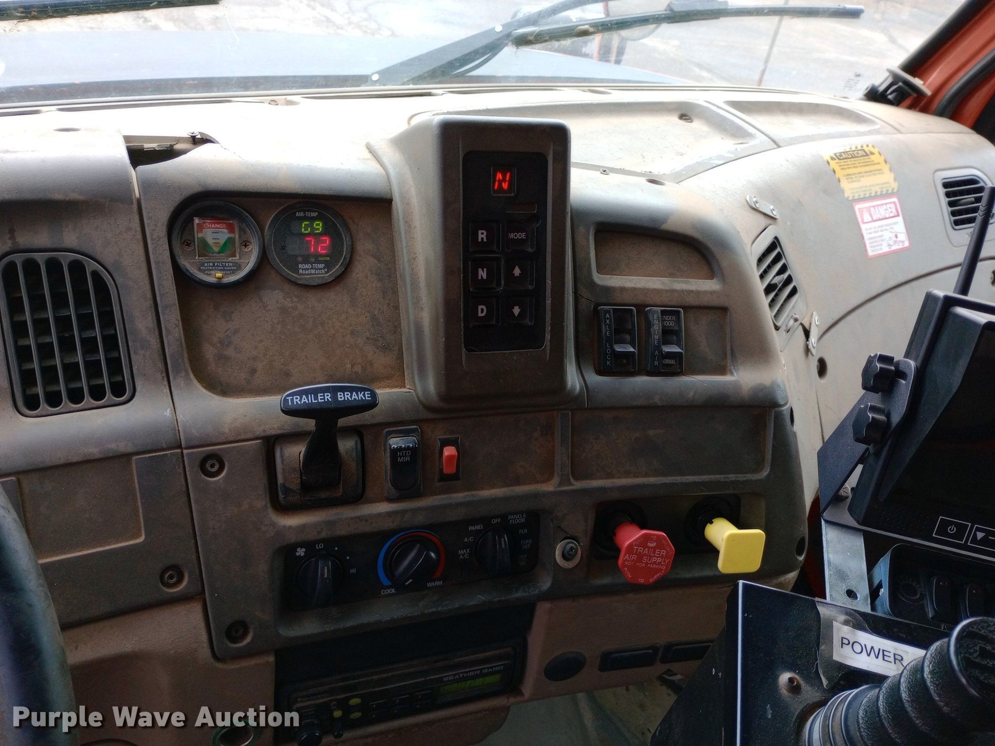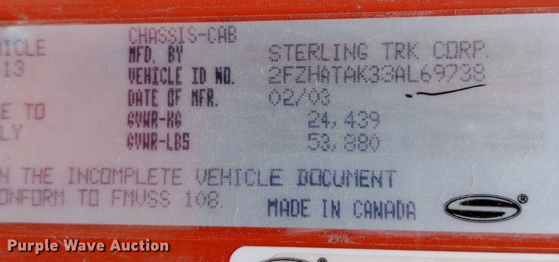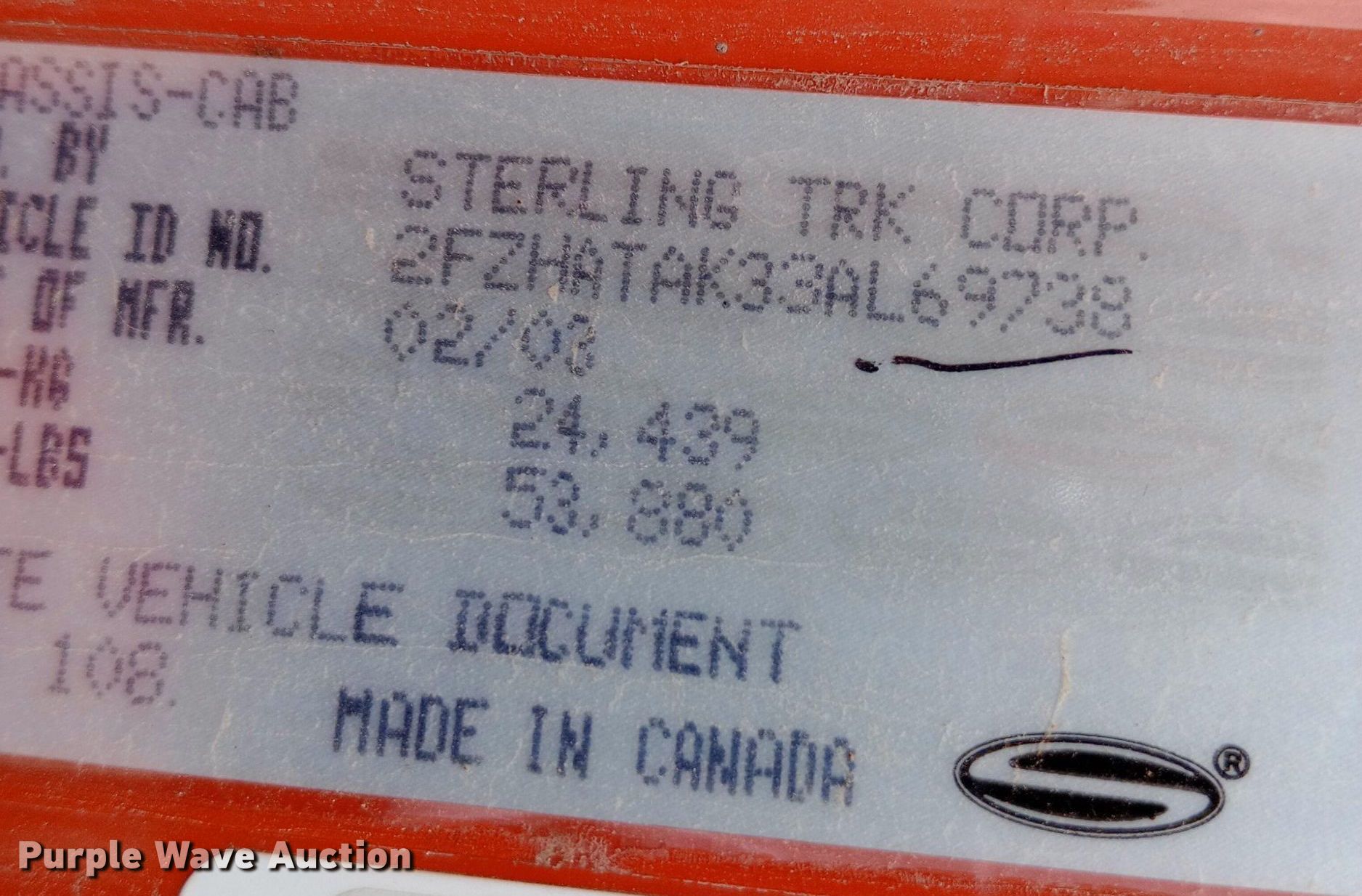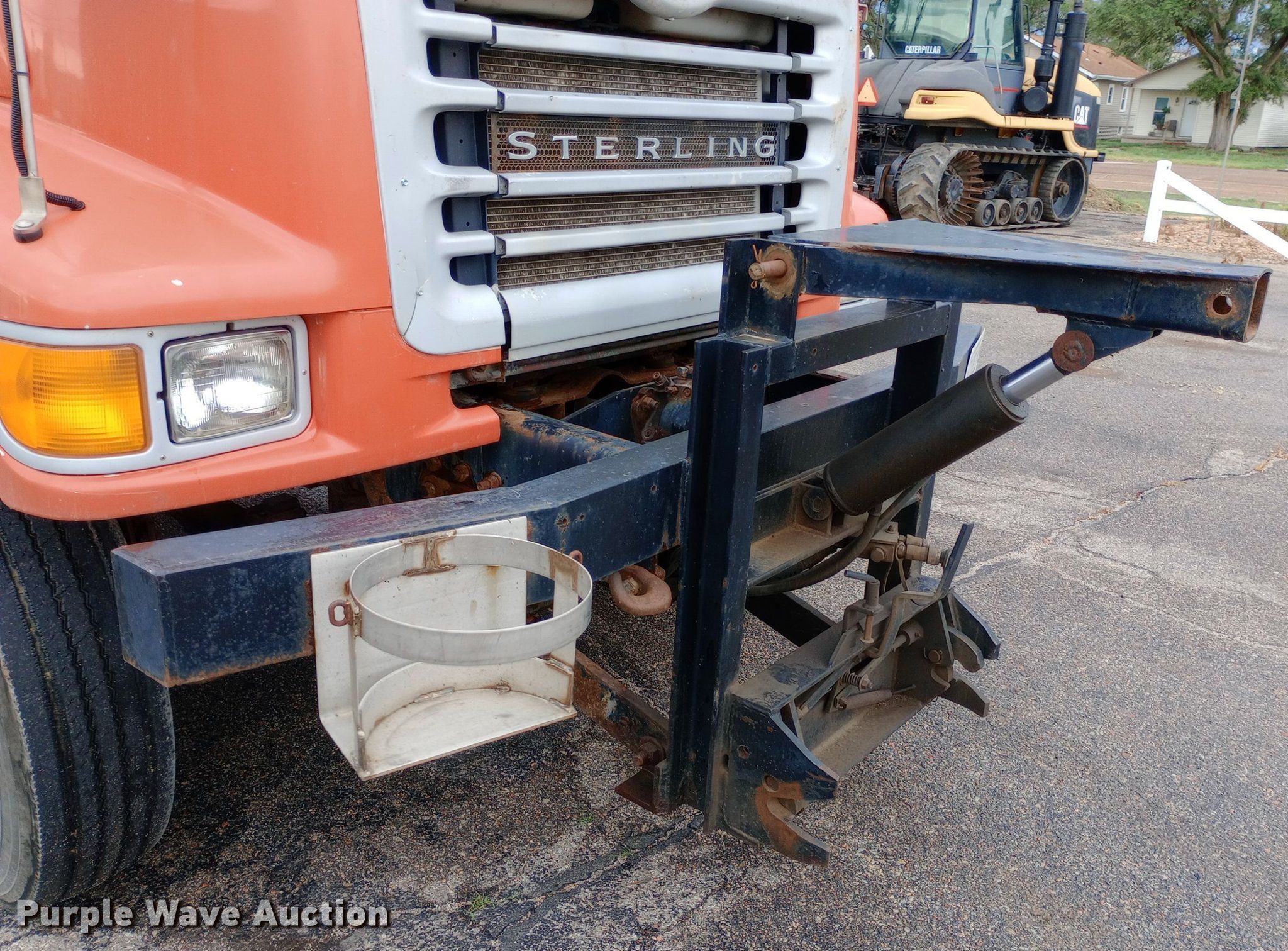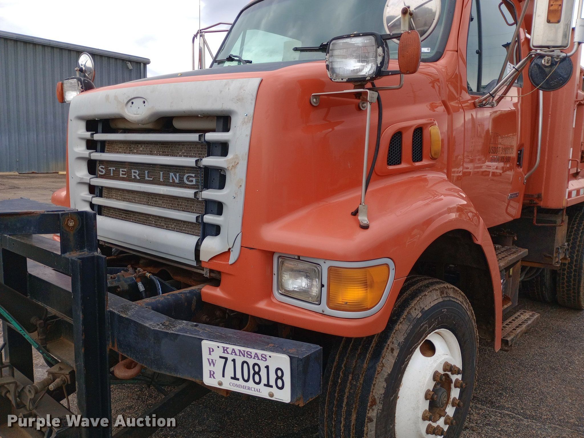 2003 Sterling LT7500 dump truck. Miles: 194,991 on odometer, Hours: 10,155 on meter, VIN: 2FZHATAK33AL69738. Engine Caterpillar 3126, Cylinders: 6, Fuel type: Diesel. Transmission Automatic. Chassis Axles: Tandem, Suspension: Spring, Brakes: Air, PTO, Front mount PTO, GVWR: 53,880 lbs FAWR: 13,880 lbs, IAWR: 20,000 lbs, RAWR: 20,000 lbs. Interior AC, Heat, Cruise control. Features Dump bed Monroe, Capacity: 9 cu.yd., 13' L x 96" W, Side height: 44", Bed type: Steel, Ram: Single, End gate: Air operated, Spreader Monroe, Capacity: 9 cu.yd., Plow Width: 132". Tires Front: 275/80R22.5, Rear: 295/75R22.5. Notes Dash warning indicator: ABS, Battery. Kansas title. Mitzners Bobcat & Trenching. South Hutchinson, KS 67505