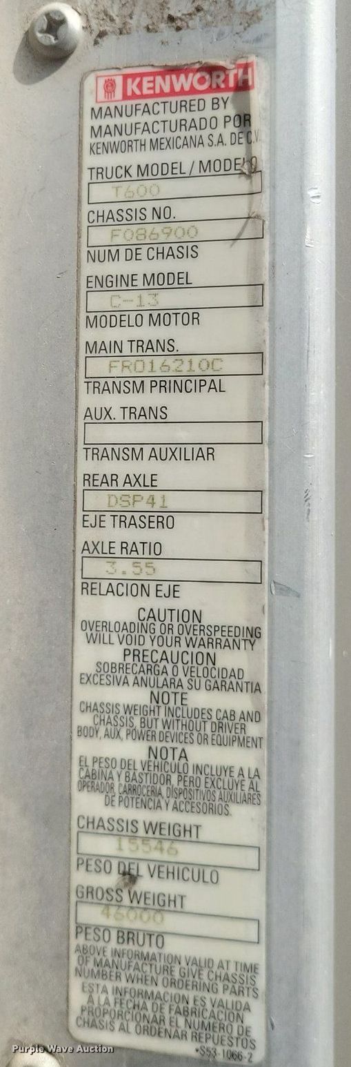 2005 Kenworth T600 Aerocab semi truck. Miles: 263,856 on odometer Actual mileage unknown, Hours: 5,167 on meter, VIN: 3WKADU8X85F086900, Unit #: 60. Engine Caterpillar C12, Cylinders: 6, Fuel type: Diesel, HP: 445, kW: 332, Engine brake. Transmission Eaton Fuller, Manual, Speed: 10. Chassis Axles: Tandem, Differential lock: Inter-axle, Suspension: Air Dump valves, Brakes: Air, PTO, GVWR: 46,000 lbs FAWR: 12,000 lbs, IAWR: 17,000 lbs, RAWR: 17,000 lbs. Interior AC, Heat, Heated mirrors, Cruise control, Air ride cab, Sleeper Sleeper length: 60", Beds: Single, Rear climate control. Features Deck plate: Aluminum, Fifth wheel type: Air operated, Sliding, Fuel tank: Dual. Tires Size: 11R22.5. Notes Engine replaced with used motor at 263,703 miles on odometer. View repairs. Missouri title. NJB Leasing, LLC. Perryville, MO 63775