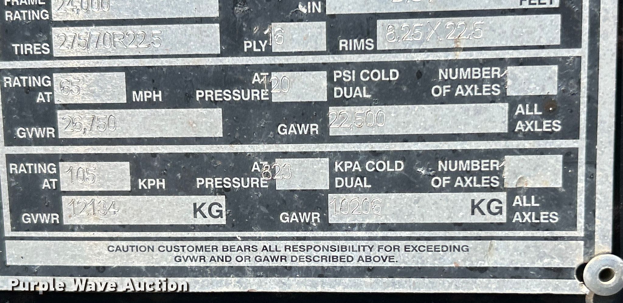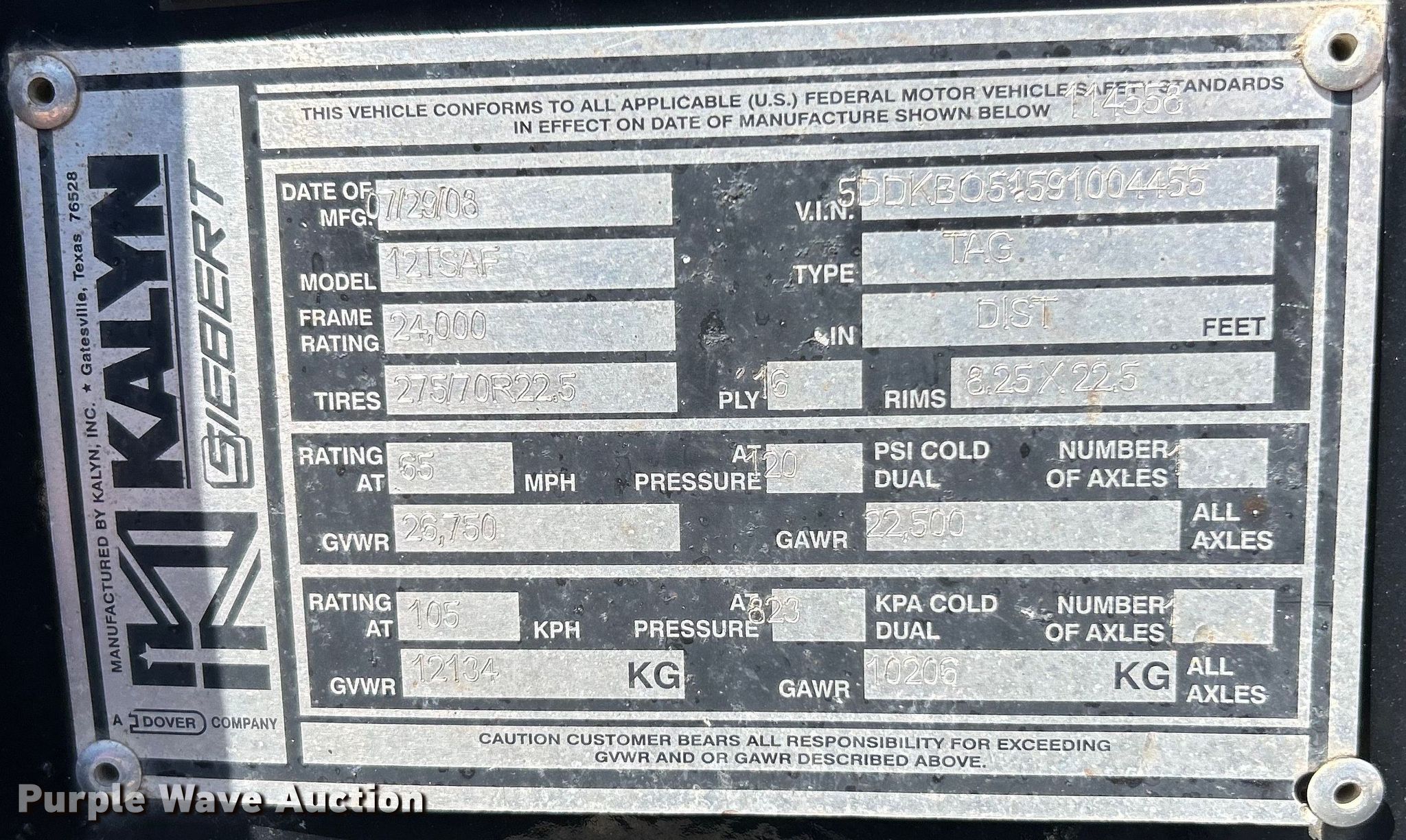 2009 Kalyn Siebert 12TSAF detachable tag axle. VIN: 5DDKB051591004455. Dimensions Overall: 14' L x 102" W. Chassis Landing gear: Single, Suspension: Air, Brakes: Air, GVWR: 26,750 lbs, GAWR: 22,500 lbs. Features Booster. Tires Steel wheels, Size: 275/70R22.5. Missouri title. Title distribution may be delayed up to 14 days from verification of funds. Titan Truck & Equipment Co. LLC. Overland, MO 63114