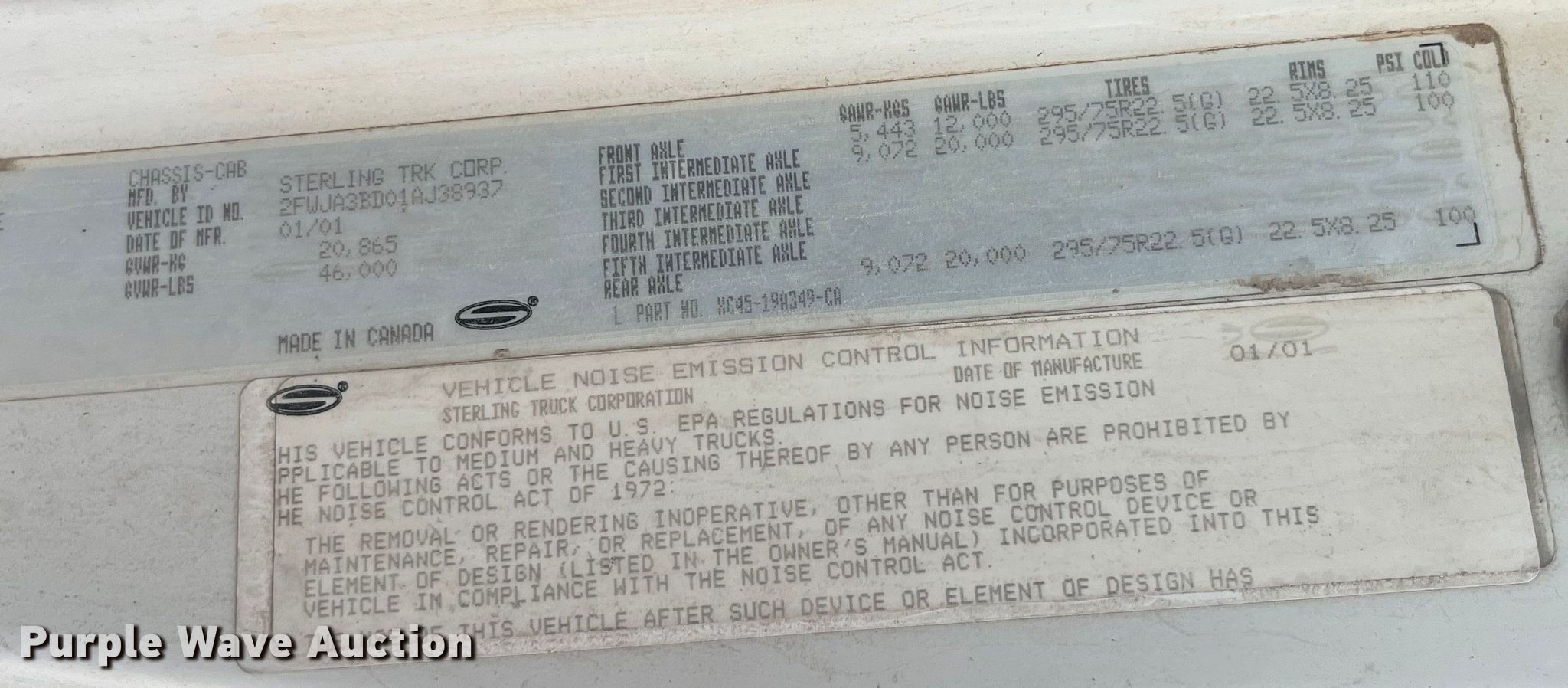 Purple Wave is selling a used Truck Chassis in Iowa. This item is a 2001 Sterling A9500 truck cab and chassis with the following: Miles: 782,802 on odometer, VIN: 2FWJA3BD01AJ38937