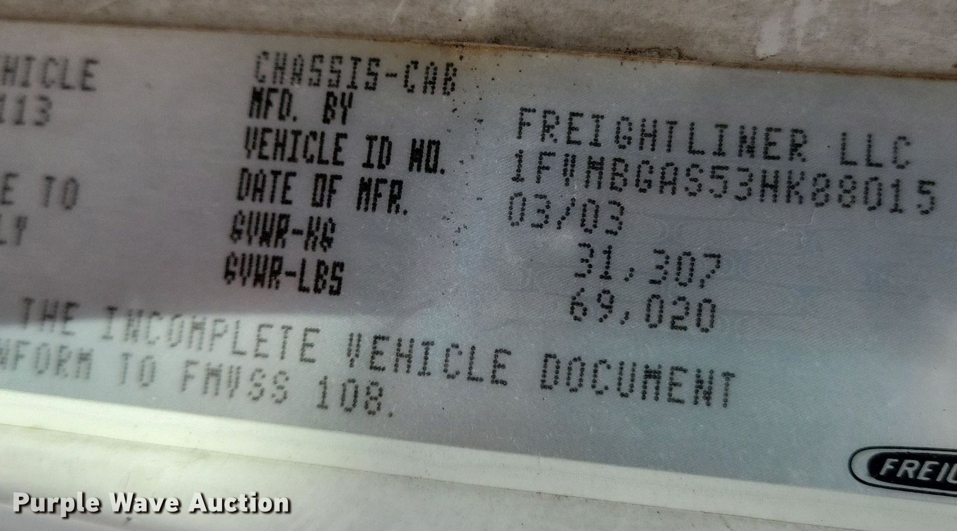Purple Wave is selling a used Truck Chassis in Iowa. This item is a 2003 Freightliner FL112 truck cab and chassis with the following: Miles: Unknown, VIN: 1FVMBGAS53HK88015