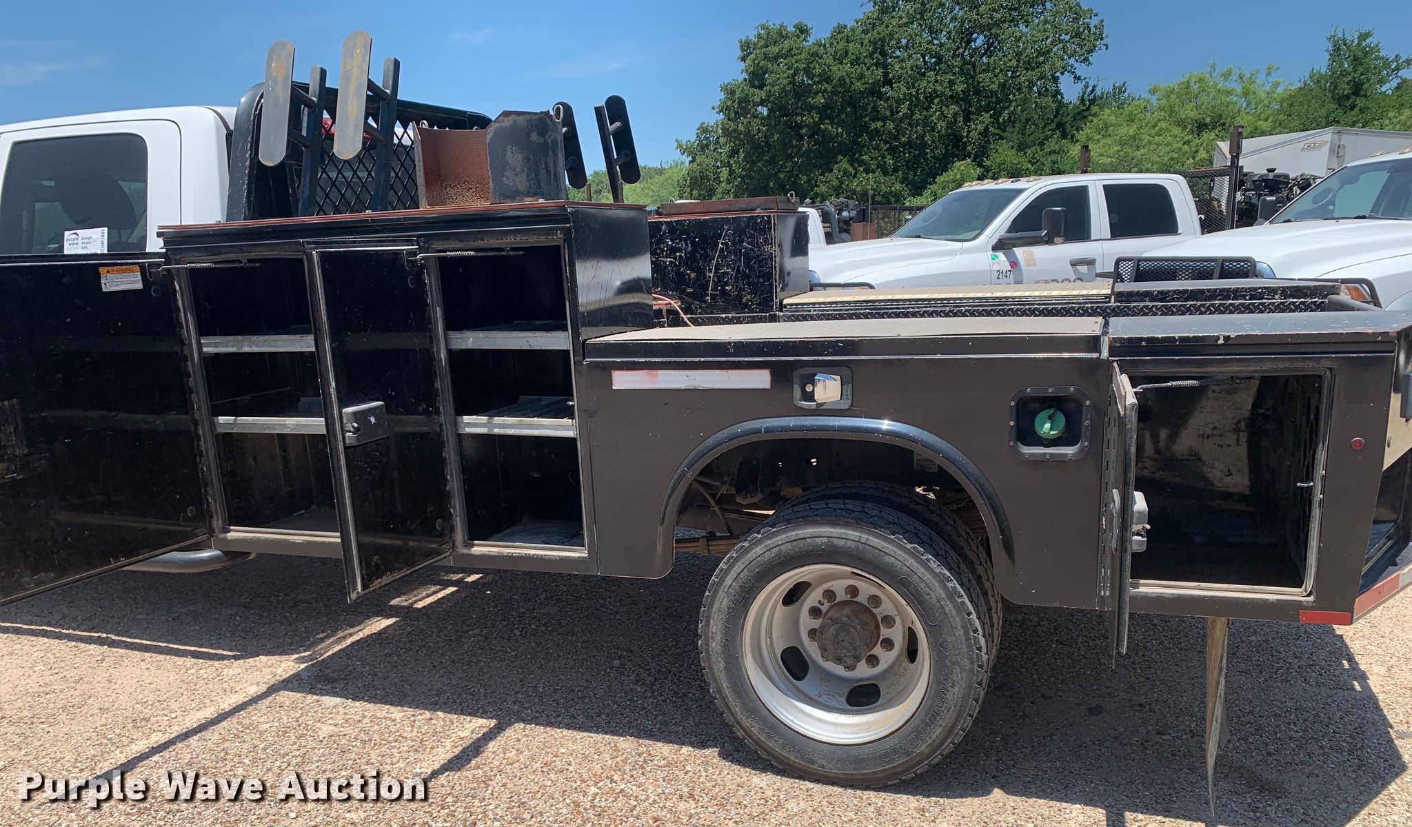 2015 Dodge Ram 5500HD Crew Cab flatbed truck. Miles: 93,568 on odometer, VIN: 3C7WRNFL8FG582726, Unit #: 2161. Engine Displacement: 6.7L, Cylinders: 6, Fuel type: Diesel. Transmission Automatic. Chassis Four wheel drive, Axles: Single, Suspension: Spring, Brakes: Hydraulic, Hitch: Gooseneck, GVWR: 19,500 lbs. Interior AC, Heat, Heated mirrors, Power windows, Power locks, Cruise control, Auxiliary controls, Brake controller. Features Bed Knapheide PGND-116A, 11' 8" L x 8' W, Torch bottle rack Tanks not included.. Tires Size: 225/70R19.5. Texas title. ROC Service. Cleburne, TX 76033
