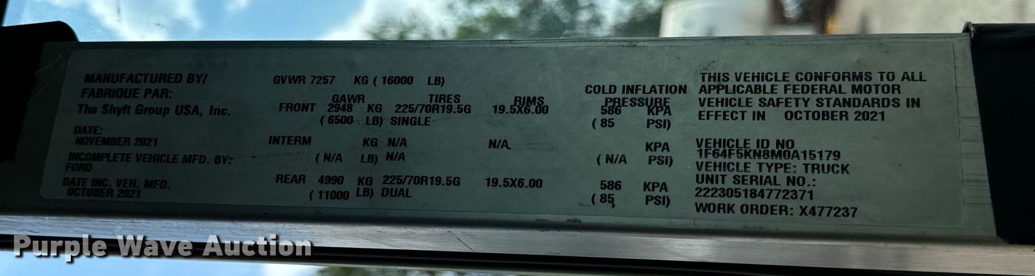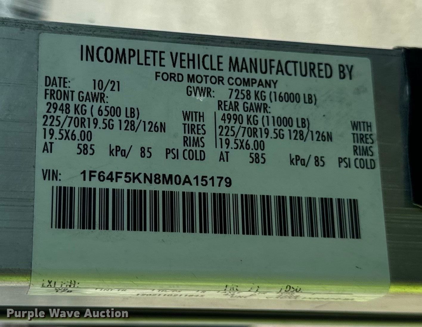 2021 Ford F59 delivery truck. Miles: 41,111 on odometer, VIN: 1F64F5KN8M0A15179, Unit #: 56220374X. Engine Displacement: 7.3L, Cylinders: 8, Fuel type: Gas. Transmission Automatic. Chassis Axles: Single, Suspension: Spring, Brakes: Hydraulic, GVWR: 16,000 lbs, Wheelbase: 178". Interior AC, Heat, Cruise control. Features Box bed 18.5' L x 96" W x 99" H, Floor: Aluminum. Tires Size: 225/70R19.5. Notes Decals will be removed prior to auction. Lender owned. Item condition and history are unknown. No additional information is available. Title will be distributed after confirmation of payment and removal. Michigan title. Davison, MI 48423