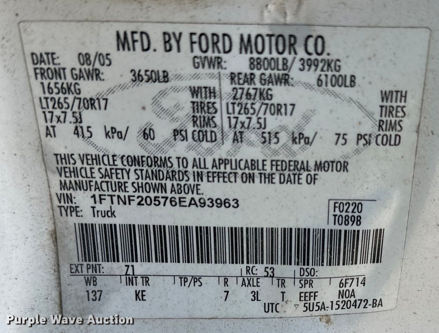 2006 Ford F250 Super Duty XL utility bed pickup truck. Miles: 287,188 on odometer, VIN: 1FTNF20576EA93963. Engine Displacement: 5.4L V8 SOHC, Cylinders: 8, Fuel type: Gas. Transmission Automatic. Interior AC, Heat. Tires Size: LT265/70R17. Notes Dash warning indicator: Check engine, Battery. Kansas title. Title distribution may be delayed up to 14 days from verification of funds. Industrial Maintenance Inc.. Topeka, KS 66618