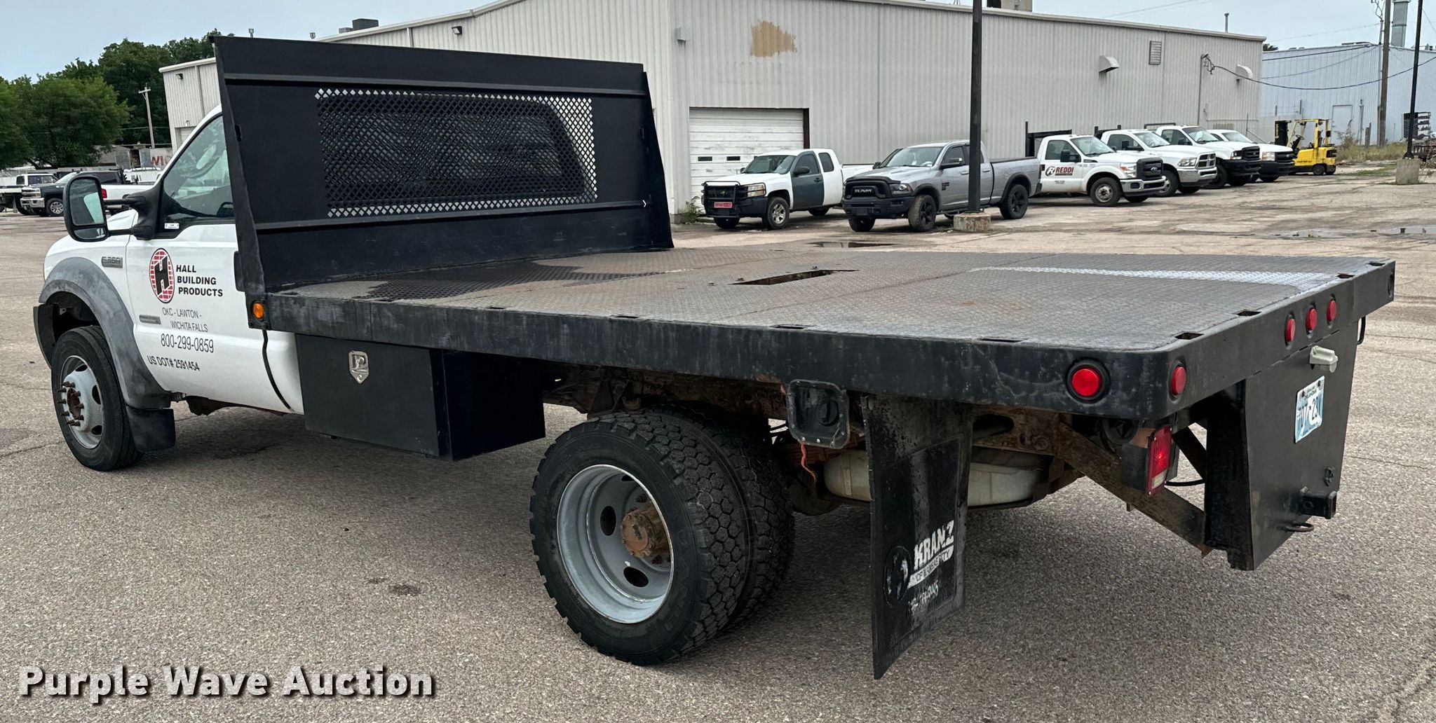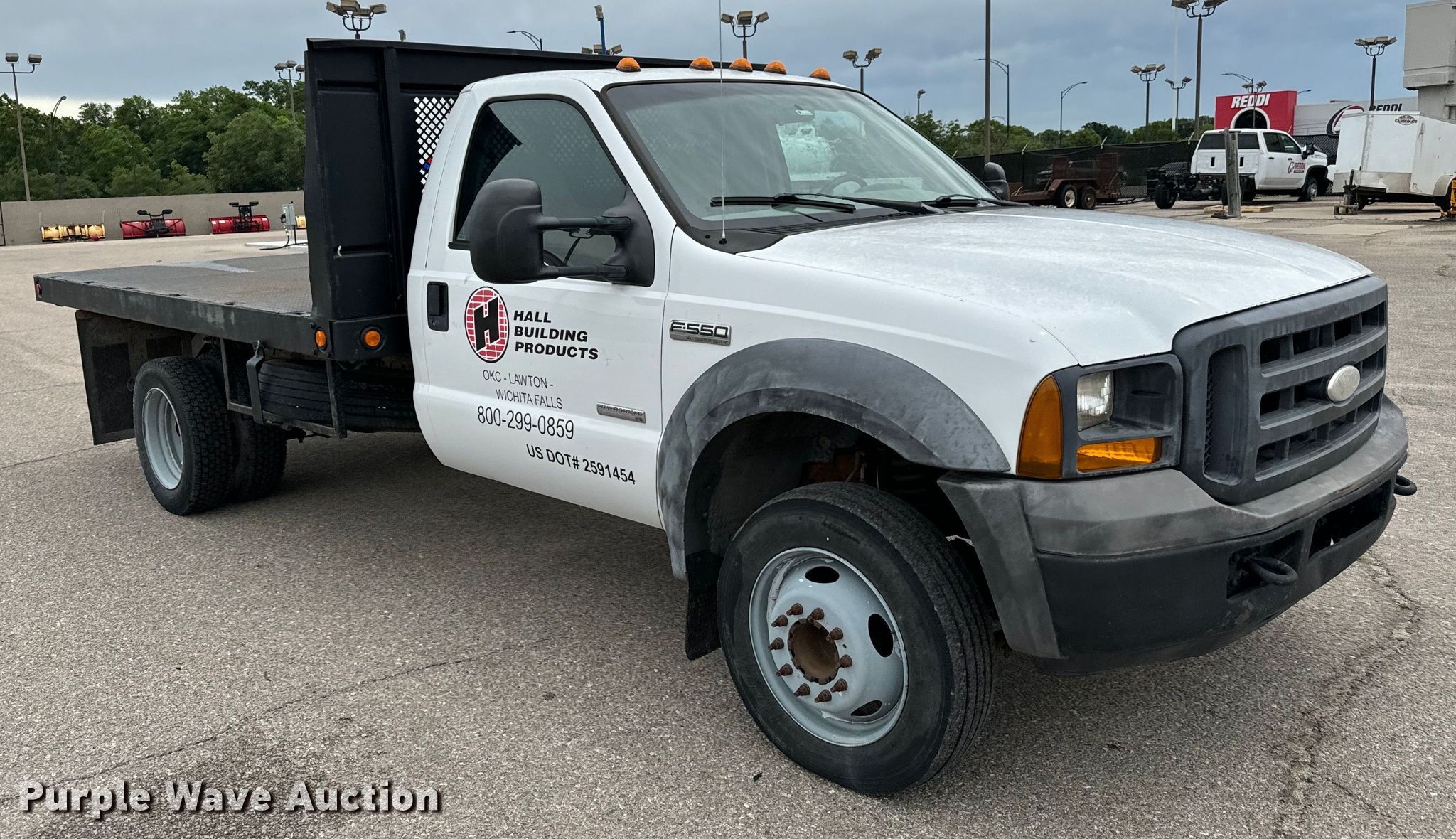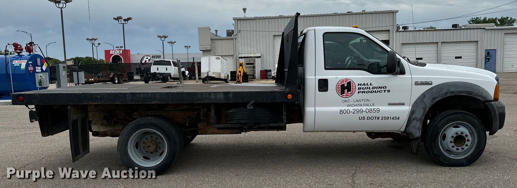 2005 Ford F550 flatbed truck. Miles: 159,602 on odometer, VIN: 1FDAF56PX5EC34558. Engine Displacement: 6.0L, Cylinders: 8, Fuel type: Diesel. Transmission Automatic. Chassis Axles: Single, Suspension: Spring, Brakes: Hydraulic. Interior AC, Heat, Cruise control, Auxiliary controls, Brake controller. Features Flatbed 12' 4" L x 96" W. Tires Size: 225/70R19.5. Notes Windshield chipped or cracked, Possible coolant issues , Batteries not included, Decals will be removed prior to auction. Oklahoma title. Title distribution may be delayed up to 14 days from verification of funds. Reddi Industries. Wichita, KS 67218