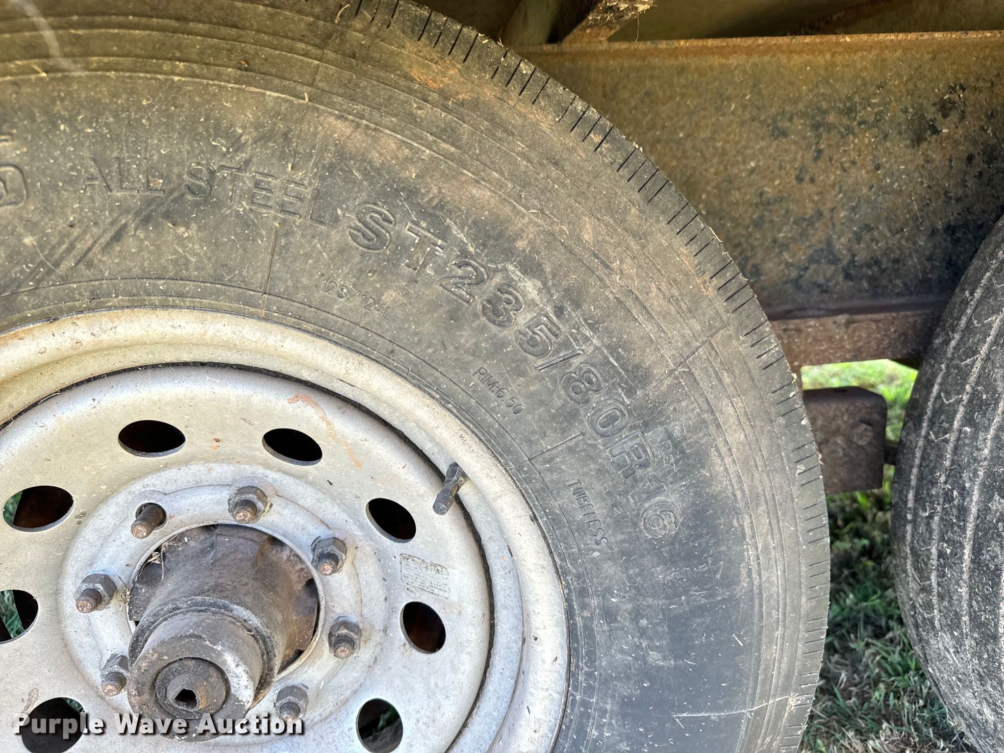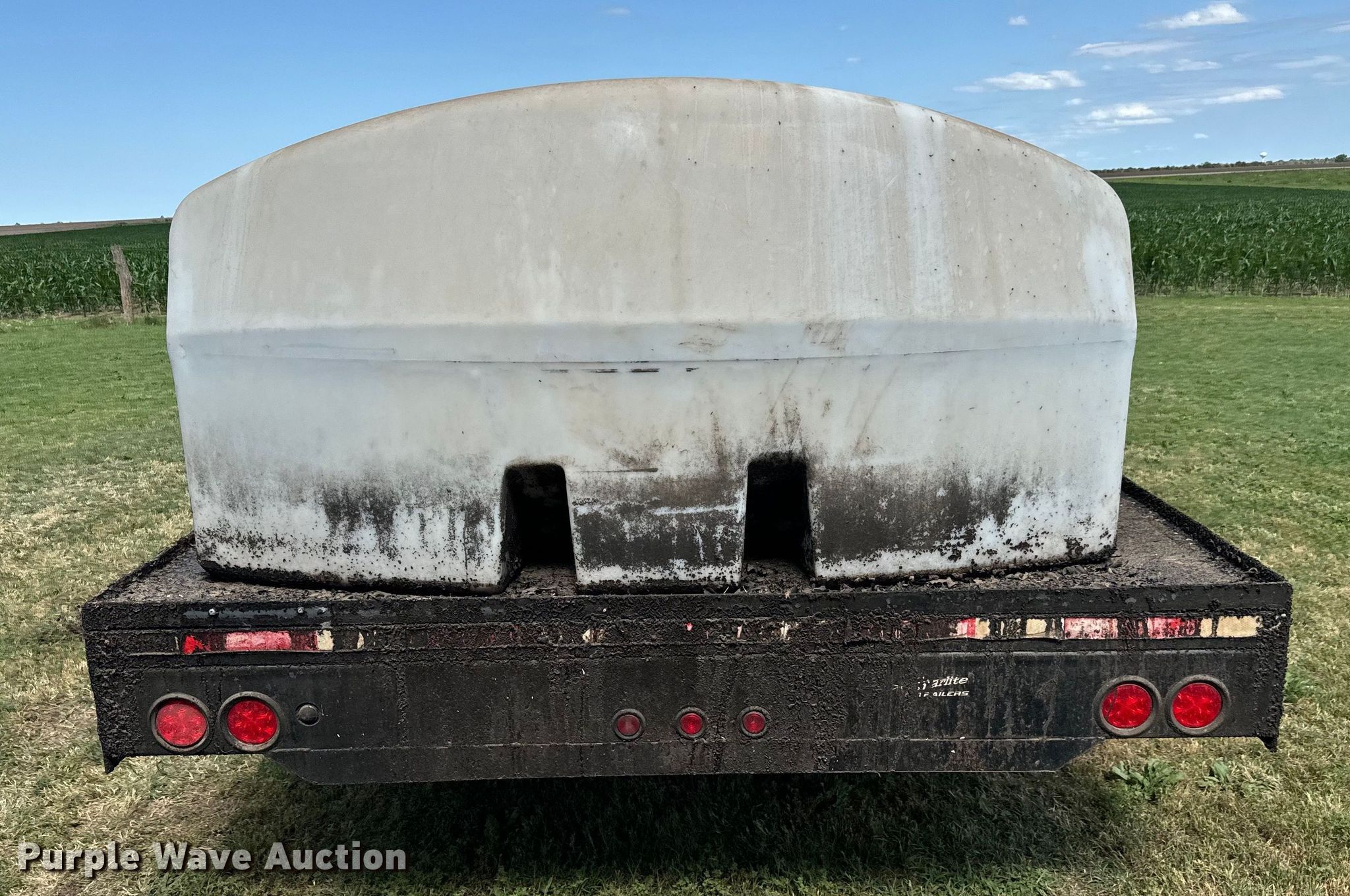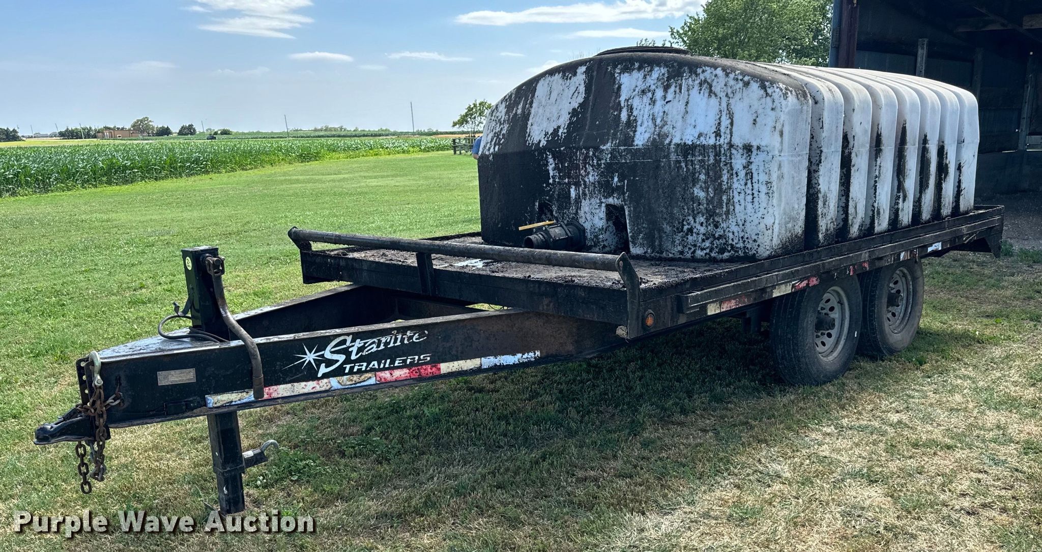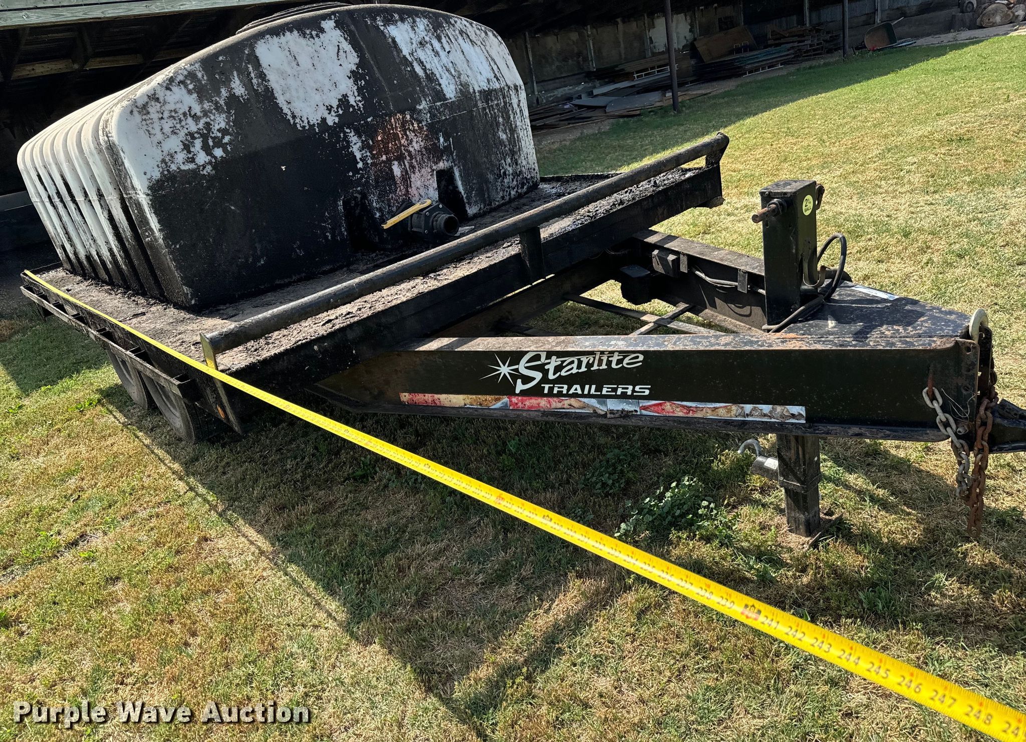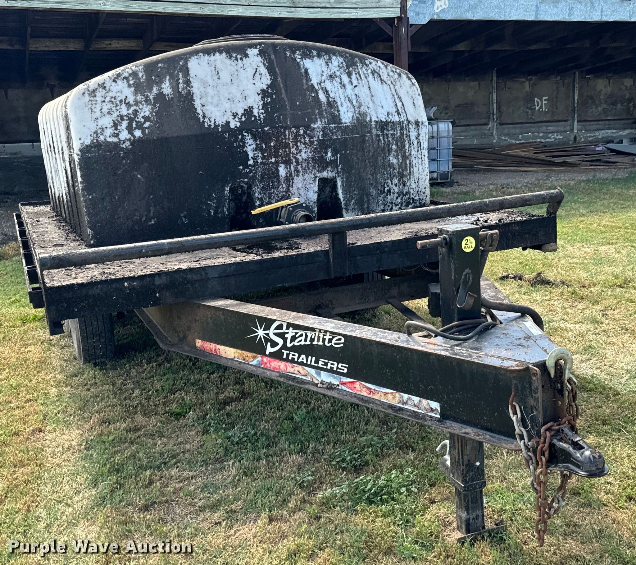 2013 Starlite 1410 I equipment trailer. VIN: 13YFS1428DC118211. Dimensions Overall: 19' 8" L x 102" W, Deck: 14' 2" L x 97" W, Deck height: 34". Features Deck type: Steel, Poly tank Capacity: 1,600 gallons. Chassis Ball hitch: 2 5/16", Landing gear: Single, Suspension: Spring, Brakes: Electric, Axles: Tandem, GVWR: 14,000 lbs. Tires Steel wheels, Size: 235/80R16. Transfer of ownership documentation will be a bill of sale. Perennial Companies. Goddard, KS 67052