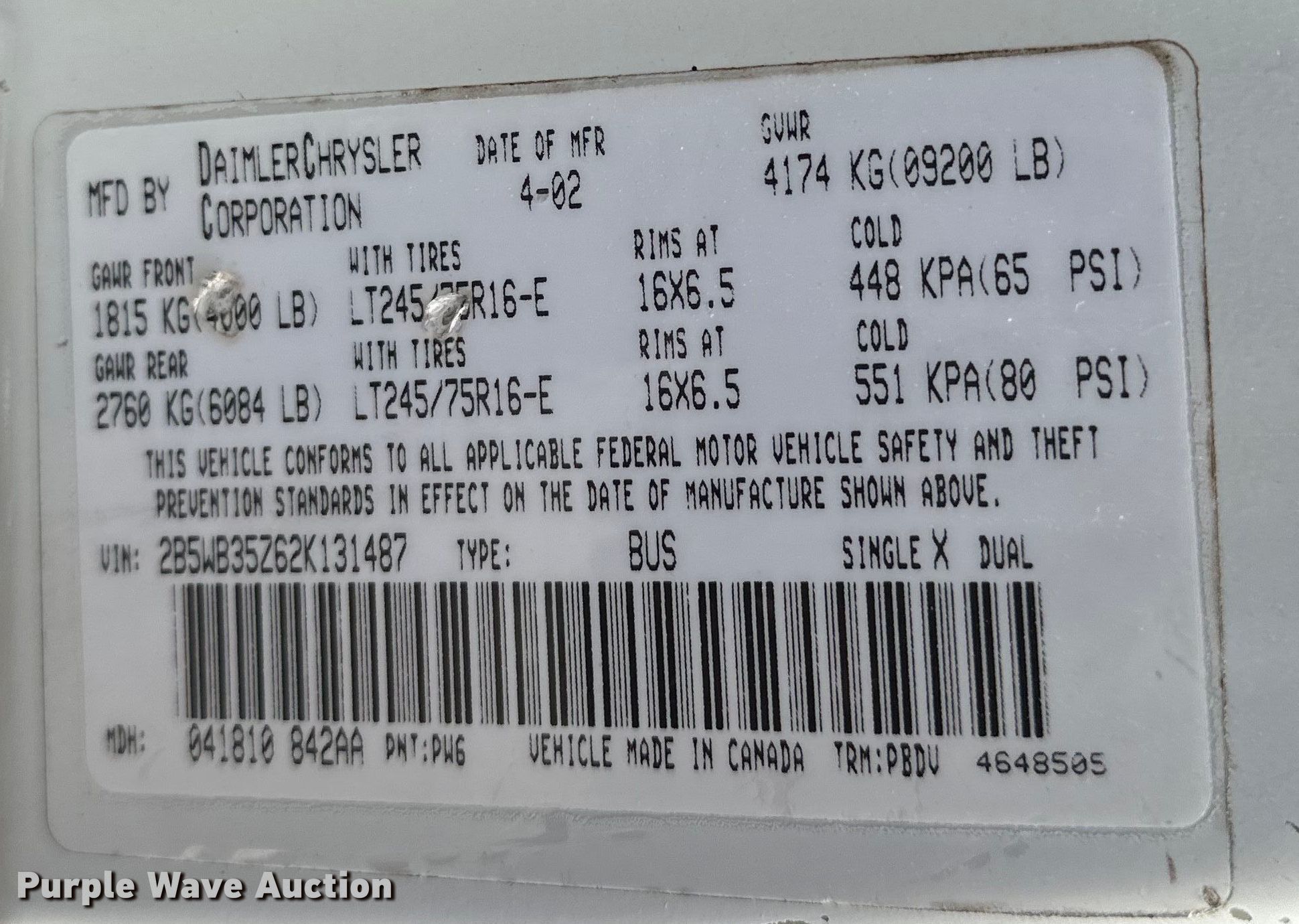 • VIN: 2B5WB35Z62K131487
