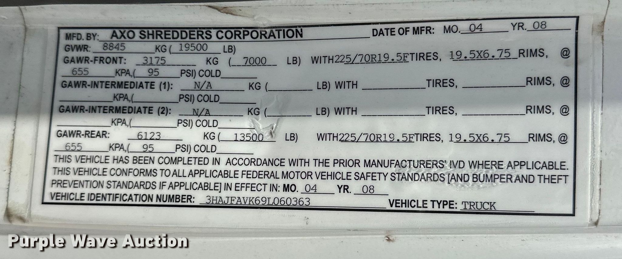 2009 International CF600 paper shredder truck. Miles: 115,983 on odometer, VIN: 3HAJFAVK69L060363. Engine Cylinders: 6, Fuel type: Diesel. Transmission Automatic. Chassis Axles: Single, Suspension: Spring, Brakes: Hydraulic, PTO, GVWR: 19,500 lbs. Interior AC, Heat, Cruise control, Auxiliary controls. Features Box bed 15' L x 95" W x 96" H, AXO paper shredder Conveyor width: 72", Conveyor length: 9'. Tires Front: 225/70R19.5. Notes Windshield chipped or cracked, AC needs charged, Rust damage, Unknown operating condition of shredder. Oklahoma title. Mileage has not been verified. Exempt will be written in the odometer disclosure on the title. Tulsa, OK 74115
