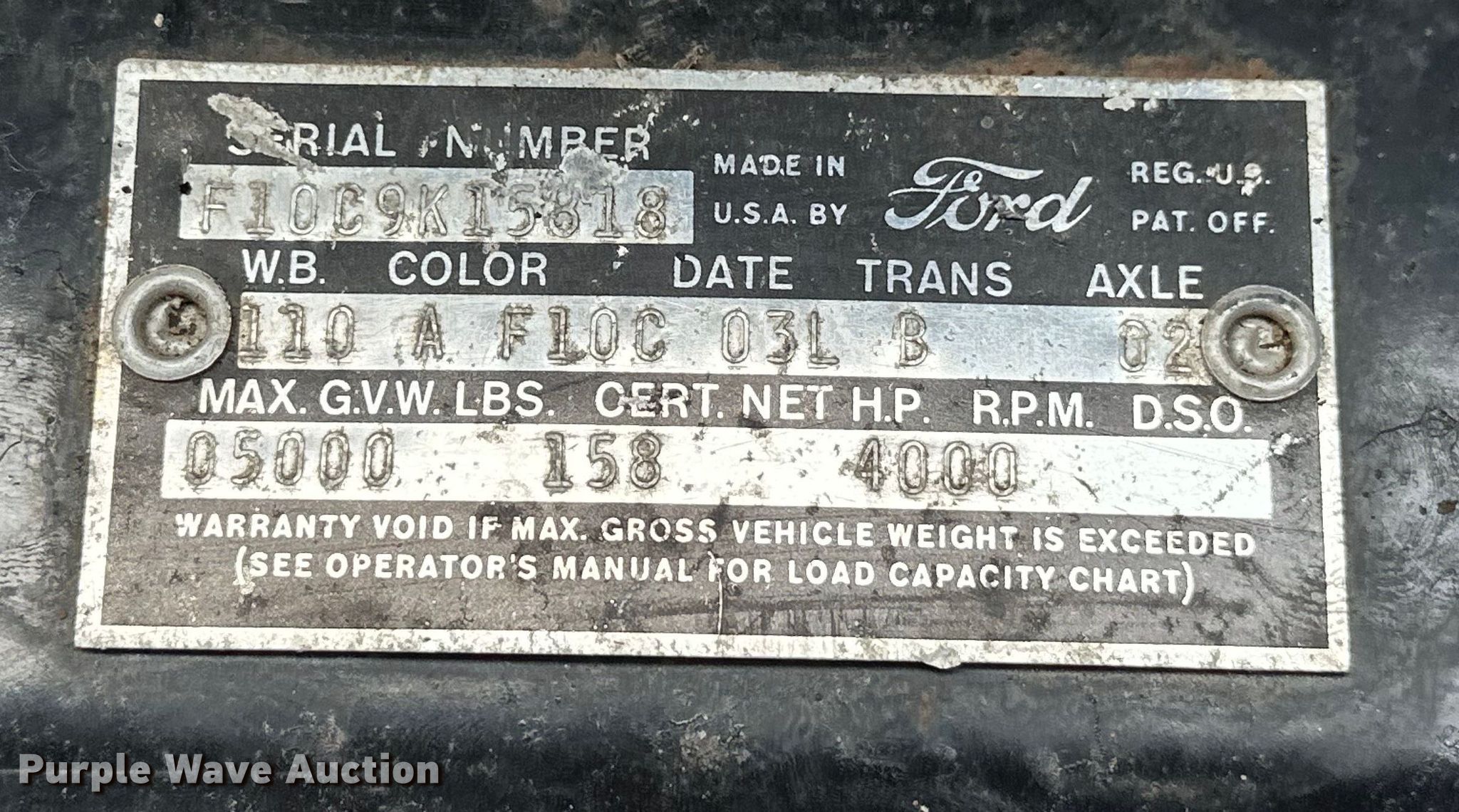Purple Wave is selling a used 1/2 Ton Pickup or Van in Oklahoma. This item is a 1959 Ford F100 pickup truck with the following: Miles: 25,314 on odometer, VIN: F10C9K15818