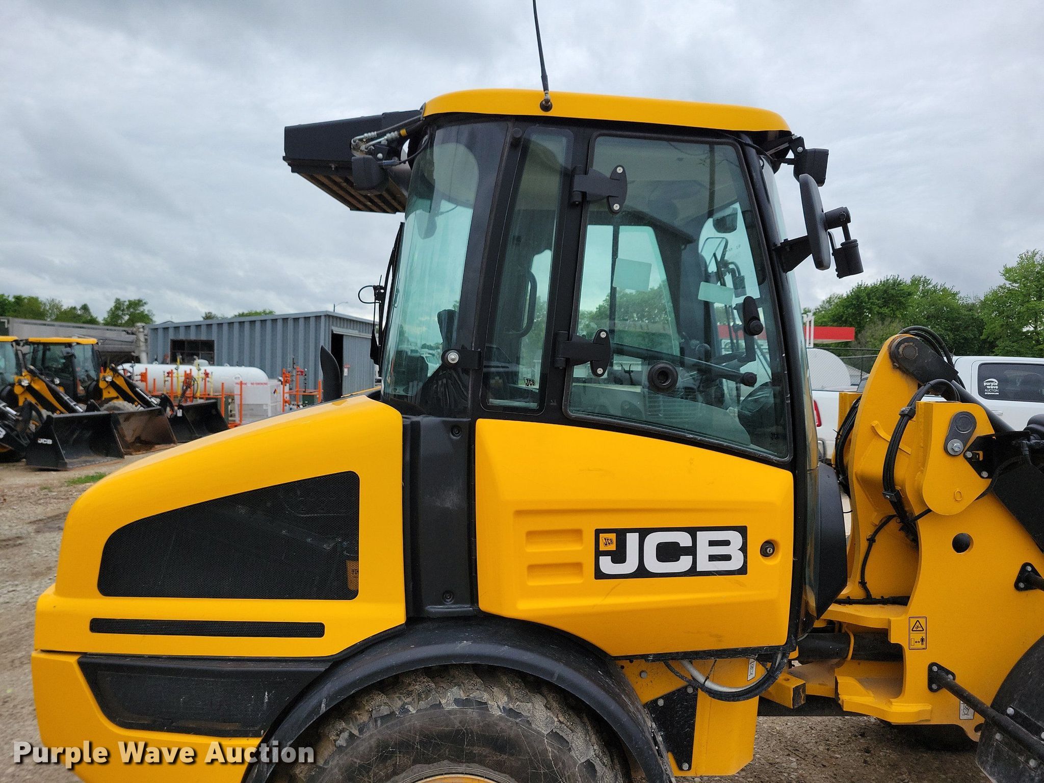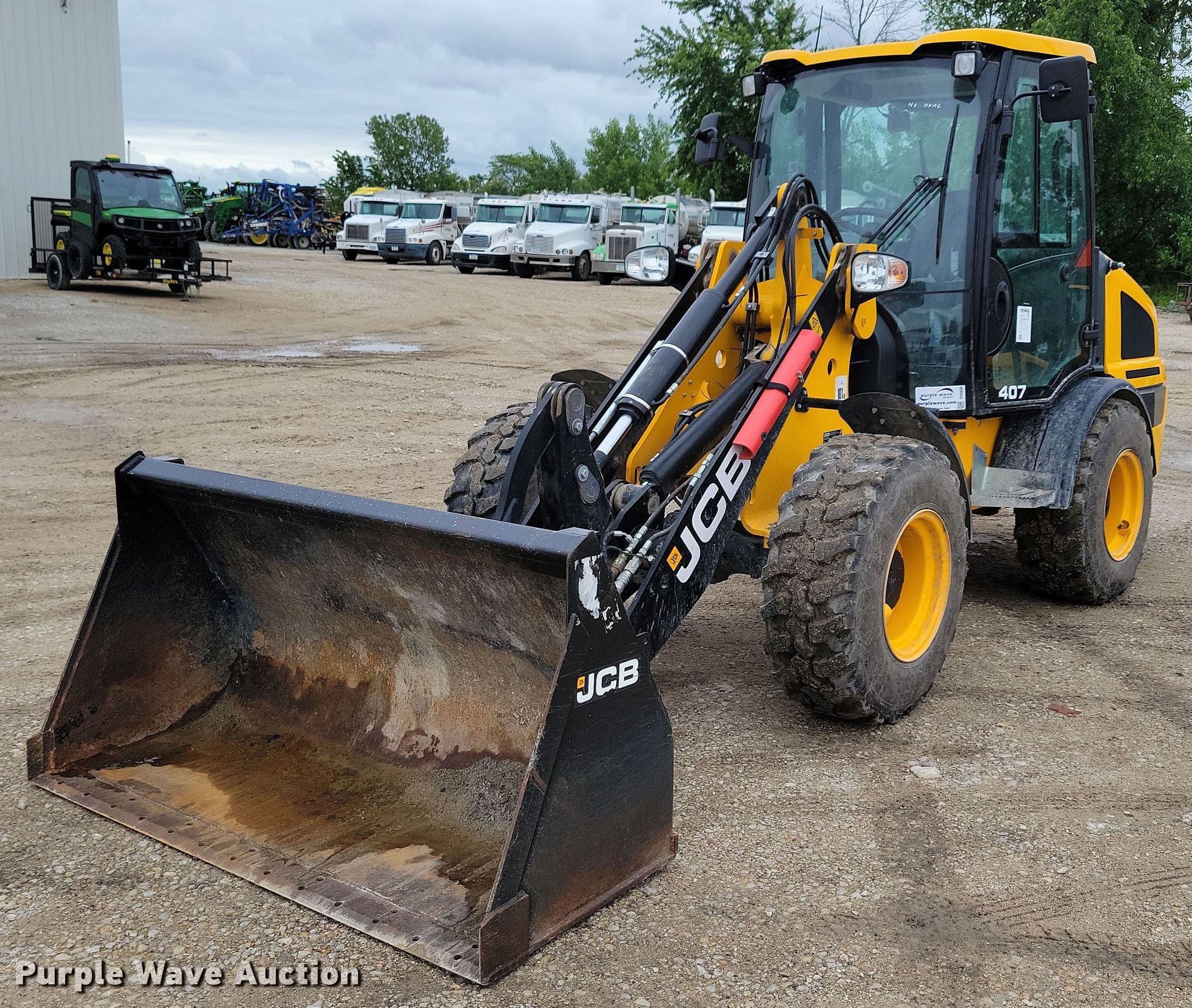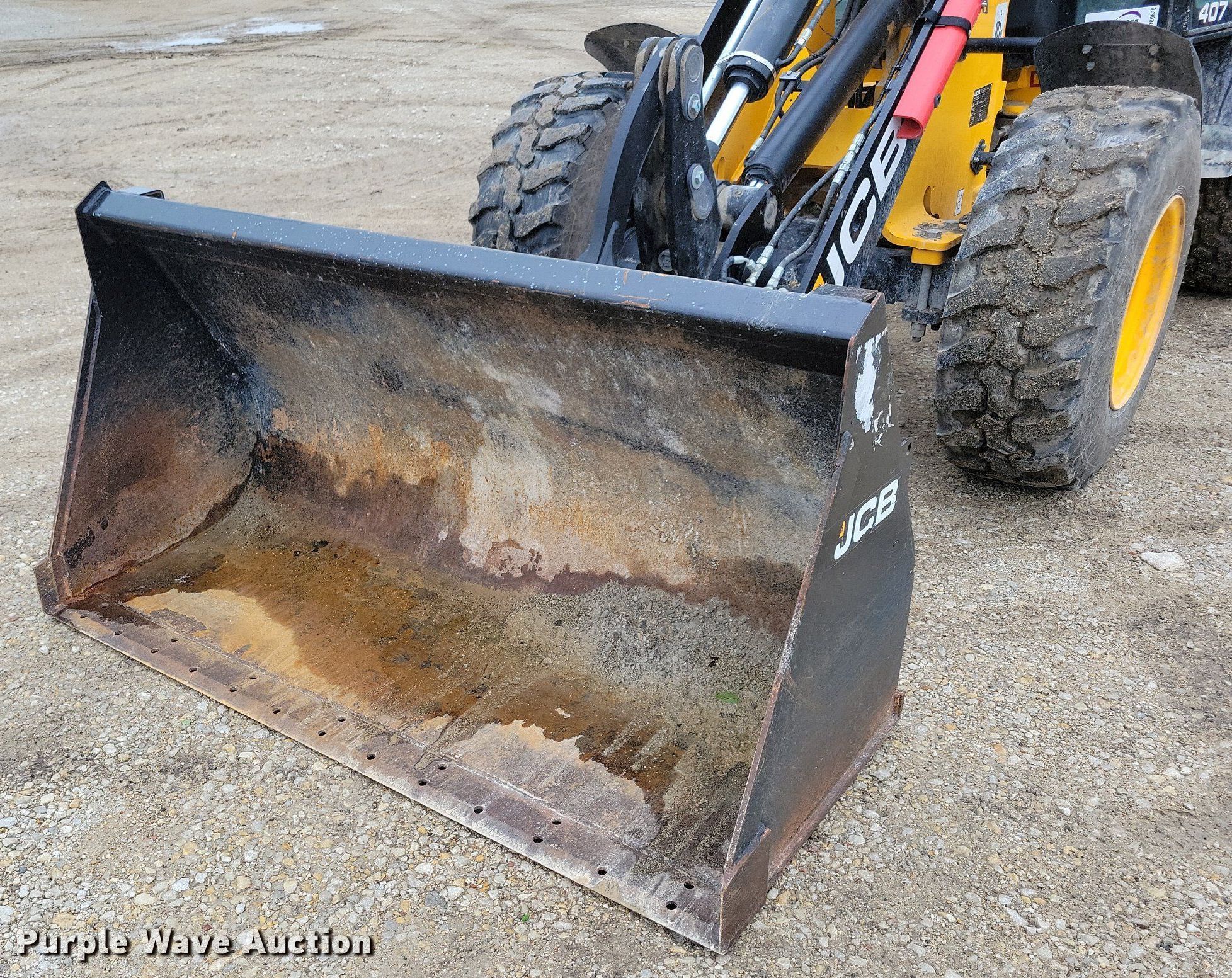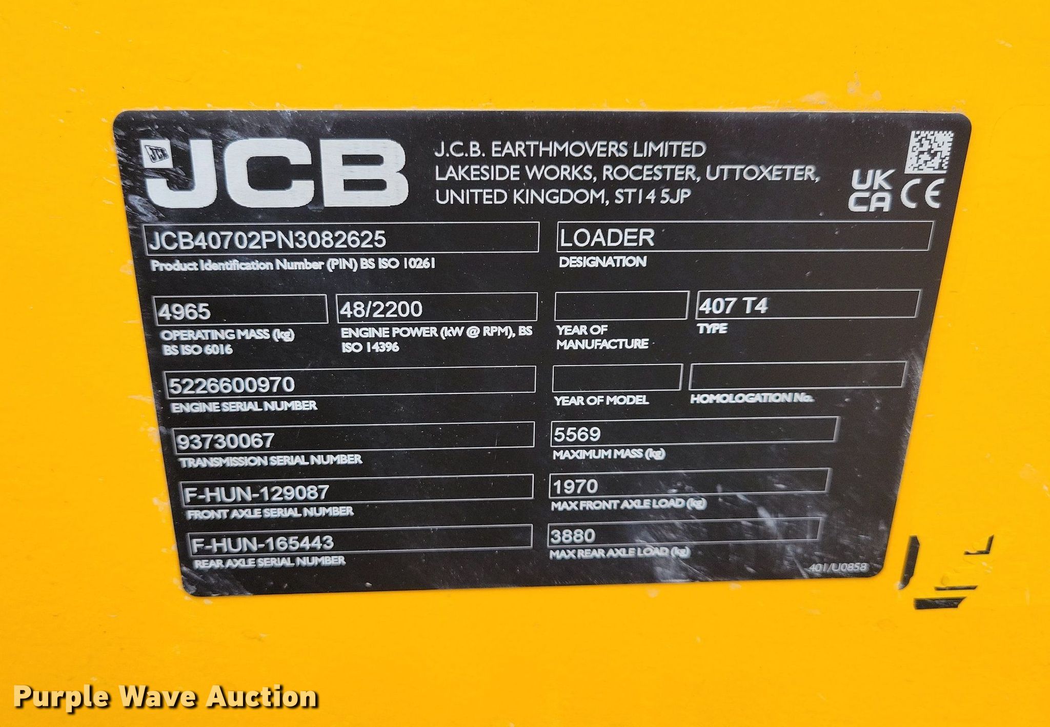 2022 JCB 407 wheel loader. Hours: 406 on meter, Serial: JCB40702PN3082625. Engine Kohler, Serial: 52266000970, Displacement: 2.482L, Cylinders: 4, Fuel type: Diesel. Transmission Hydrostatic, Two speed travel. Operators station Enclosed cab, AC, Heat, Bucket controls: Joystick. Features Quick coupler: Hydraulic, Counter weights, Bucket Capacity: 1 cu.yd., Width: 70". Tires Size: 365/70R18. Agriland FS. Winterset, IA 50273
