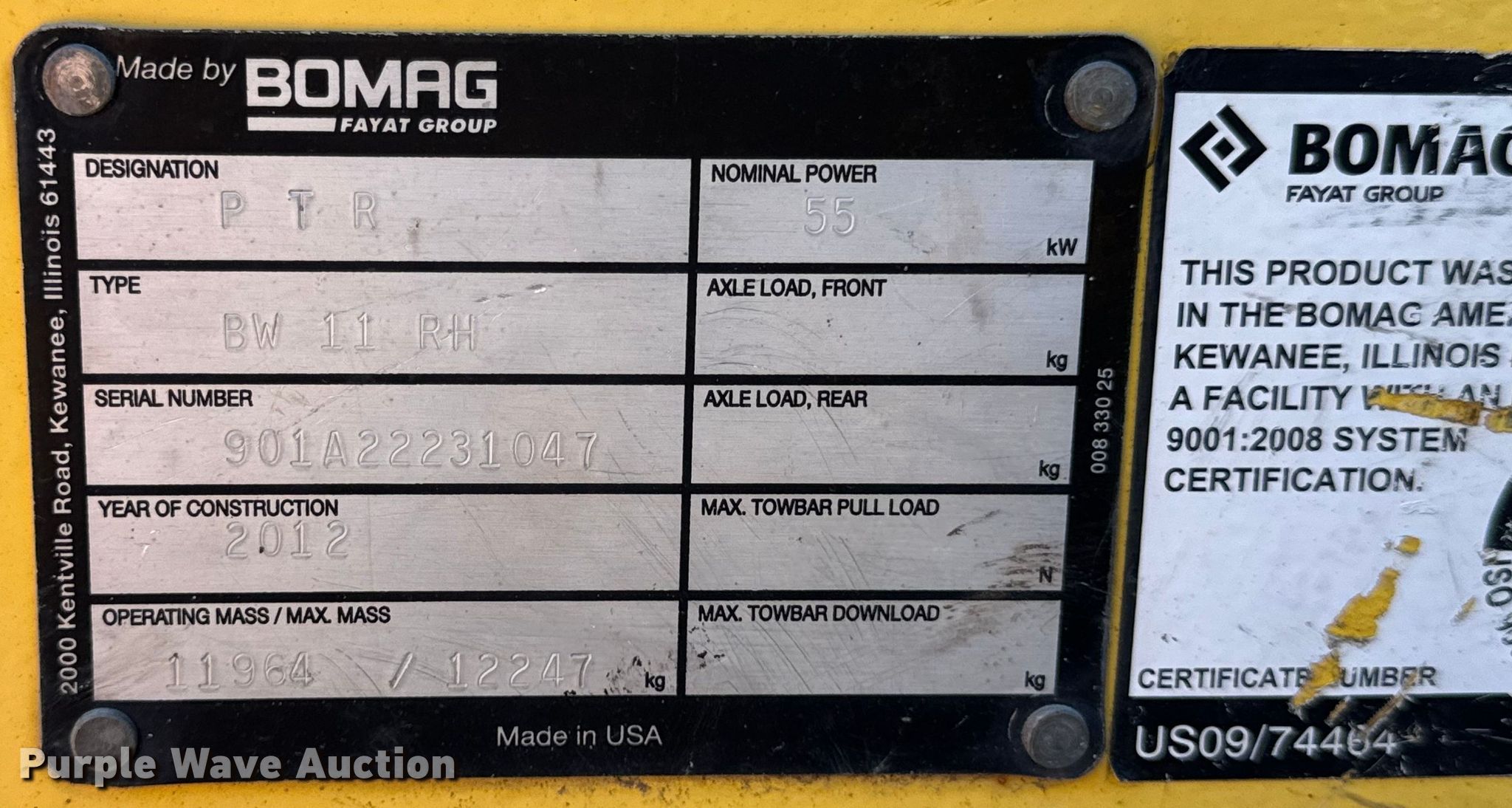 Purple Wave is selling a used Pneumatic Roller in Missouri. This item is a 2012 Bomag BW11RH pneumatic roller with the following: Hours: Unknown, Serial: 901A22231047, Unit #: 1629
