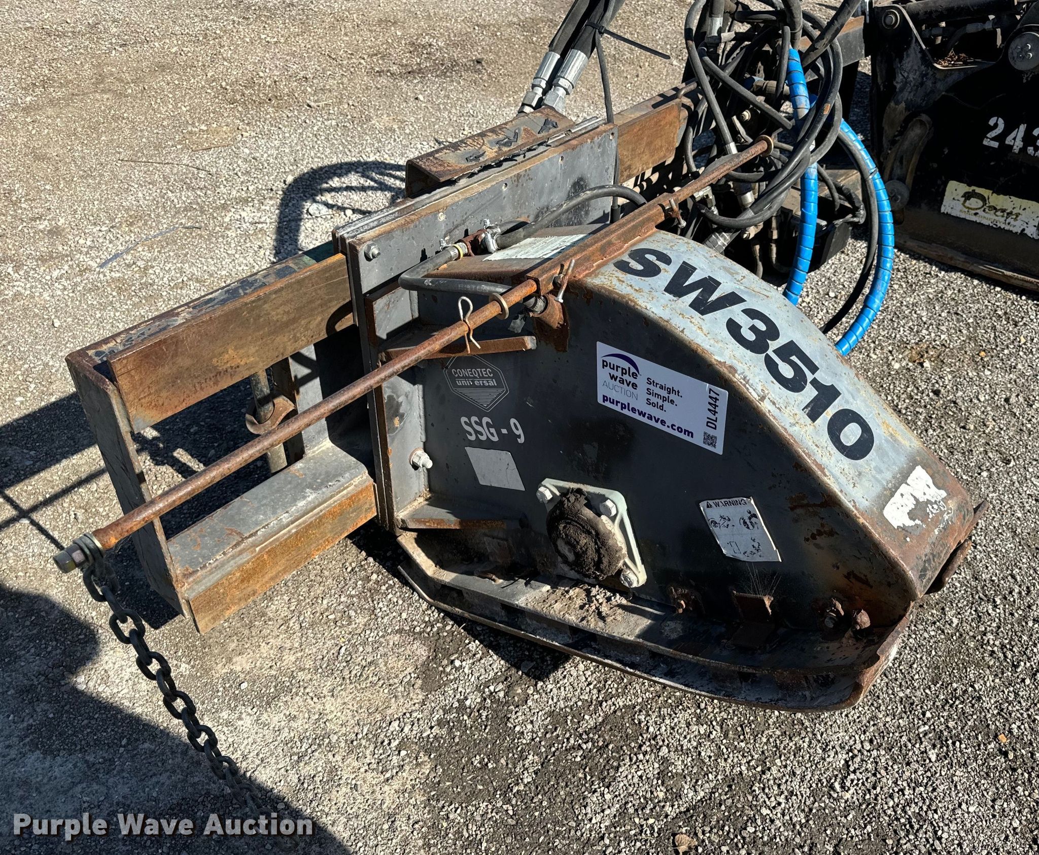 Purple Wave is selling a used Skid Steer Attach. in Missouri. This item is a Coneqtec Universal SSG9 skid steer rock saw with the following: Serial: FS7248, Unit #: SW3510, Shaft broken, Hoses disconnected, Non-operational unit
