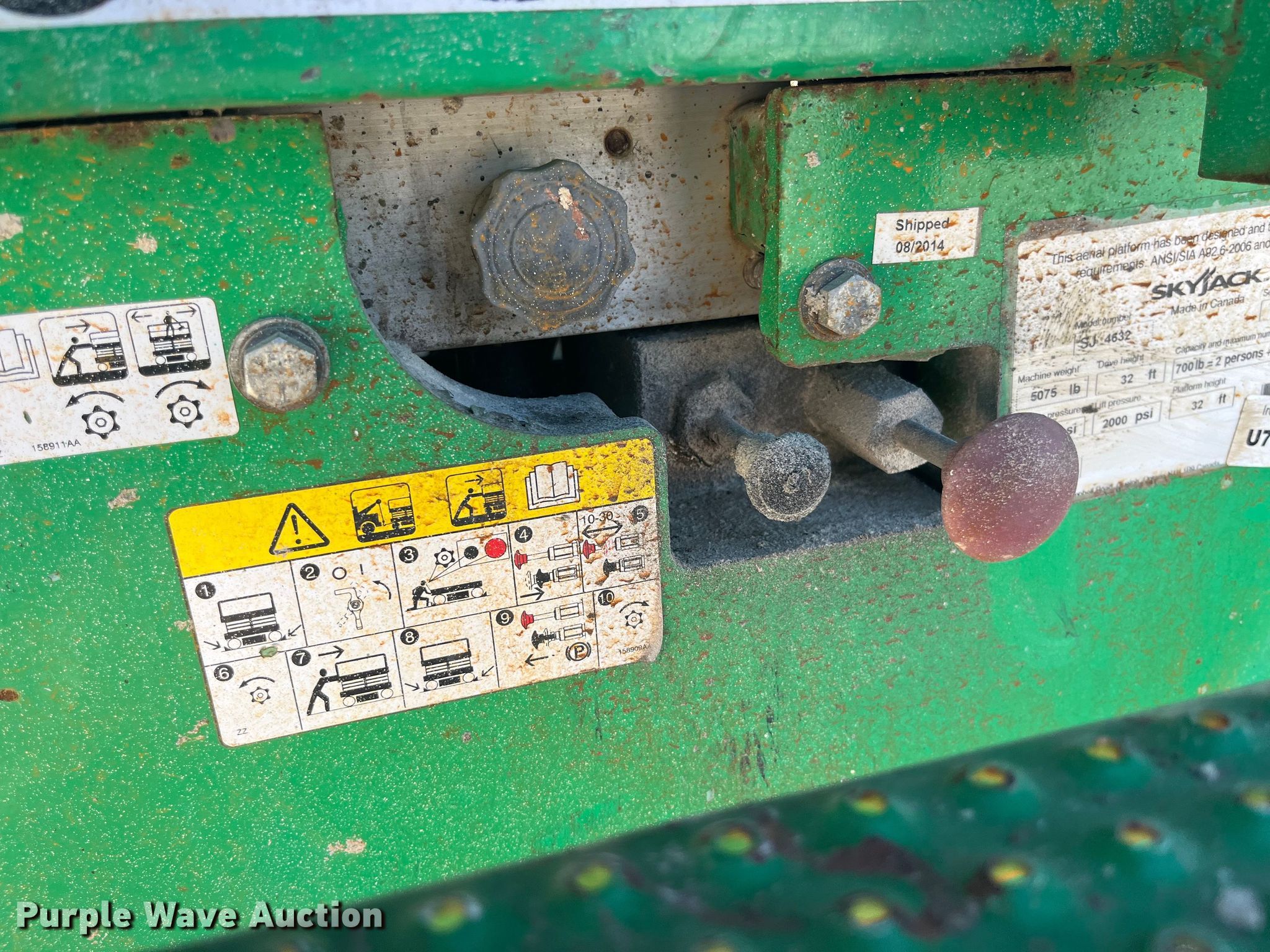 2014 Skyjack SJIII 4632 scissor lift. Hours: 339 on meter, Serial: 70021152. Electric Motor Volts: 24. Features Maximum lift capacity: 700 lbs, Maximum lift height: 32', Platform: 86" L x 44" W, AC power outlet, Controls: Remote Control, Ground, Platform extensions: Manual, Safety alarm. Tires Tire size: 16x5x12, Solid, Non-marking. Quality Equipment. Mount Pleasant, IA 52641