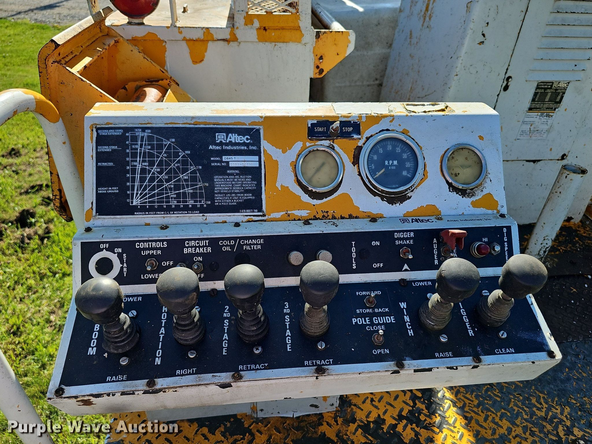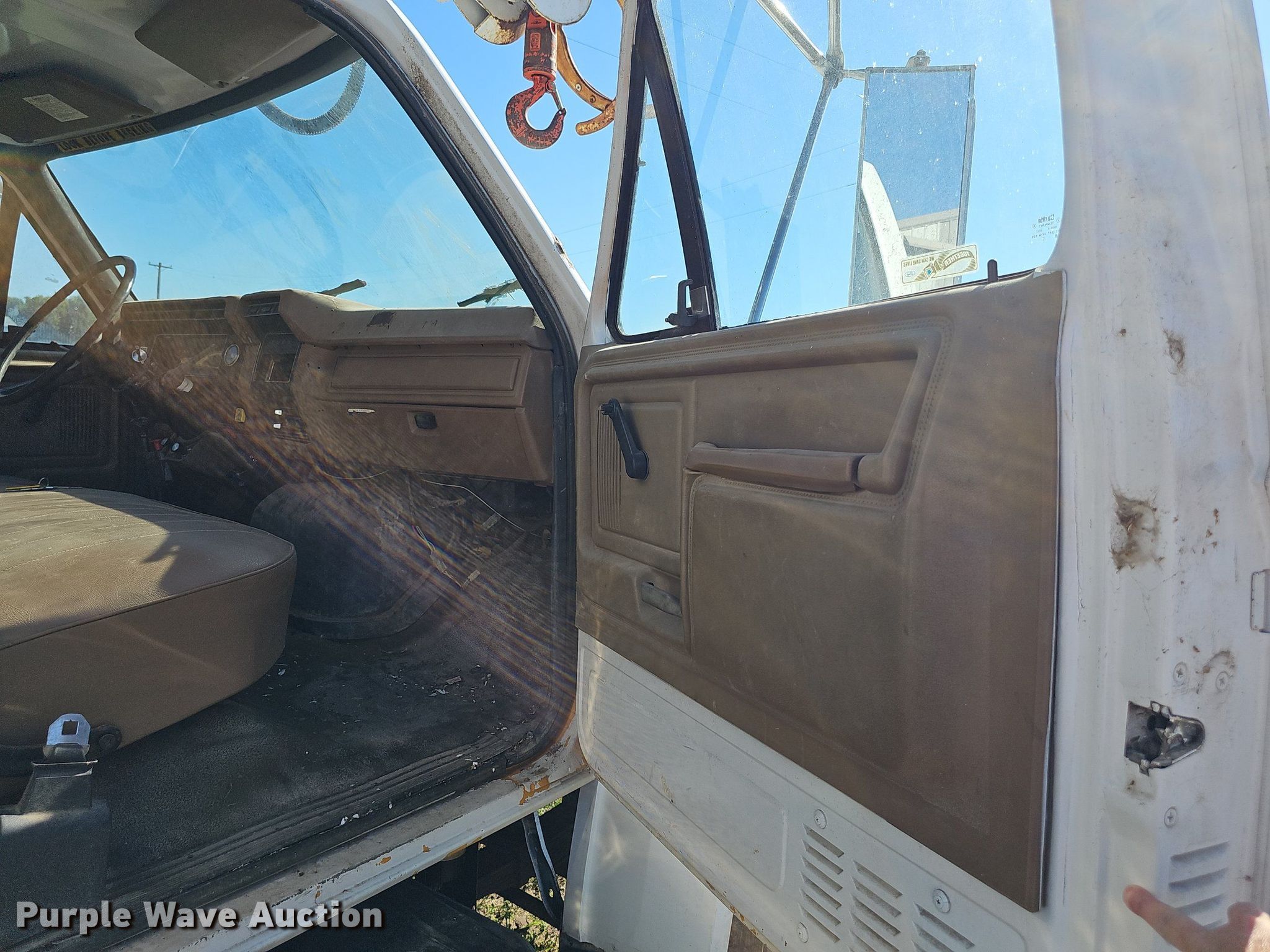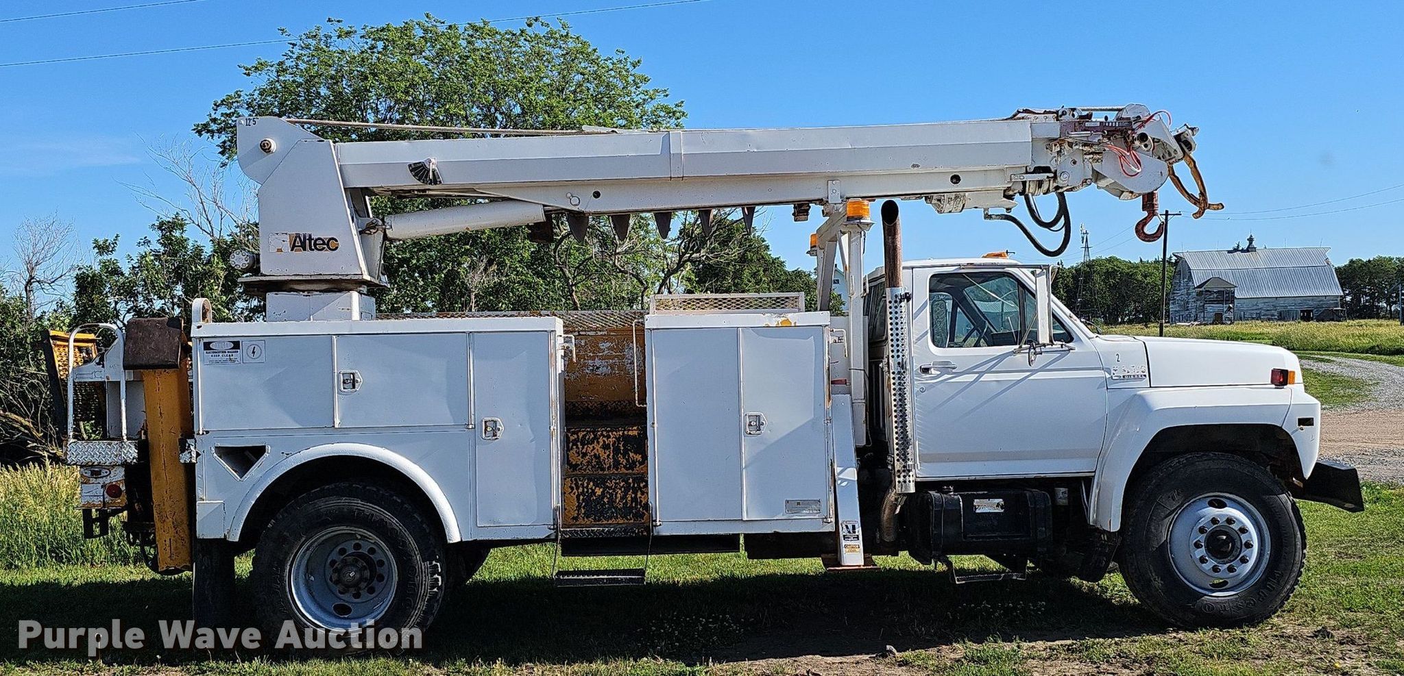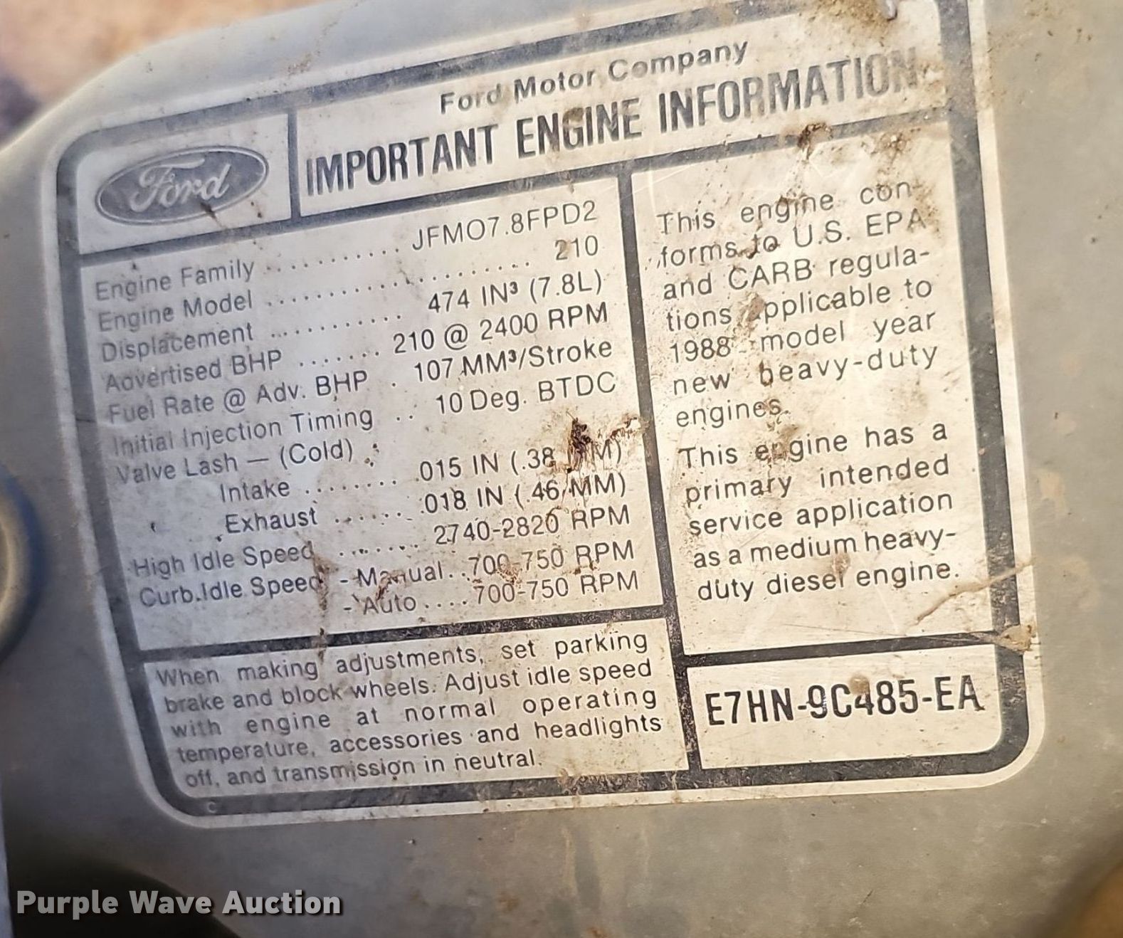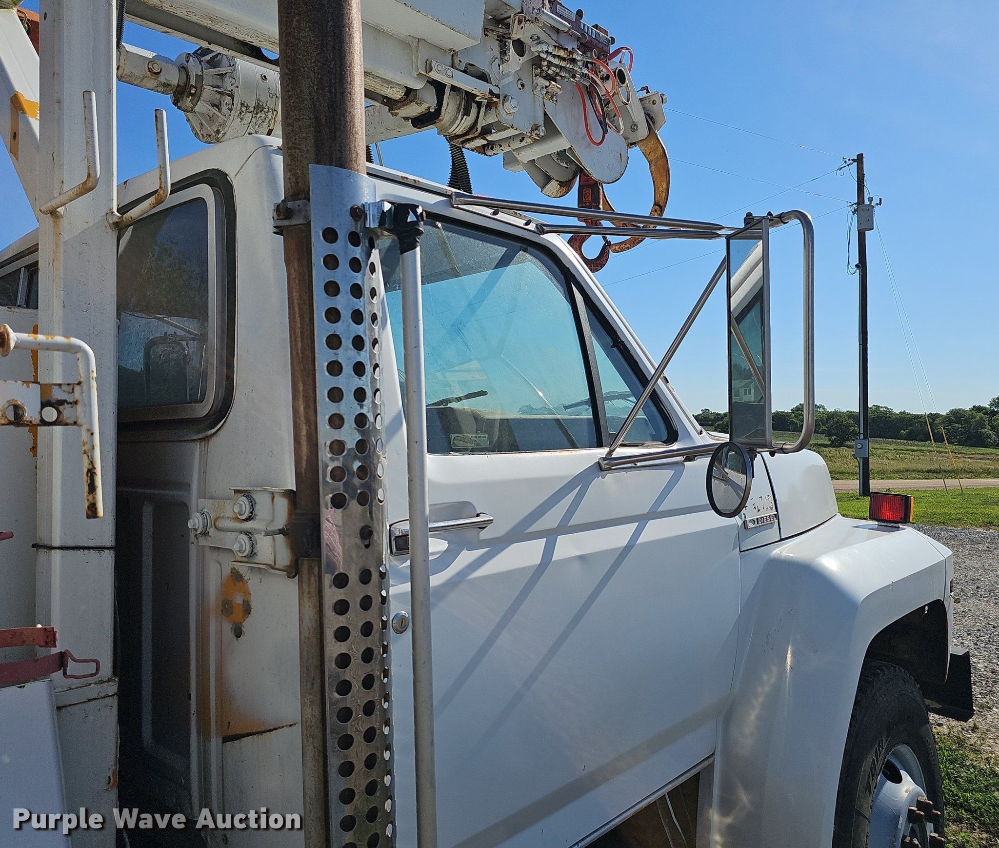1988 Ford F800 digger derrick truck. Miles: 106,023 on odometer, Hours: 3,211 on meter, VIN: 1FDXK84A6JVA48712. Engine Ford 210, Displacement: 7.8L, Cylinders: 6, Fuel type: Diesel. Transmission Manual, Speed: 5, plus 2. Chassis Axles: Single, Suspension: Spring, Brakes: Air, PTO, GVWR: 33,000 lbs, Wheelbase: 198". Interior Heat, Brake controller. Features Bed Altec, Serial: 37-62365, 14' L x 94" W, Boom Altec D845-TR, Serial: 1089-T0796, Boom length: 45', Maximum lift capacity: 27,000 lbs, Boom type: Telescopic, Man basket, Boom controls Ground, Material handler, Pole guide, Auger Diameter: 20".. Tires Size: 11R22.5. Notes Rear differential repaired in May 2024, Hydraulic leak. View repairs. Nebraska title. 2370 County Road K. Wilber, NE 68465