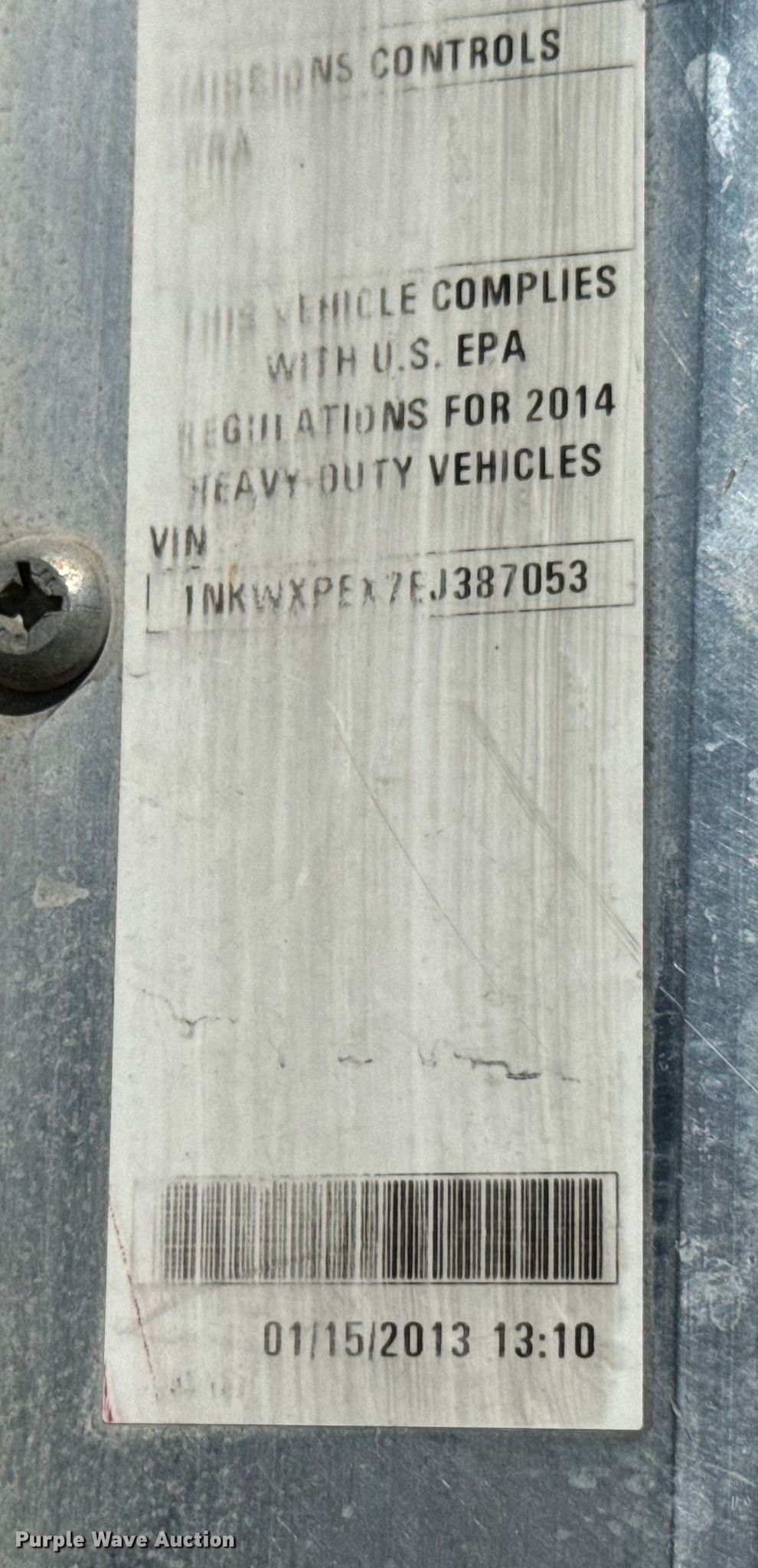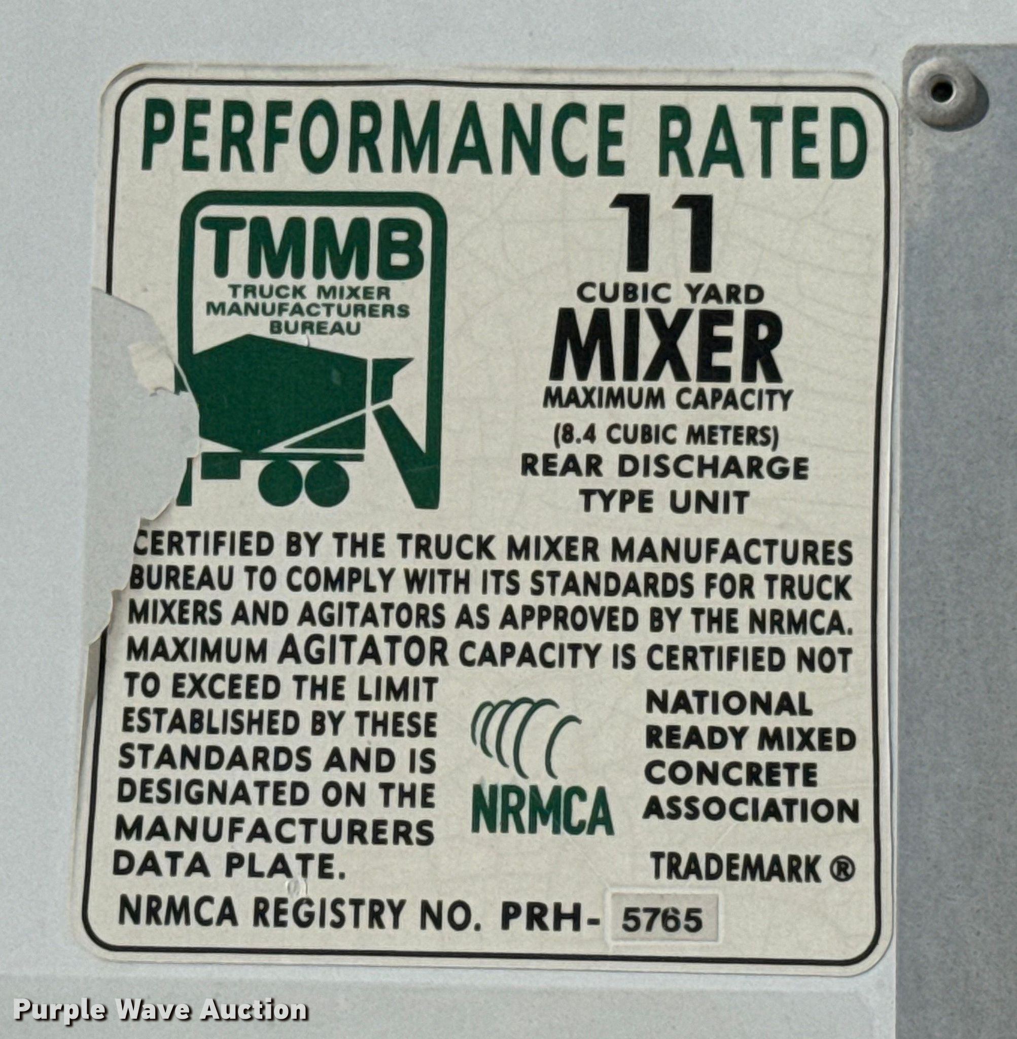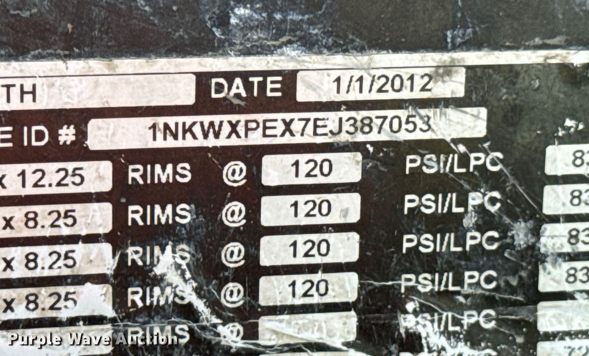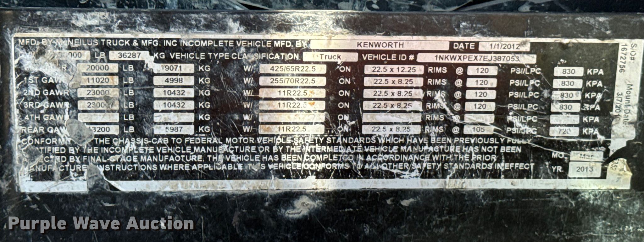 2014 Kenworth W900 ready mix truck. Miles: 106,138 on odometer, Hours: 11,776 on meter, VIN: 1NKWXPEX7EJ387053. Engine Paccar MX-13, Displacement: 12.9L, Cylinders: 6, Fuel type: Diesel, Engine brake. Transmission Eaton Fuller, Manual, Speed: 11. Chassis Axles: 4, Pusher axle Steerable, Tag axle, Differential lock: Full, Suspension: Spring over walking beam, Brakes: Air, PTO, GVWR: 77,020 lbs FAWR: 20,000 lbs, IAWR: 23,000 lbs, RAWR: 23,000 lbs, Lift axle GAWR: 11,020 lbs. Interior AC, Heat, Power windows, Power locks, Cruise control. Features Mixer TMMB, Capacity: 11 cu.yd., Discharge: Rear, In-cab controls, Rear drum controls, Chute Extensions: 3, Chute type: Aluminum.. Tires Front: 425/65R22.5, Rear: 11R22.5, Lift axle: 255/70R22.5. Missouri title. Joplin Concrete Company Inc. Joplin, MO 64801