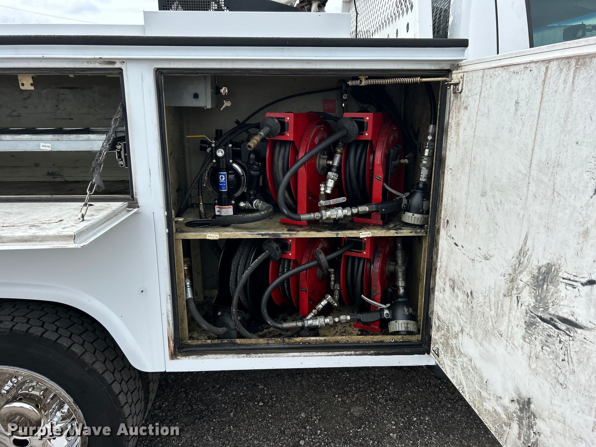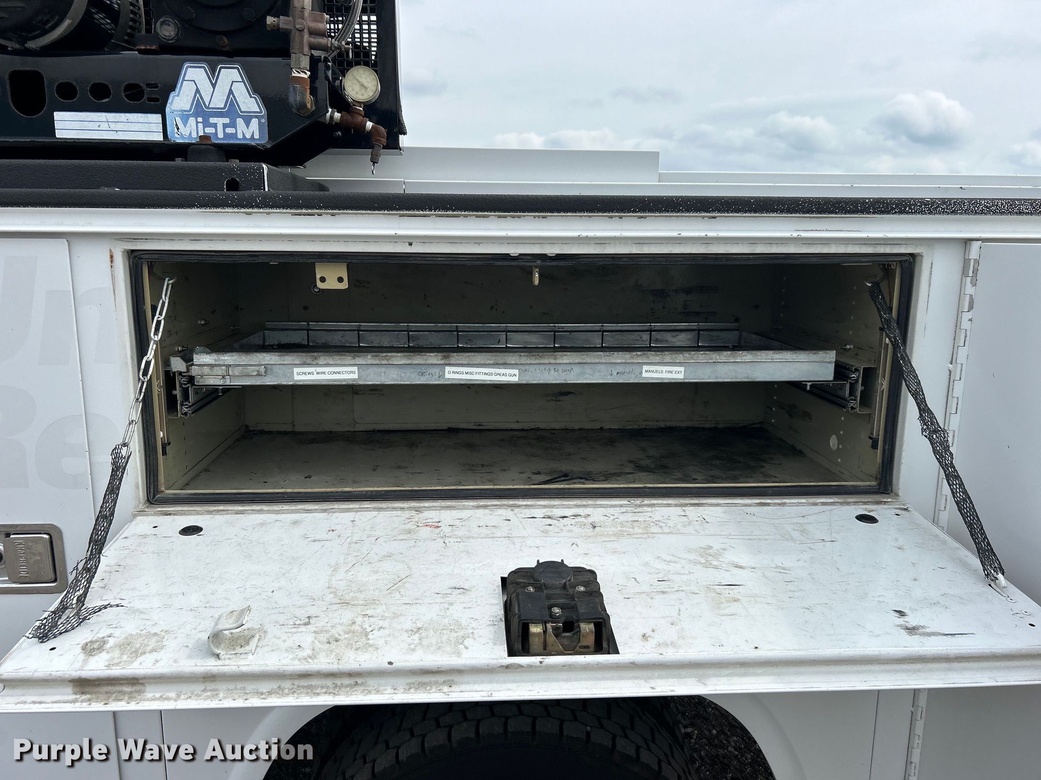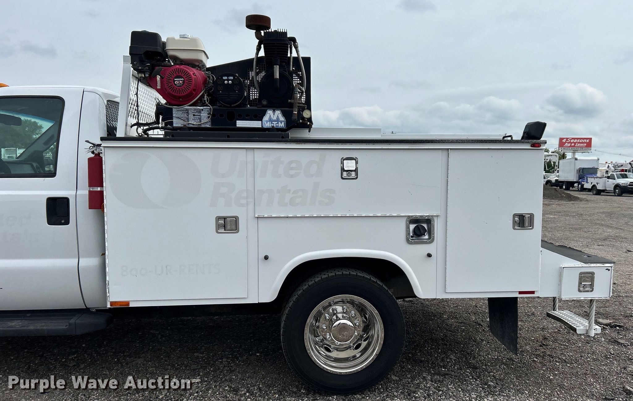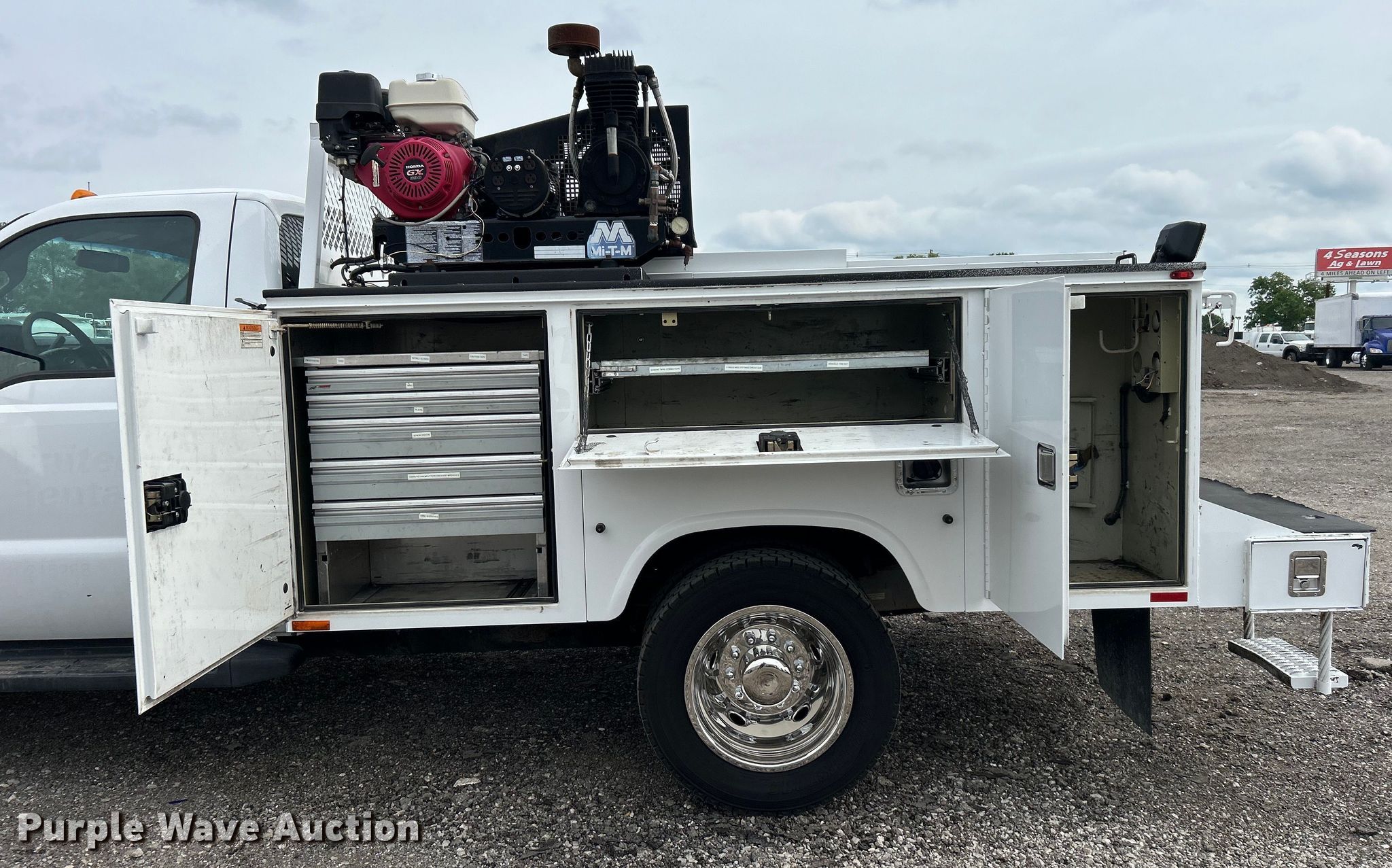 2014 Ford F450 Super Duty utility / service truck. Miles: 139,930 on odometer, VIN: 1FDUF4GY5EEA61868. Engine Displacement: 6.8L, Cylinders: 10, Fuel type: Gas. Transmission Automatic. Chassis Axles: Single, Suspension: Spring, Brakes: Hydraulic, GVWR: 16,500 lbs, Wheelbase: 141". Interior AC, Heat, Heated mirrors, Power windows, Power locks, Cruise control, Auxiliary controls, Brake controller. Features Bed Knapheide, 107" L x 95" W, Air compressor Mi-T-M, Honda GX390, Oil/lube system Hose reels, Nozzles, Pump. Tires Size: 225/70R19.5. Notes Windshield chipped or cracked. Oklahoma title. 15107 North 137th East Avenue. Collinsville, OK 74021