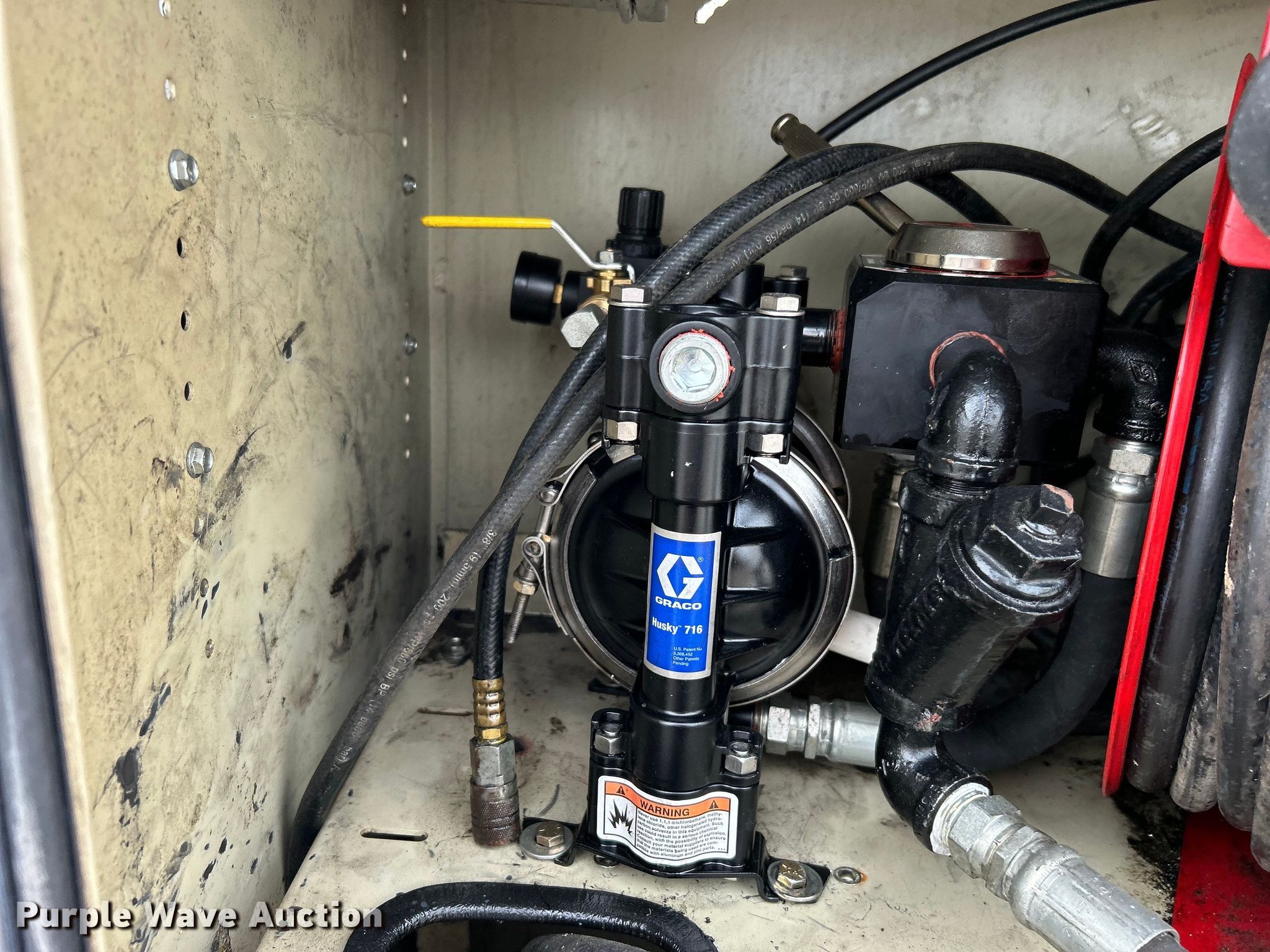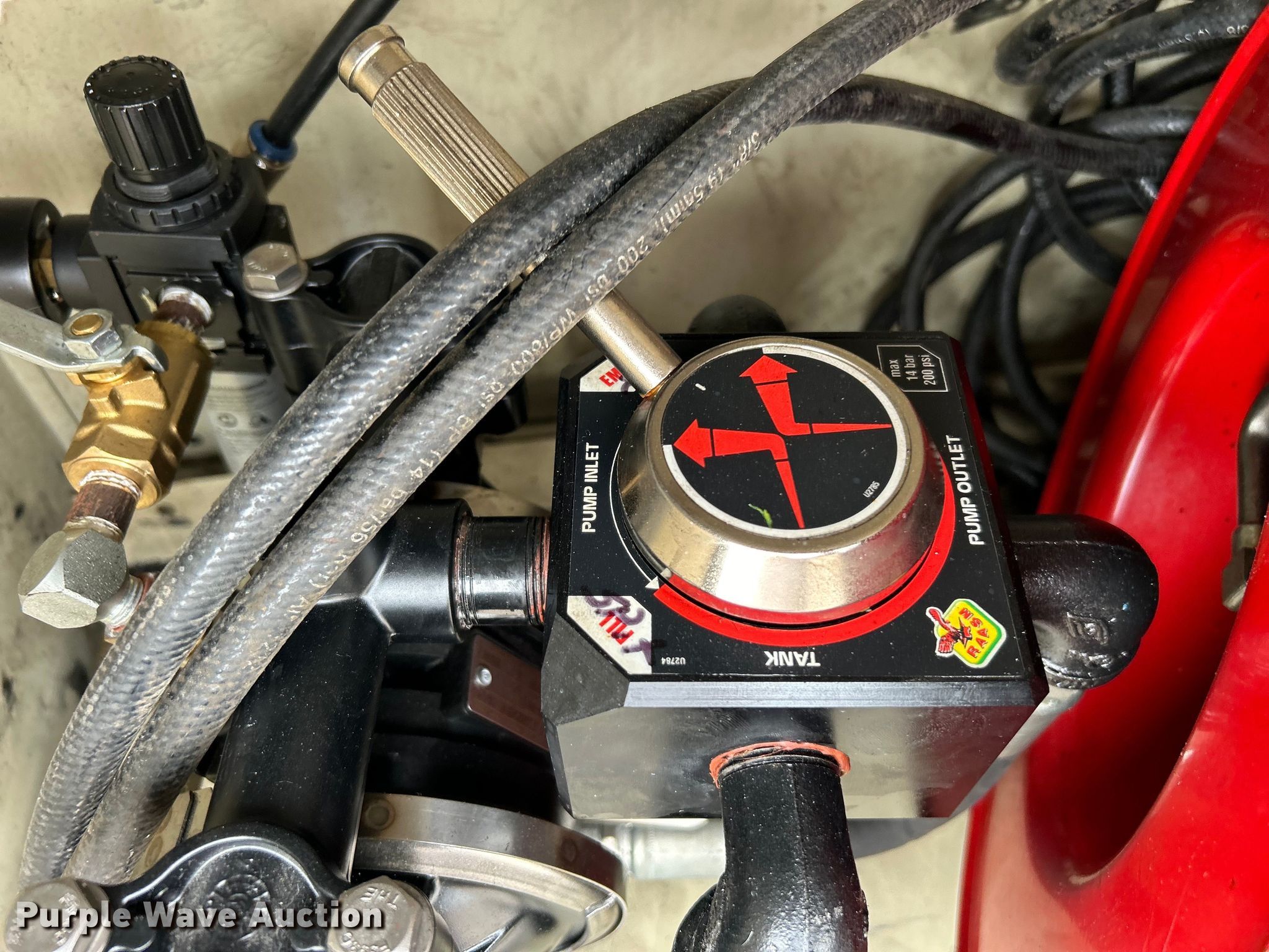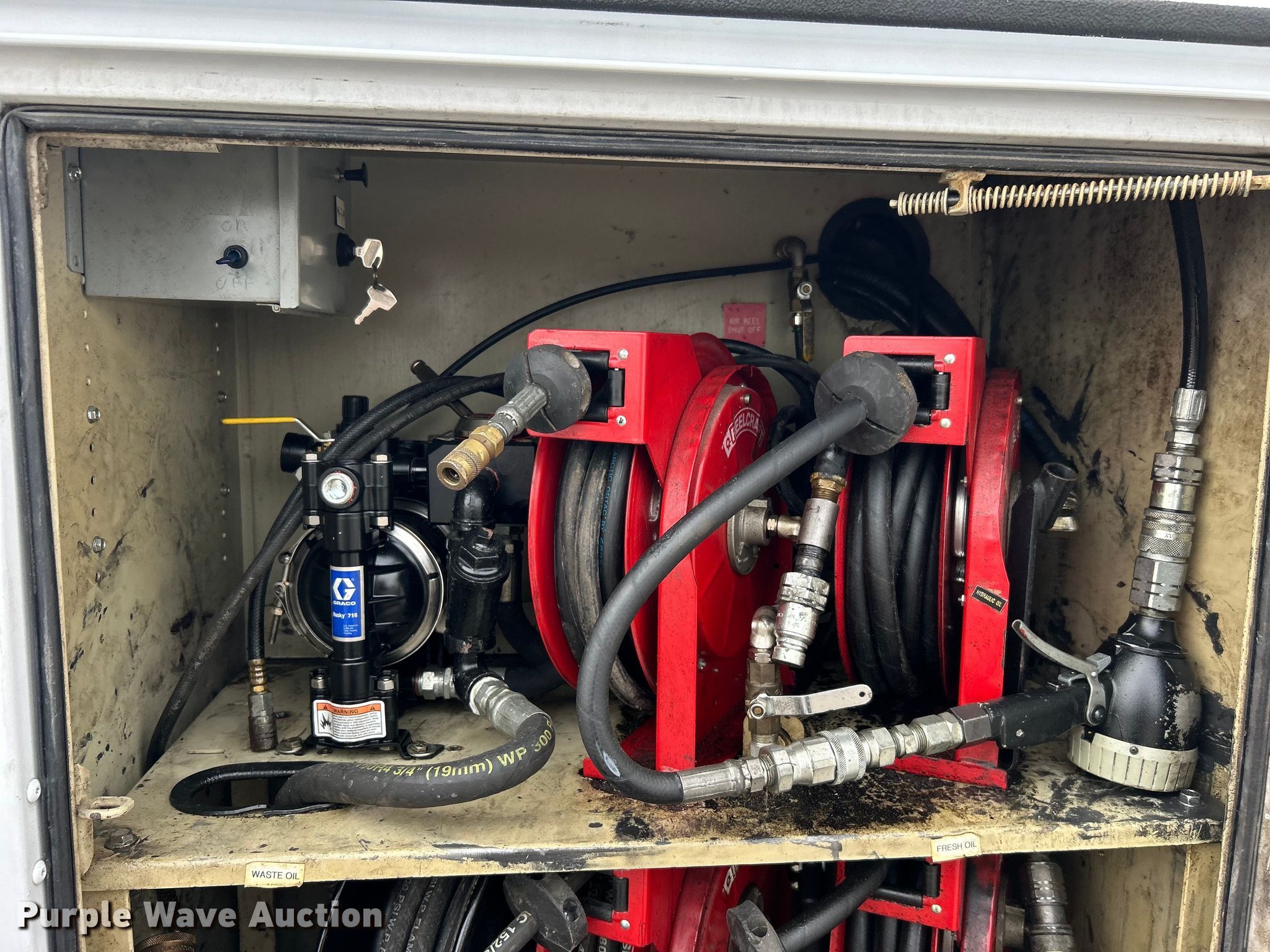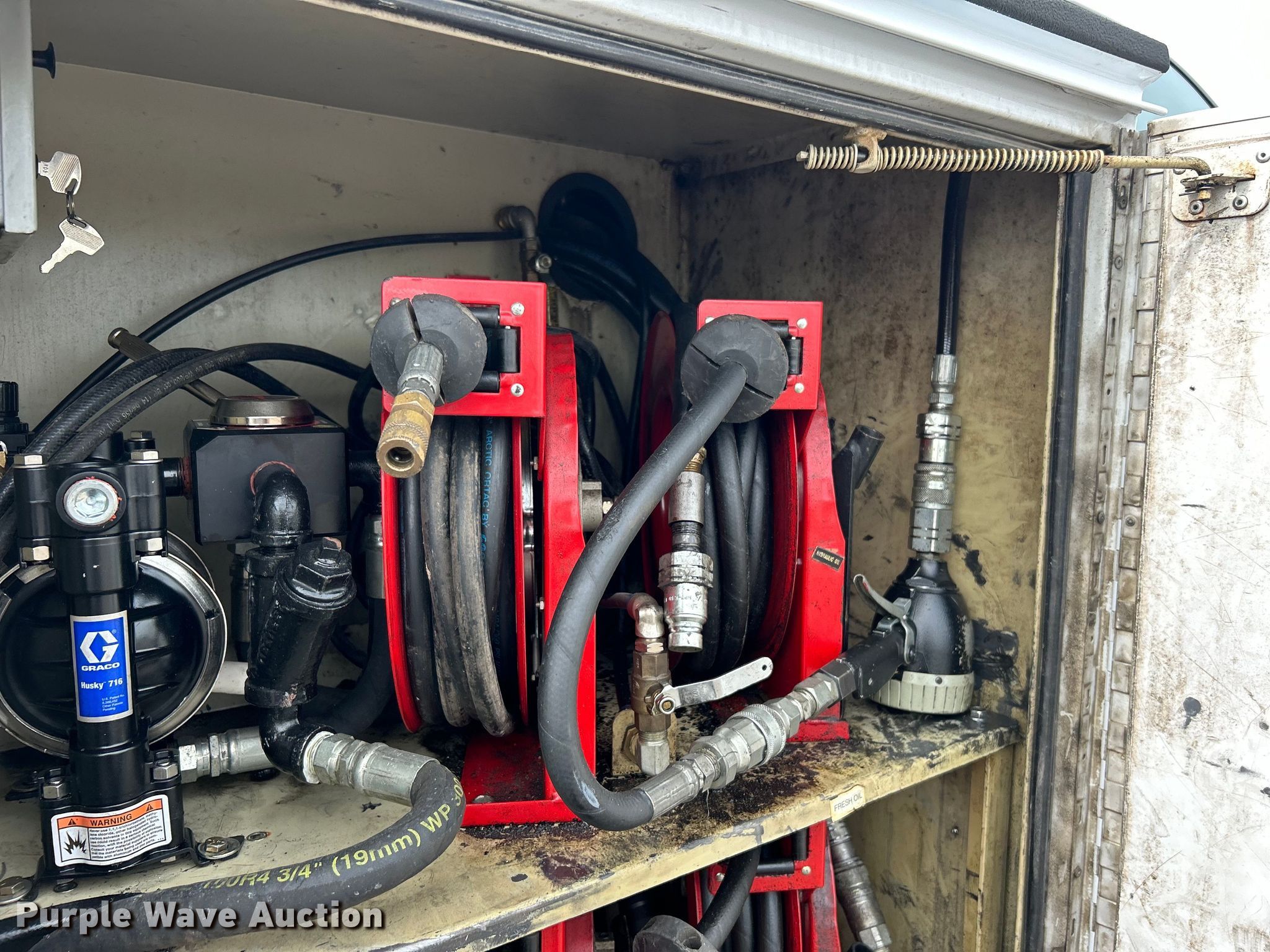2014 Ford F450 Super Duty utility / service truck. Miles: 139,930 on odometer, VIN: 1FDUF4GY5EEA61868. Engine Displacement: 6.8L, Cylinders: 10, Fuel type: Gas. Transmission Automatic. Chassis Axles: Single, Suspension: Spring, Brakes: Hydraulic, GVWR: 16,500 lbs, Wheelbase: 141". Interior AC, Heat, Heated mirrors, Power windows, Power locks, Cruise control, Auxiliary controls, Brake controller. Features Bed Knapheide, 107" L x 95" W, Air compressor Mi-T-M, Honda GX390, Oil/lube system Hose reels, Nozzles, Pump. Tires Size: 225/70R19.5. Notes Windshield chipped or cracked. Oklahoma title. 15107 North 137th East Avenue. Collinsville, OK 74021