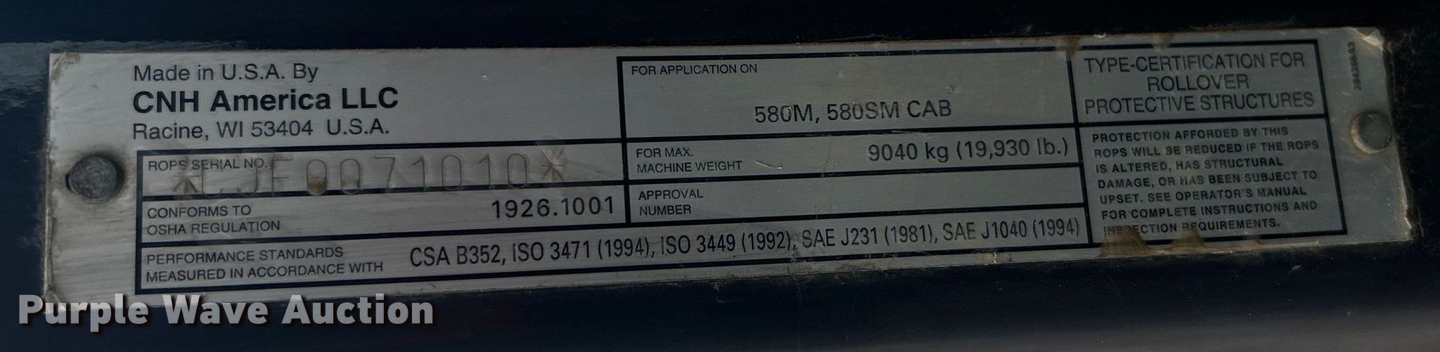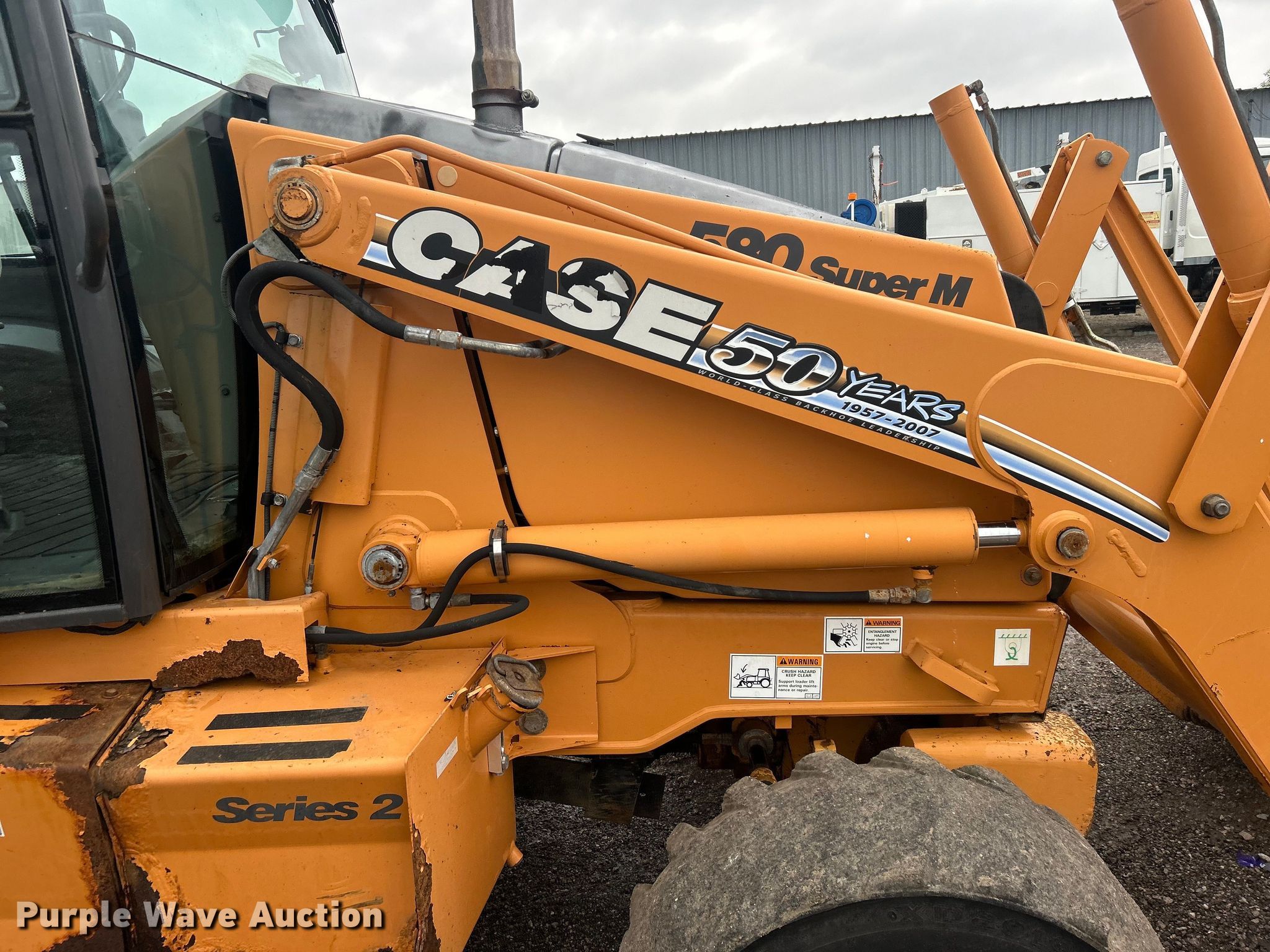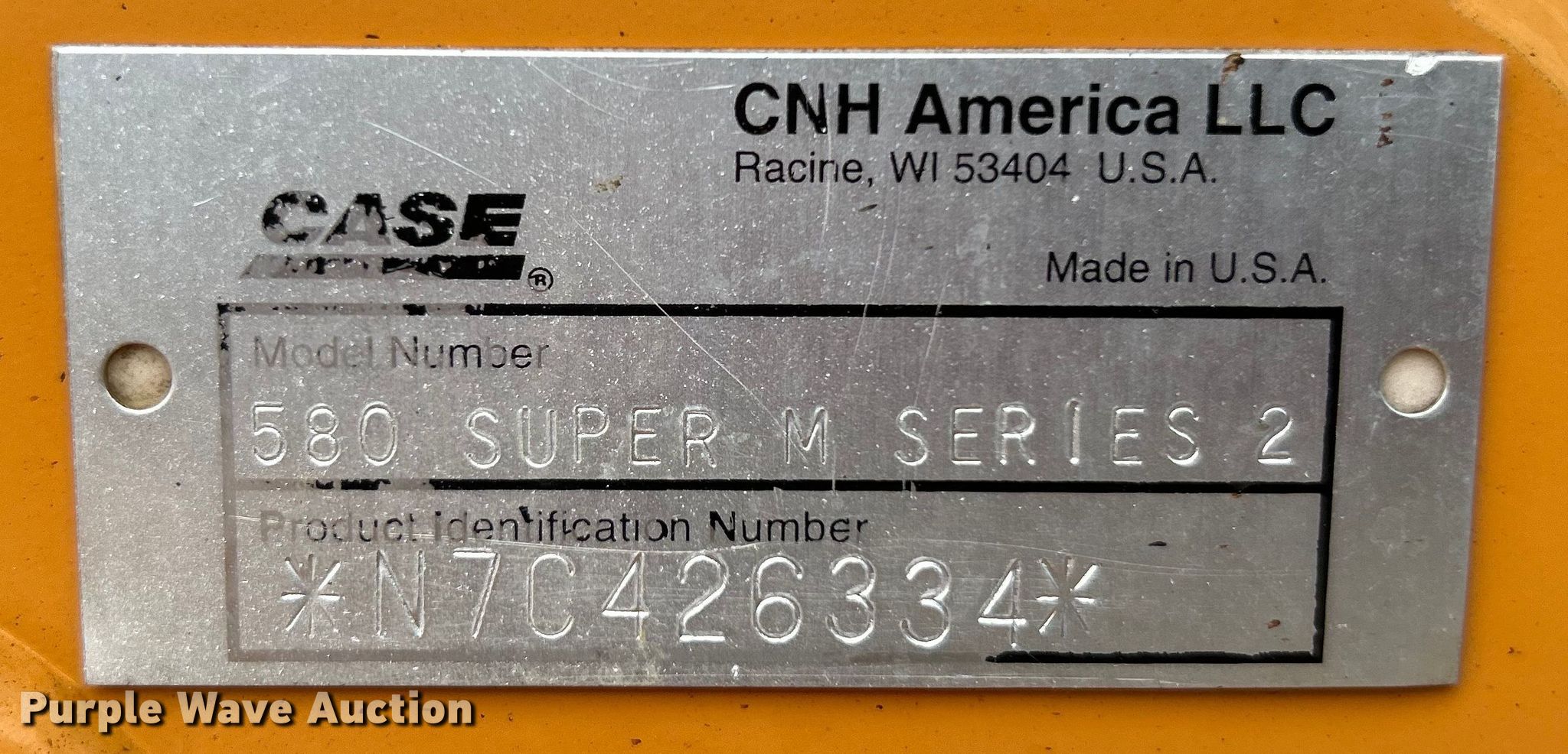 2007 Case 580 Super M Series 2 backhoe. Hours: 8,265 on meter, Serial: N7C426334. Engine Case, Cylinders: 4, Fuel type: Diesel. Transmission Powershift, 4F - 4R. Chassis Four wheel drive. Operators station Enclosed cab, Heat, Backhoe controls: Wobble stick / two stick. Features Loader Bucket Width: 81", Cutting edge: Bolt-on, Backhoe Extendable stick, Auxiliary hydraulics. Tires Front: 12x16.5 NHS, Rear: 500/70R24IND. 15107 North 137th East Avenue. Collinsville, OK 74021