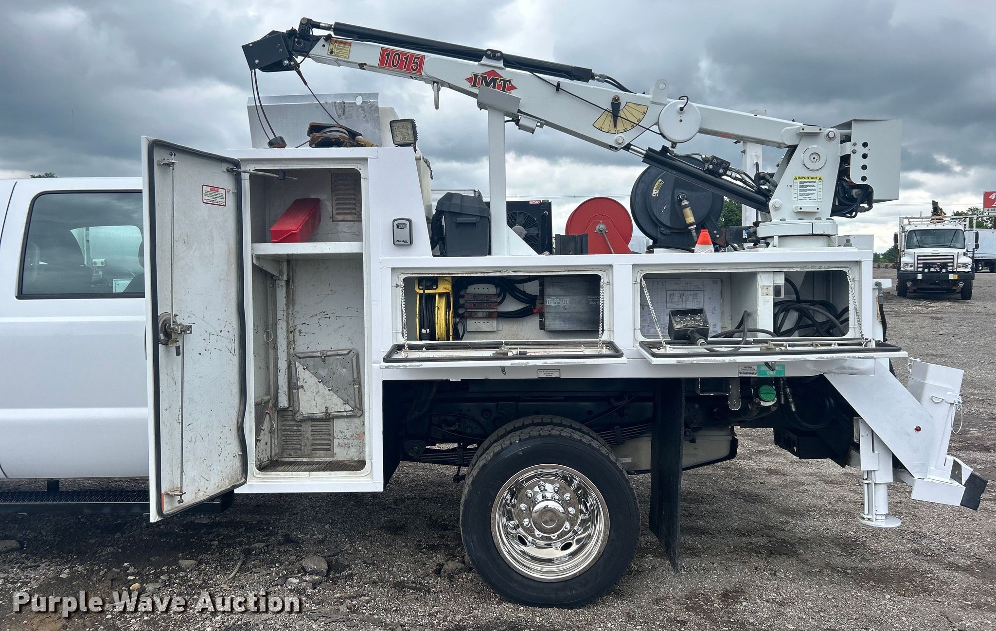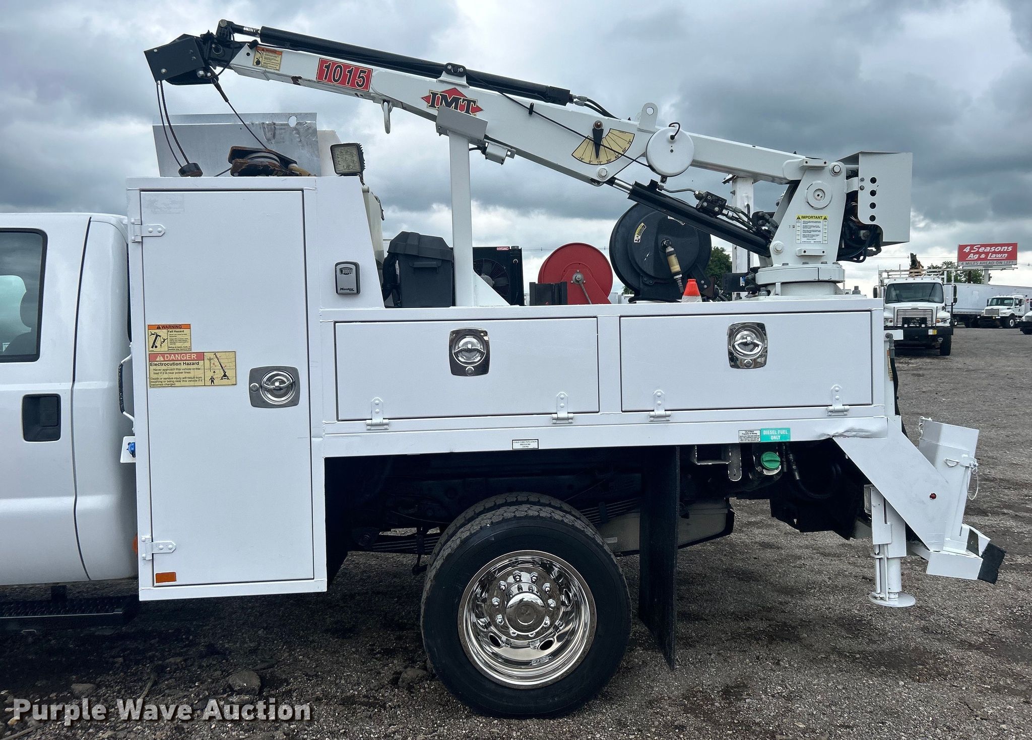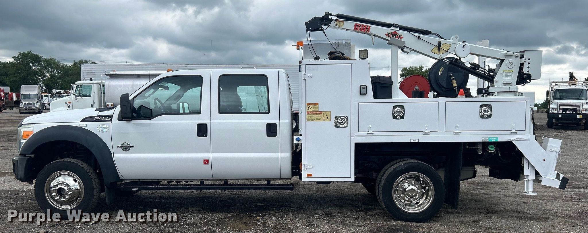 2015 Ford F550 Super Duty Crew Cab utility / service truck. Miles: 105,578 on odometer, VIN: 1FD0W5HT7FED00362. Engine Displacement: 6.7L, Cylinders: 8, Fuel type: Diesel. Transmission Automatic. Chassis Four wheel drive, Axles: Single, Suspension: Spring, Brakes: Hydraulic, PTO, GVWR: 19,500 lbs, Wheelbase: 176". Interior AC, Heat, Cruise control, Auxiliary controls, Brake controller, Back up camera. Features Bed 9' 2" L x 94" W, Oil/lube system Hose reels, Crane IMT 1015, Maximum boom length: 16' Maximum lift capacity: 3,200 lbs.. Tires Size: 225/70R19.5. Notes Windshield chipped or cracked. Oklahoma title. 15107 North 137th East Avenue. Collinsville, OK 74021