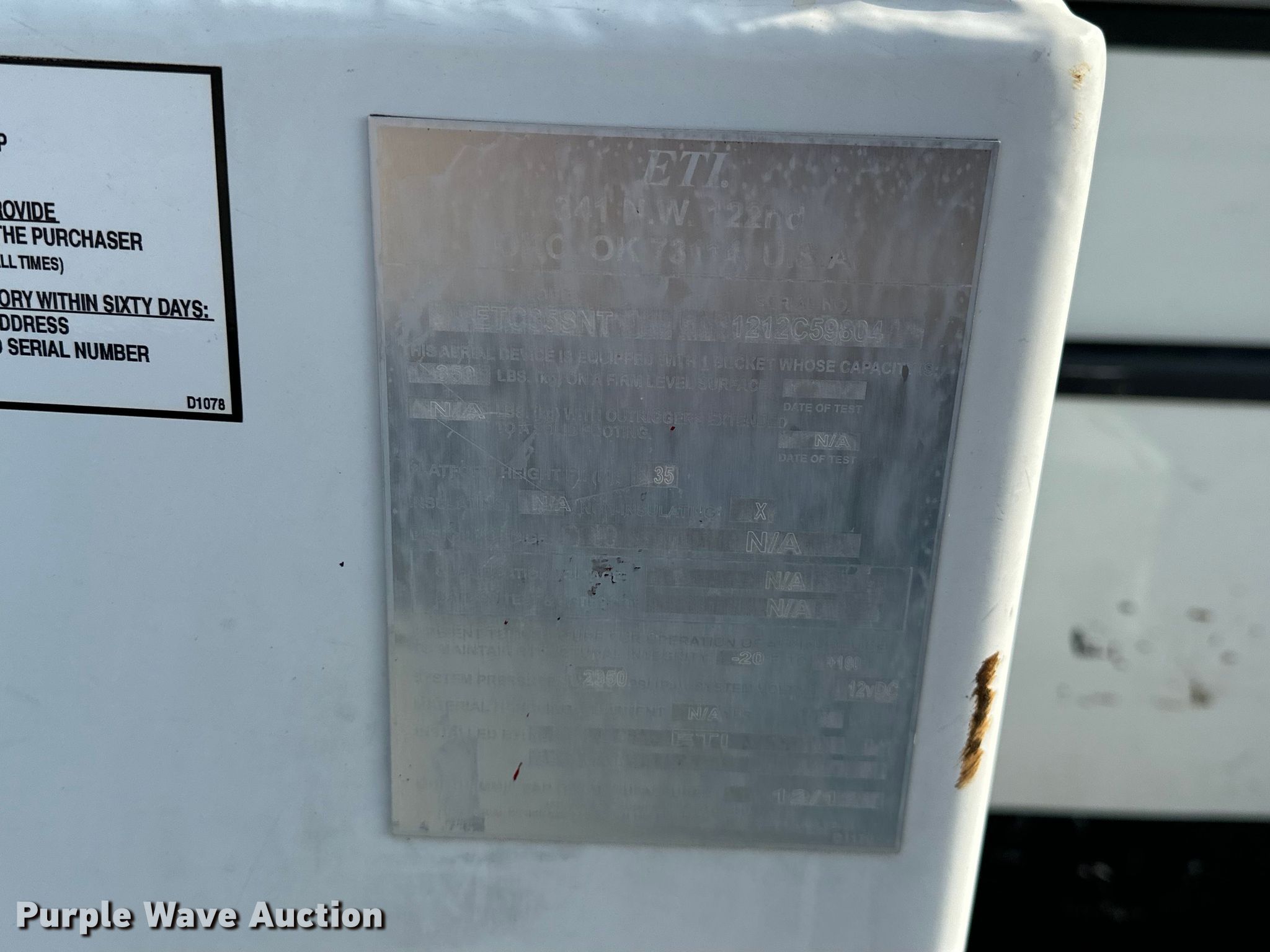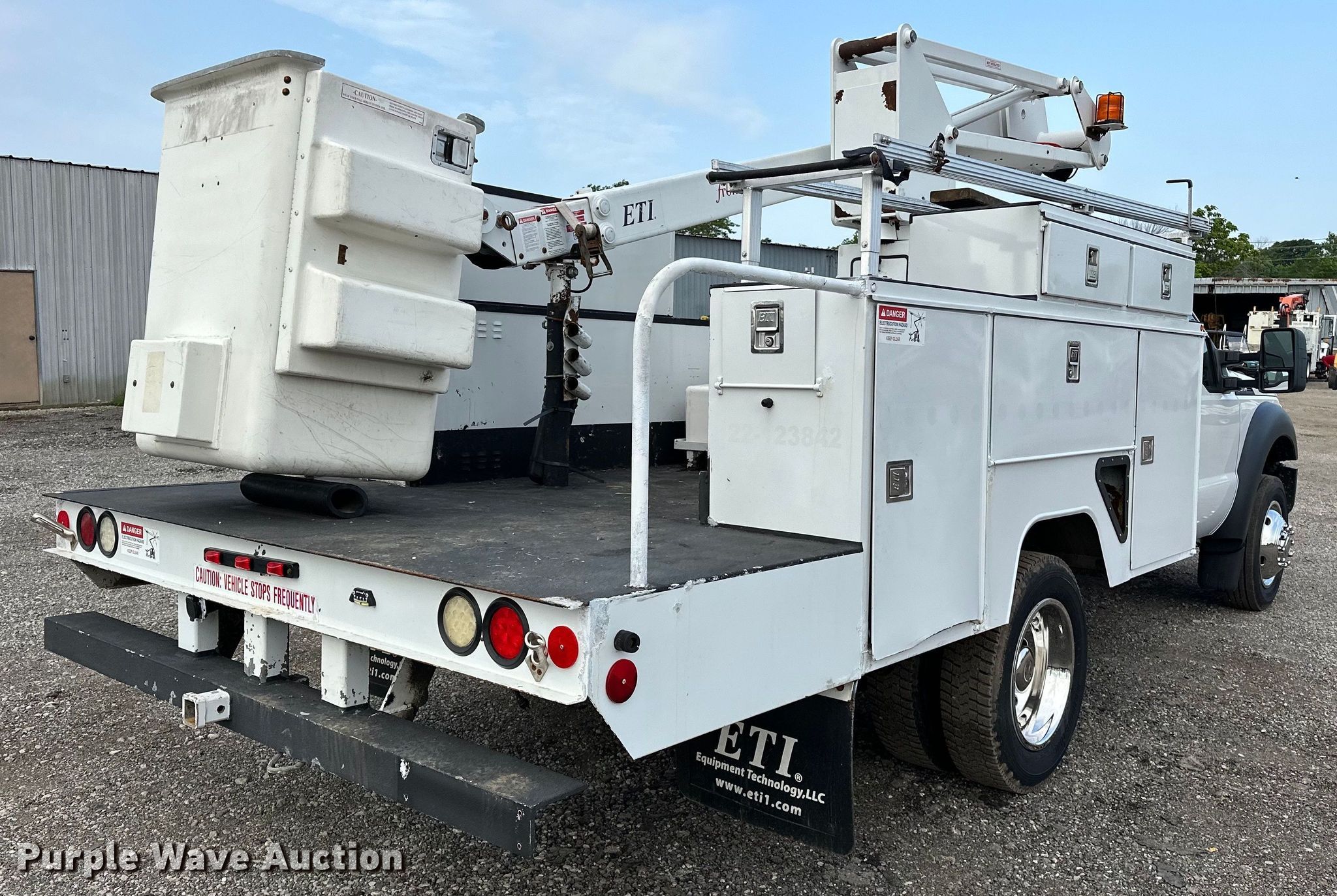 2012 Ford F450 Super Duty bucket truck. Miles: 188,621 on odometer, VIN: 1FDUF4GY2CED19759. Engine Displacement: 6.8L, Cylinders: 10, Fuel type: Gas. Transmission Automatic. Chassis Axles: Single, Suspension: Spring, Brakes: Hydraulic, GVWR: 16,500 lbs. Interior AC, Heat, Auxiliary controls. Features Bed ETI SB108DD96A40N, Serial: 15489, 12' 5" L x 96" W, Boom 2012 ETI ETC35SNT, Serial: 1212C59804, Boom length: 11', Mast height: 35', Maximum lift capacity: 350 lbs, Boom type: Articulating, Telescopic, Man basket, Boom controls Ground, Platform/ basket.. Tires Size: 225/70R19.5. Notes Dash warning indicator: Airbag, Windshield chipped or cracked. Oklahoma title. 15107 North 137th East Avenue. Collinsville, OK 74021