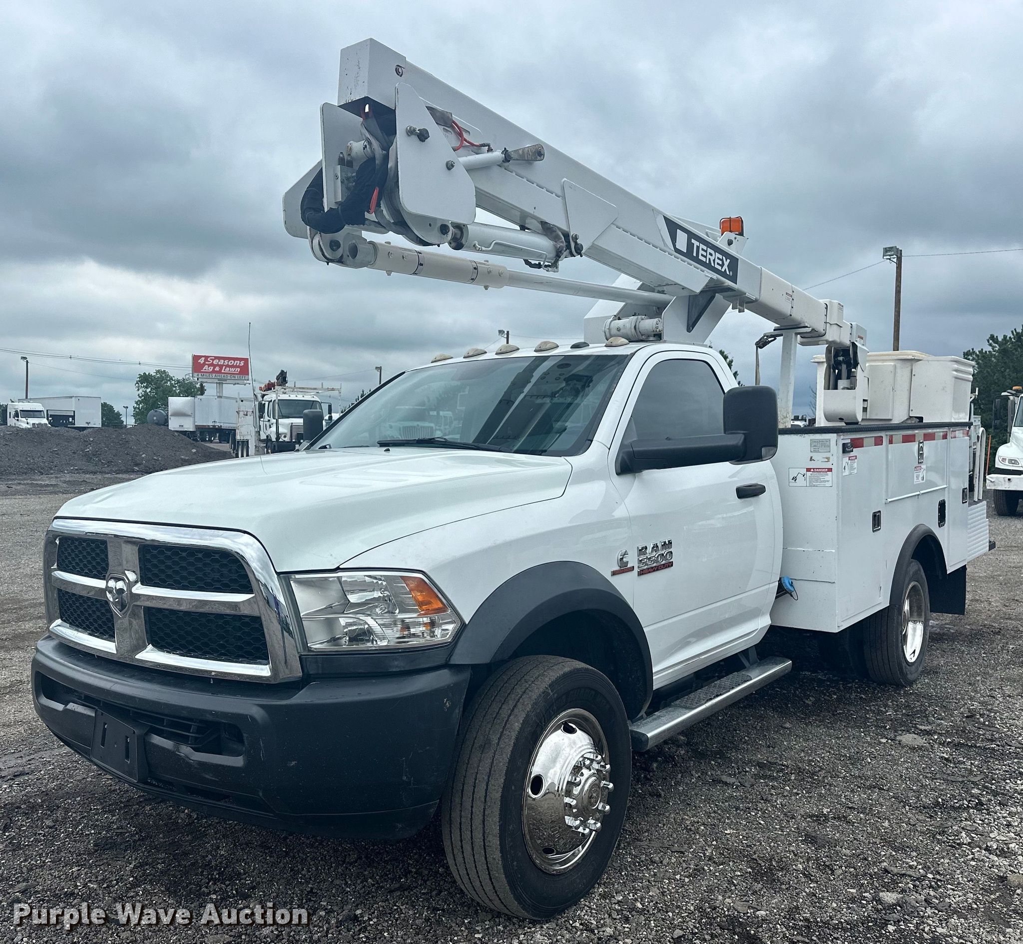 2015 Dodge Ram 5500HD bucket truck. Miles: 85,225 on odometer, VIN: 3C7WRNAL0FG706284. Engine Cummins, Displacement: 6.7L, Cylinders: 8, Fuel type: Diesel. Transmission Automatic. Chassis Four wheel drive, Axles: Single, Suspension: Spring, Brakes: Hydraulic, PTO, GVWR: 19,000 lbs. Interior AC, Heat, Heated mirrors, Power windows, Power locks, Cruise control, Auxiliary controls, Brake controller. Features Bed Dakota Bodies 108-SB, Serial: DB22382, 12' L x 94" W, Boom 2015 Terex Hi-Ranger LT40, Serial: 2150855165, Mast height: 40', Maximum lift capacity: 400 lbs, Boom type: Articulating, Insulated, Telescopic, Man basket, Boom controls Ground, Platform/ basket.. Tires Front: 225/70R19.5. Oklahoma title. 15107 North 137th East Avenue. Collinsville, OK 74021