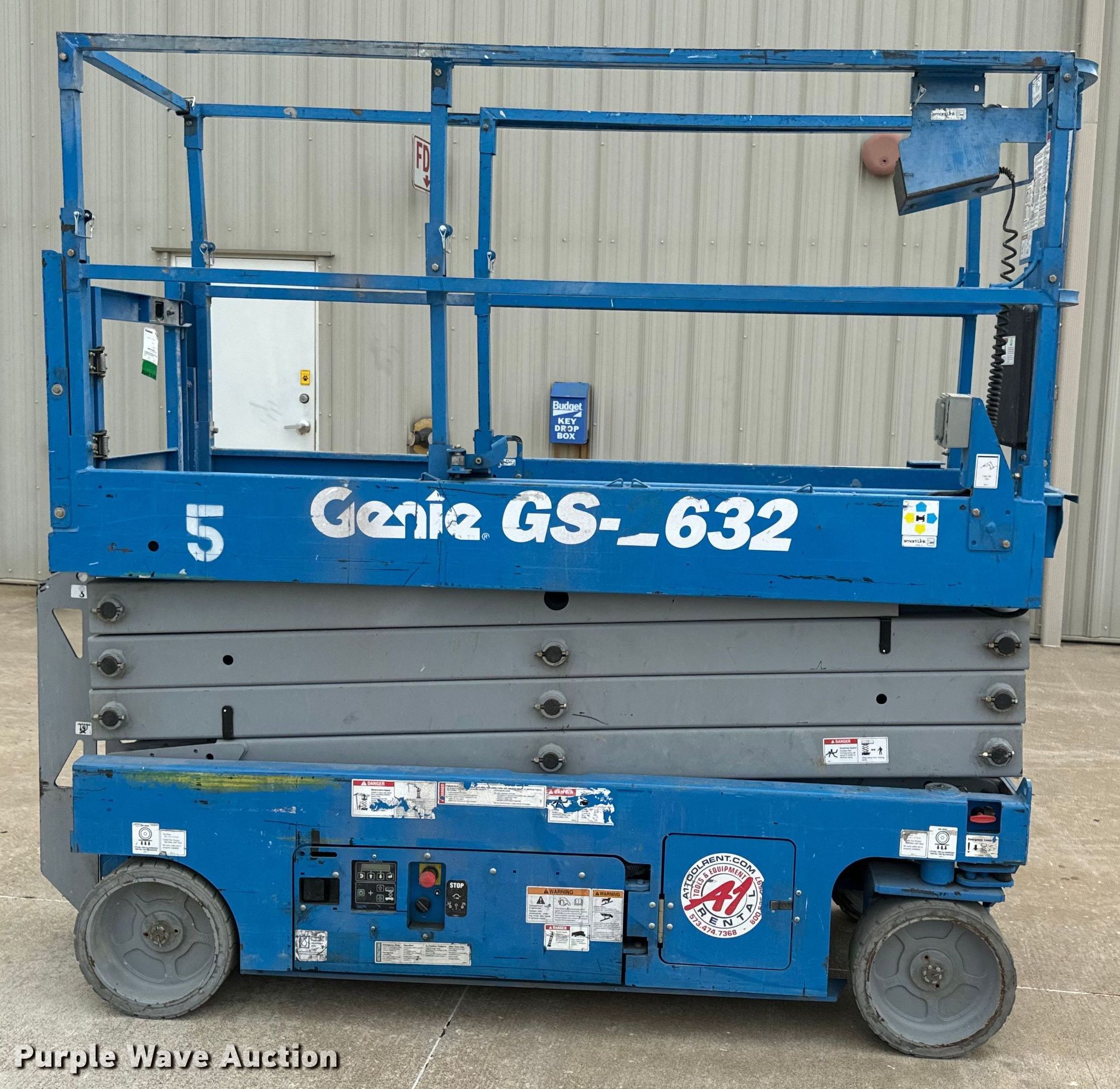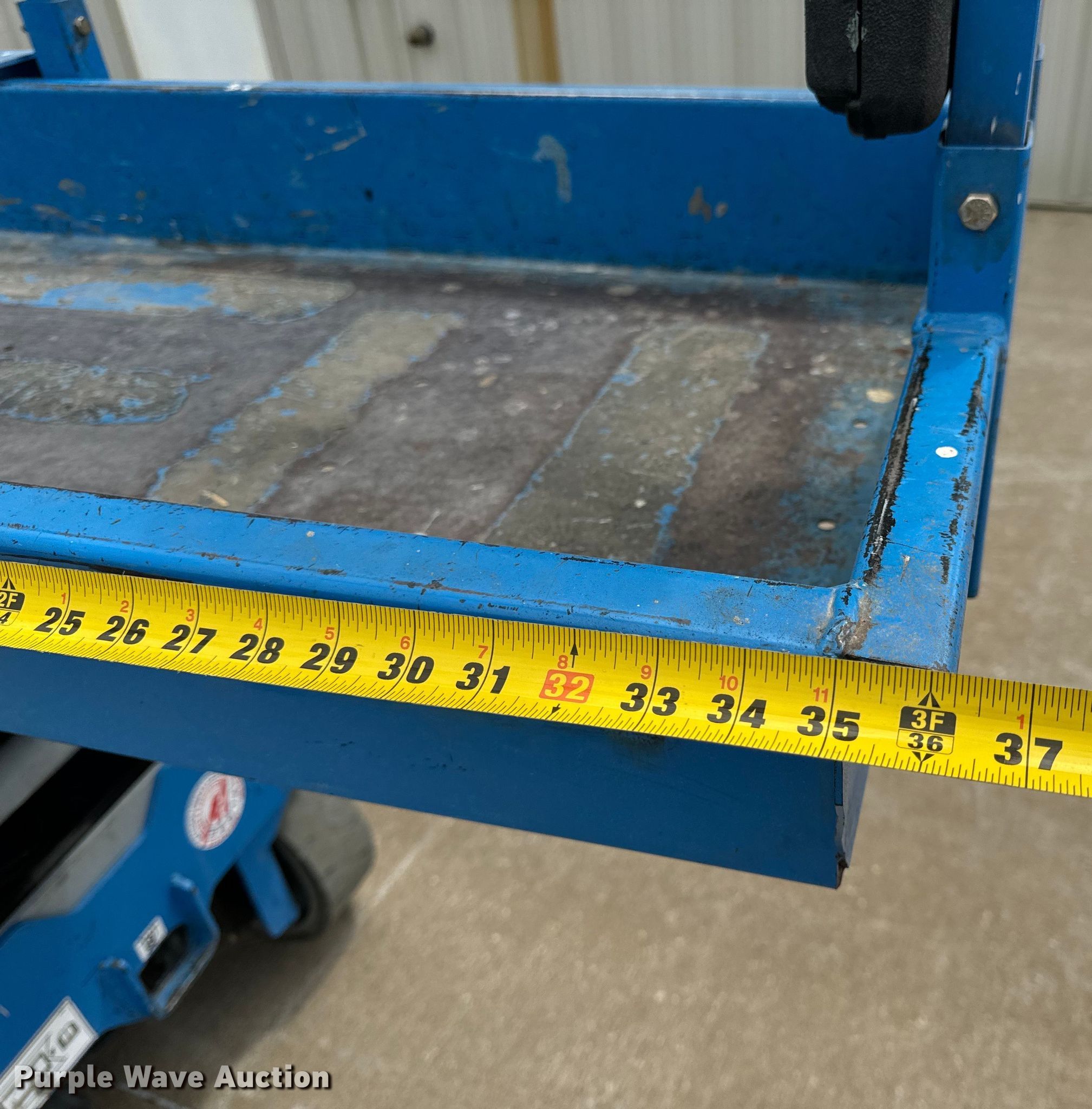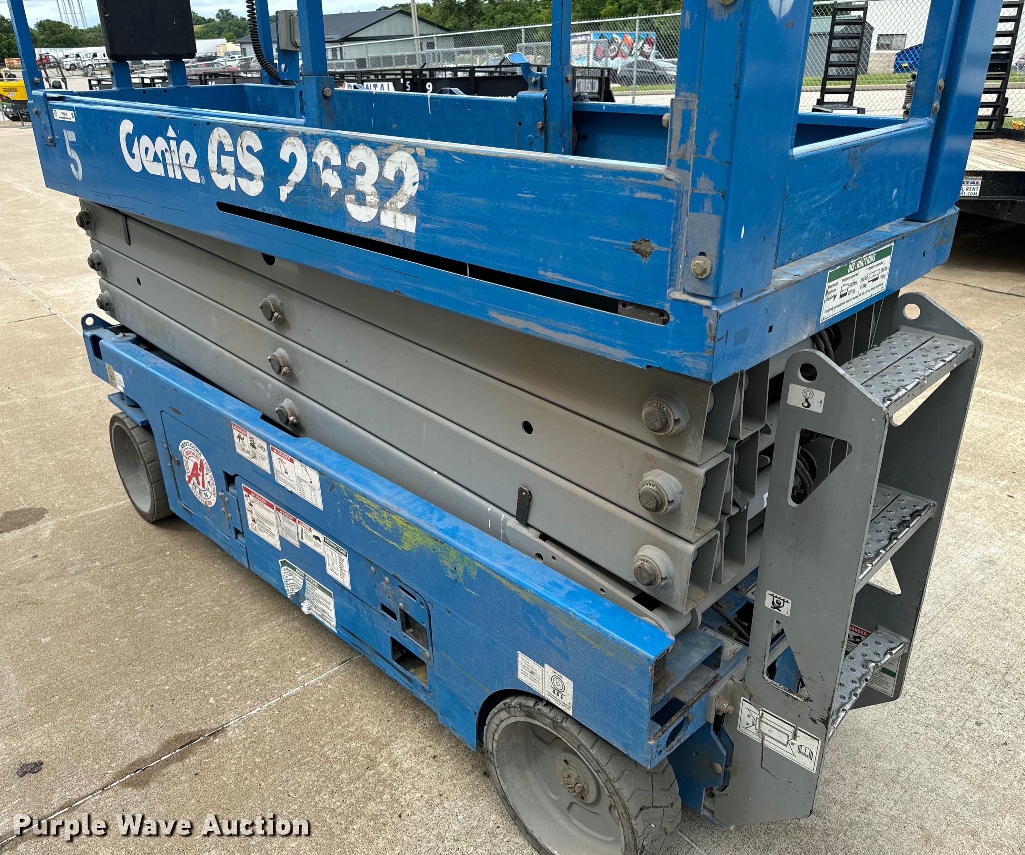 2015 Genie GS2632 scissor lift. Hours: 257 on meter, Serial: GS3215A-138123. Electric Motor Volts: 24. Features Maximum lift capacity: 500 lbs, Maximum lift height: 26', Platform: 125" L x 32" W, AC power outlet, Controls: Remote Control, Ground, Platform extensions: Manual, Safety alarm. Tires Tire size: 15X5, Solid, Non-marking. A-1 Tool & Equipment Rental. Jefferson City, MO 65101