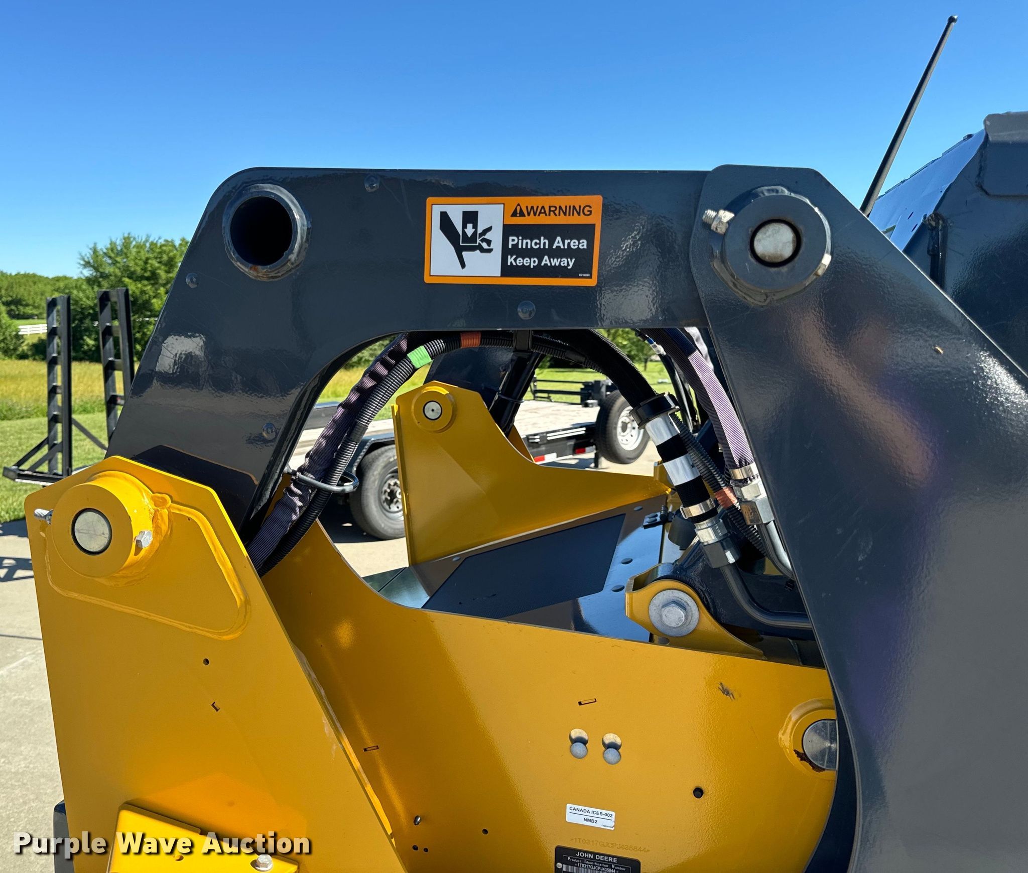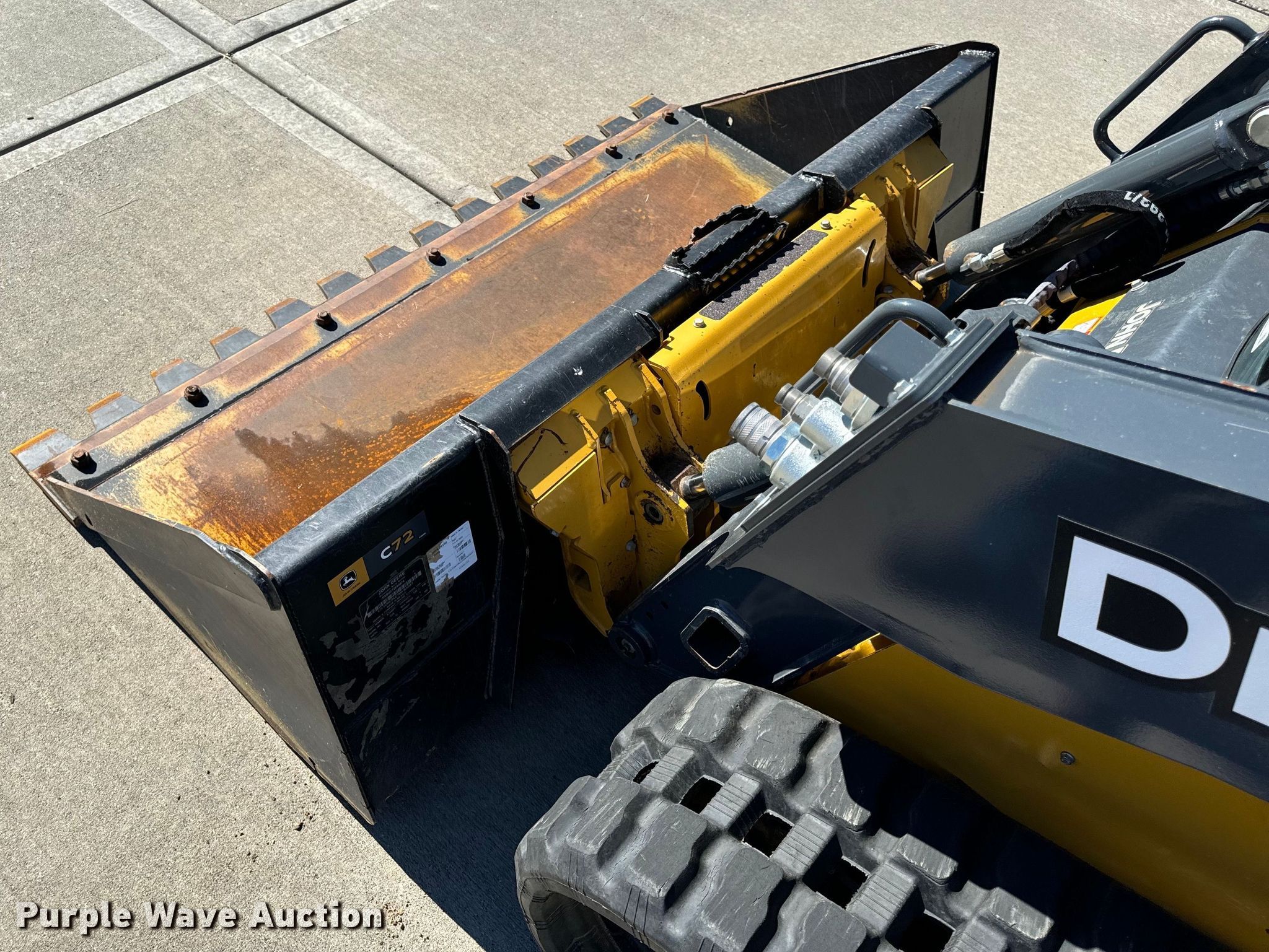 2023 John Deere 317G tracked skid steer loader. Hours: 140 on meter, Serial: 1T0317GJCPJ435844. Engine Yanmar 4RHMAC, Serial: 067113, Cylinders: 4, Fuel type: Diesel. Transmission Hydrostatic. Operators station Enclosed cab, AC, Heat, Bucket control: Hand. Features Auxiliary hydraulics, Auxiliary electrical outlet, Quick coupler: Hydraulic, Counter weights, Bucket John Deere C72, Width: 72", Low profile, Teeth: Bolt-on. Tracks Width: 12.5". Raymore, MO 64083