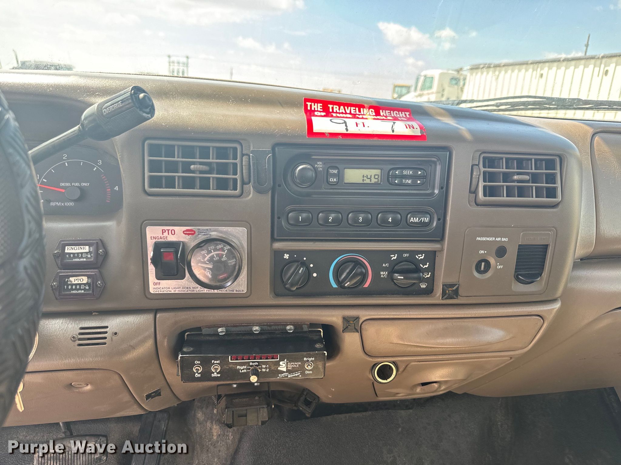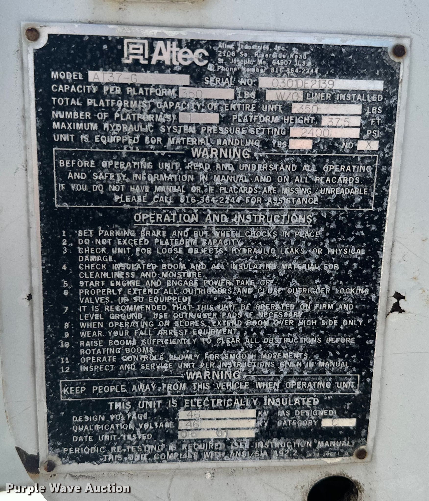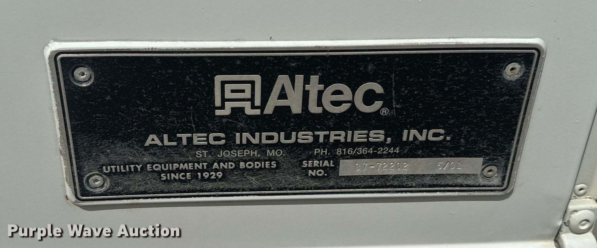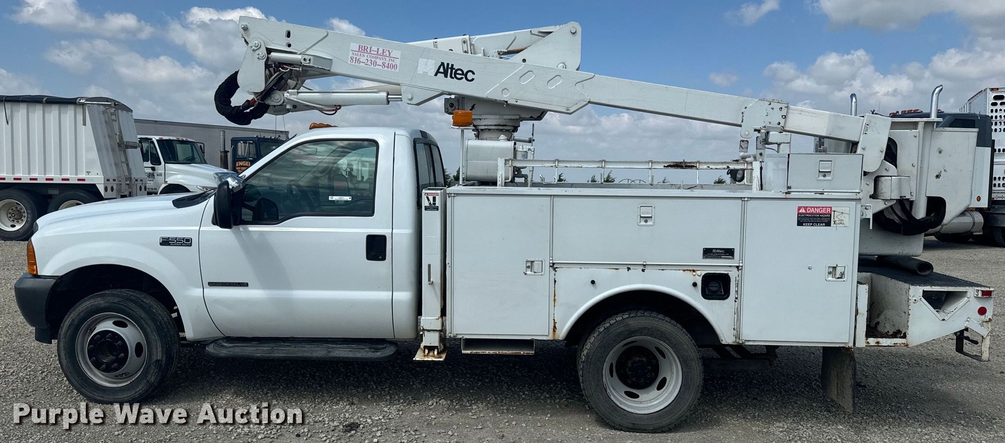 2001 Ford F550 Super Duty XL bucket truck. Miles: 140,118 on odometer, Hours: 5,913 on meter, VIN: 1FDAF56F21EC24561. Engine Displacement: 7.3L, Cylinders: 8, Fuel type: Diesel. Transmission Automatic. Chassis Axles: Single, Suspension: Spring, Brakes: Hydraulic, PTO, GVWR: 17,500 lbs, Wheelbase: 141". Interior AC, Heat, Cruise control, Auxiliary controls, Brake controller. Features Bed Altec, 11' 6" L x 94" W, Boom Altec AT37-G, Maximum lift capacity: 350 lbs, Maximum lift height: 37.5', Boom type: Articulating, Man basket, Boom controls Ground, Platform/ basket.. Tires Size: 225/70R19.5. Notes Dash warning indicator: Brake, Unknown operating condition of driver side outrigger. Kansas title. Title distribution may be delayed up to 30 days from verification of funds. Flying Z Repair. Abilene, KS 67410