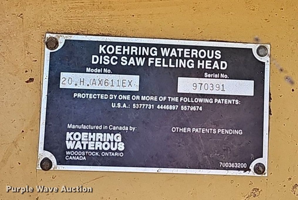 2000 Hydro Ax 511EX feller buncher. Hours: 8,002 on meter, Serial: 7514. Engine John Deere 6068, Cylinders: 6, Fuel type: Diesel. Transmission Hydrostatic. Chassis Differential lock. Operators station Enclosed cab, AC, Heat, Controls: Joystick. Features Felling head Koehring Waterous 20.H.AX611EX, Serial: 970391, Throat opening: 40". Tires Rear: 28-26. Notes Unit has ben vandalized Wiring issues, cut, Non-operational brakes, Non-operational reverse, Non-operational AC, Possible hydraulic issue Unknown operating condition of disc felling head. Progressive Ozark Bank. Montgomery Township, MO 65660
