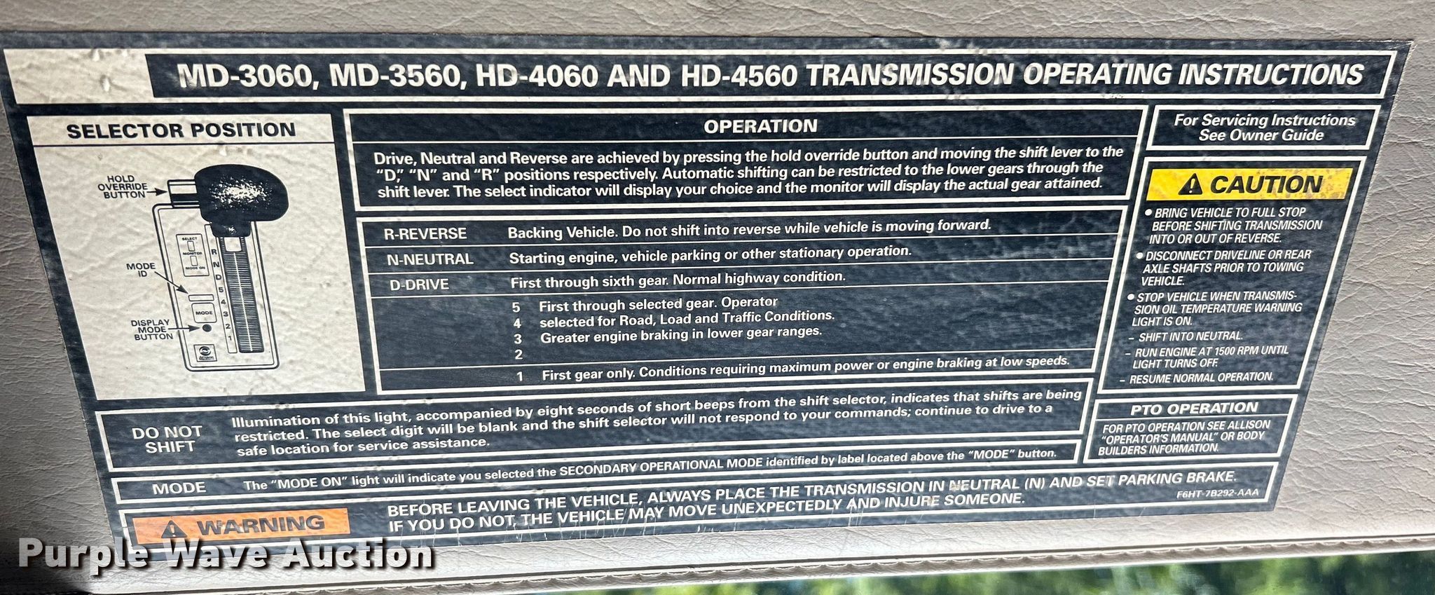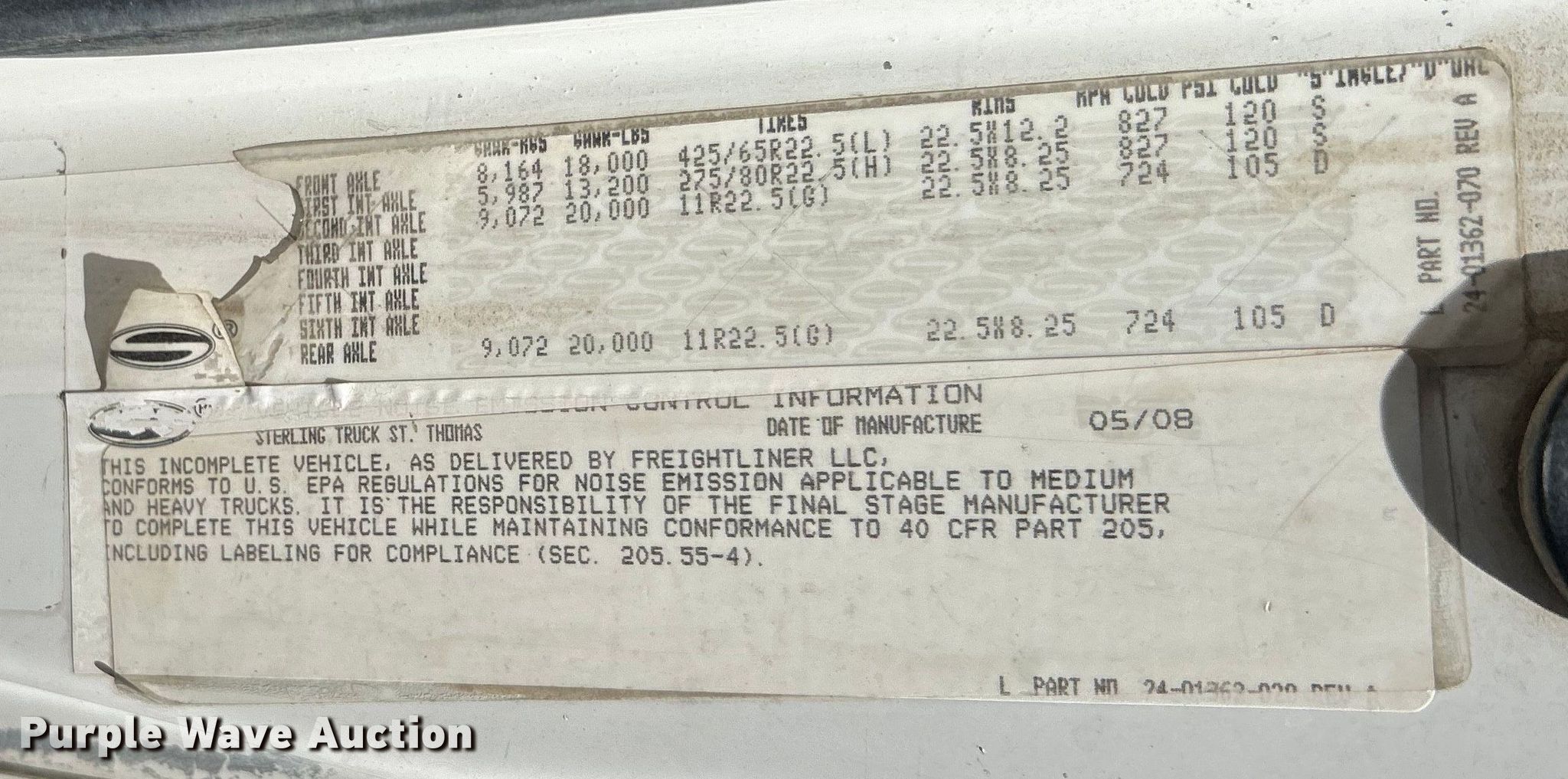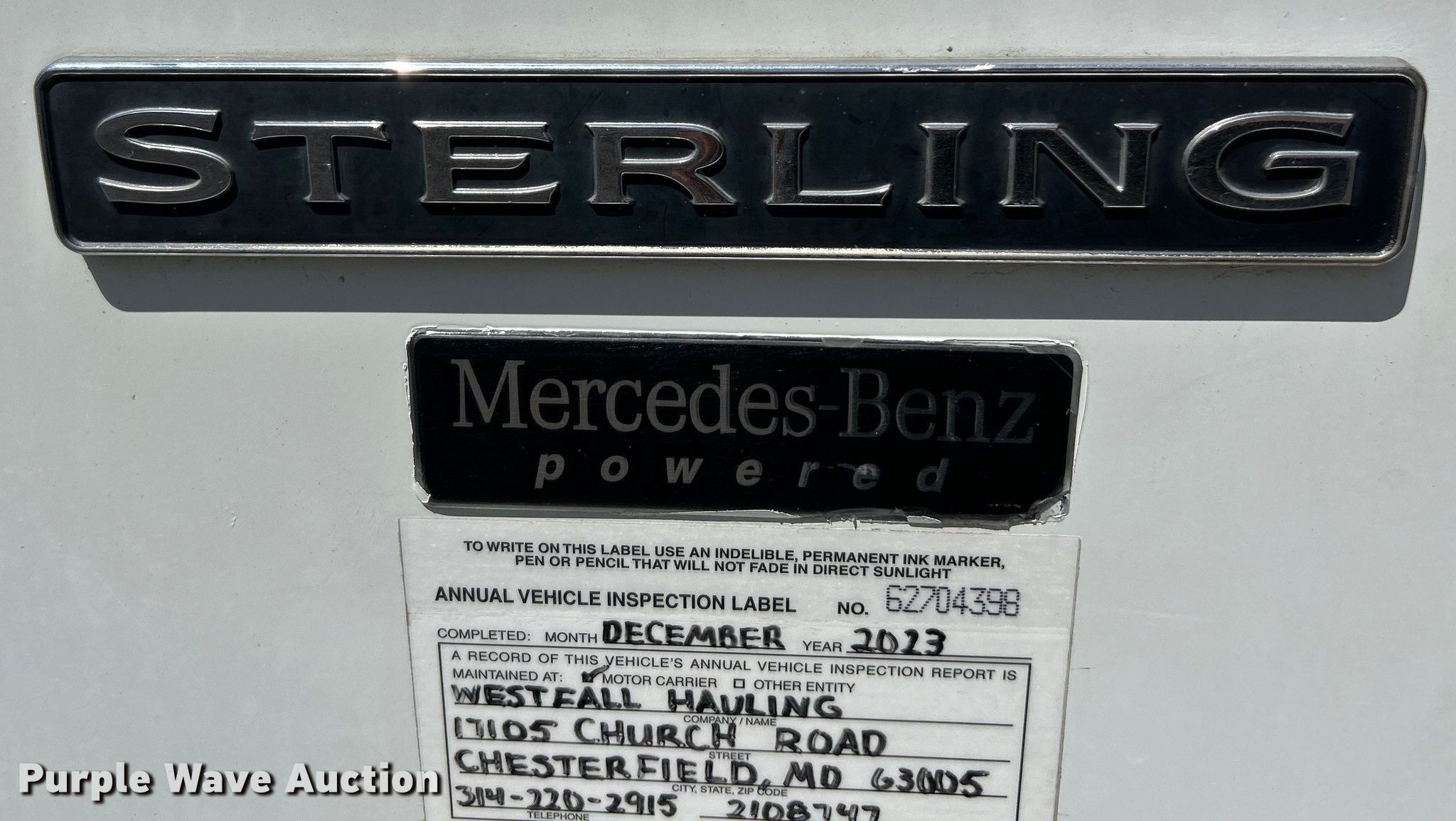 2009 Sterling L9500 dump truck. Miles: 549,768 on odometer, Hours: 20,063 on meter, VIN: 2FZMAZCV39AAD6486. Engine Mercedes-Benz OM 460, Displacement: 12.8L, Cylinders: 6, Fuel type: Diesel, Engine brake. Transmission Allison, Automatic. Chassis Axles: Tandem, Pusher axle, Differential lock: Full, Suspension: Spring over walking beam, Brakes: Air, PTO, GVWR: 68,000 lbs FAWR: 18,000 lbs, IAWR: 20,000 lbs, RAWR: 20,000 lbs, Lift axle GAWR: 13,200 lbs. Interior AC, Heat, Heated mirrors, Power windows, Cruise control. Features Dump bed 16' L x 96" W, Side height: 55", Bed type: Barrel, Roll tarp, Ram: Single, End gate: Air operated. Tires Front: 425/65R22.5, Rear: 11R22.5, Lift axle: 295/75R22.5. Notes Dead battery. Missouri title. Westfall Hauling Inc. Wildwood, MO 63005