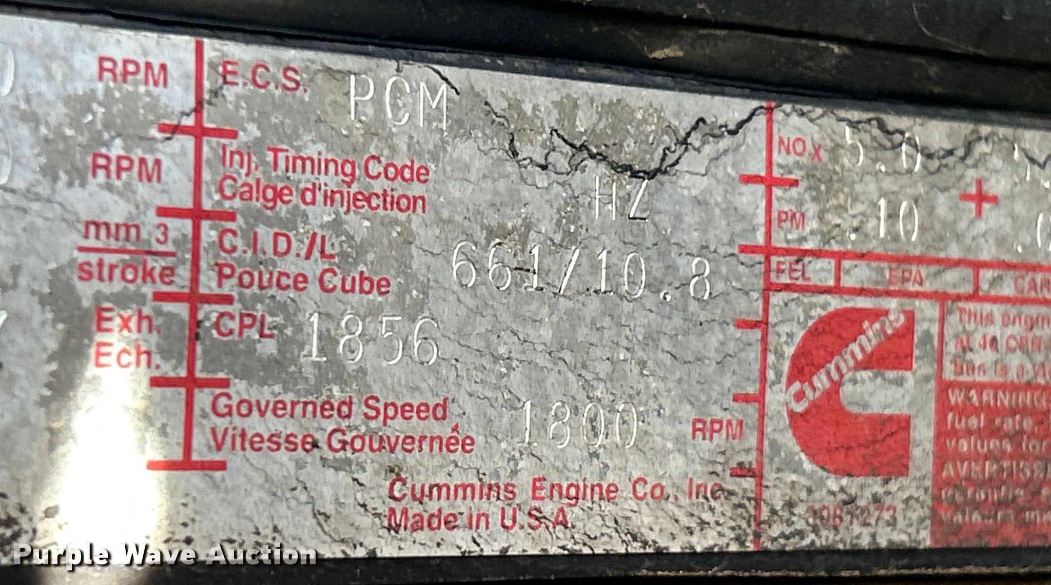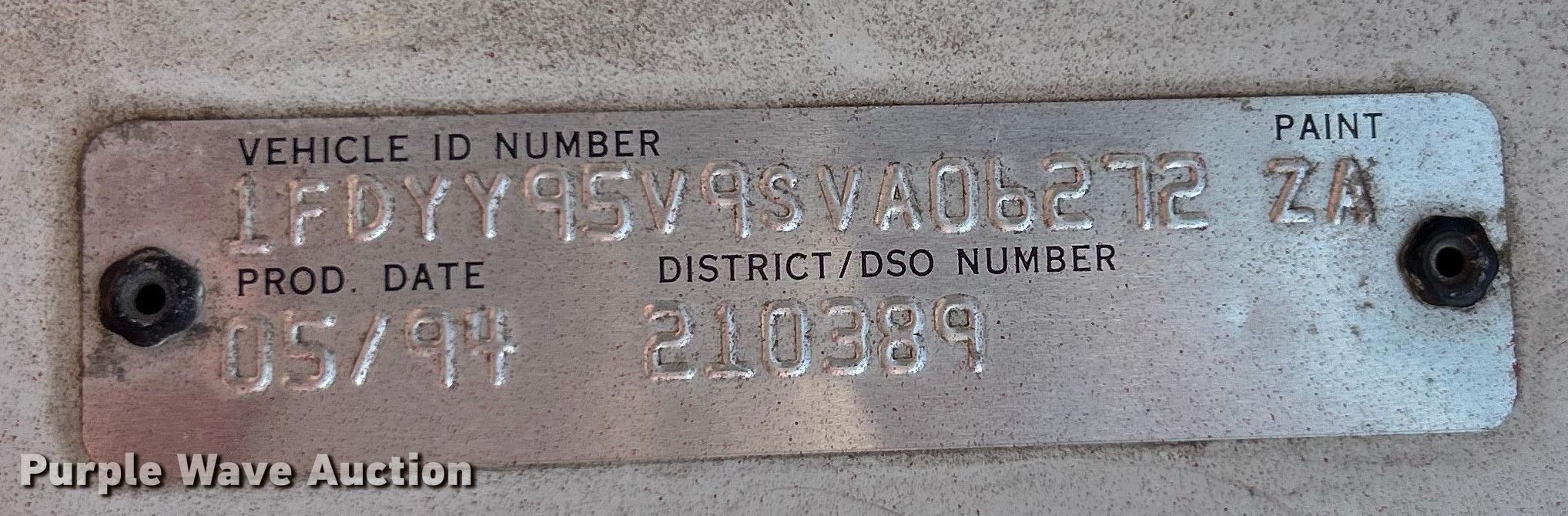 1995 Ford Aeromax L9000 dump truck. Miles: 61,537 on odometer Actual mileage unknown, VIN: 1FDYY95V9SVA06272. Engine Cummins M11, Displacement: 10.8L, Cylinders: 6, Fuel type: Diesel. Transmission Manual. Chassis Double frame, Axles: Tandem, Suspension: Spring, Brakes: Air, PTO, GVWR: 48,000 lbs FAWR: 12,000 lbs, RAWR: 36,000 lbs, Wheelbase: 151". Interior AC, Heat, Heated mirrors, Cruise control, Brake controller, Power passenger window. Features Dump bed 15' L x 96" W, Side height: 48", Bed type: Steel, Roll tarp, Ram: Single, End gate: Air operated. Tires Front: 315/80R22.5, Rear: 11R22.5. Notes Odometer and ECM replaced, Windshield chipped or cracked. Missouri title. Bacchus Concrete and Const.. Wright City, MO 63390