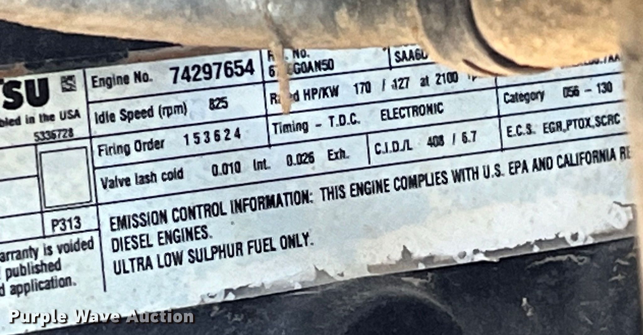 2018 Komatsu WA320-8 wheel loader. Hours: 5,911 on meter, Serial: A38465. Engine Komatsu SAA6D107E-3-A, Displacement: 6.7L, Cylinders: 6, Fuel type: Diesel. Transmission Powershift, 4F - 4R. Operators station Enclosed cab, AC, Heat, Bucket controls: Joystick. Features Quick coupler: Hydraulic, Bucket JRB, Width: 108", Self- leveling bucket, Cutting edge: Bolt-on. Tires Size: 20.5R25. Notes Non-operational climate control. Hoover Rental and Sales. Cantril, IA 52542