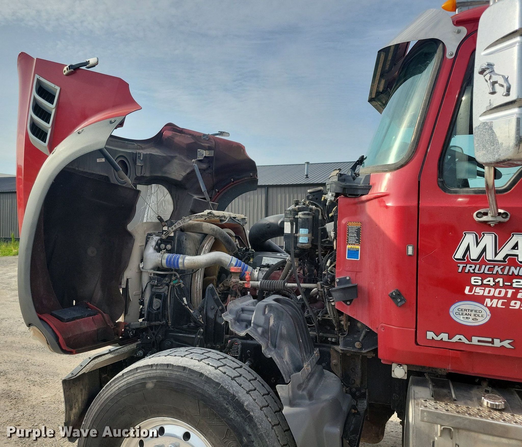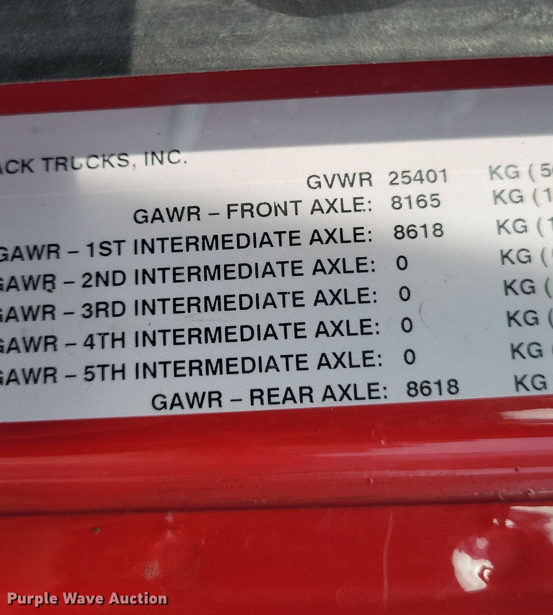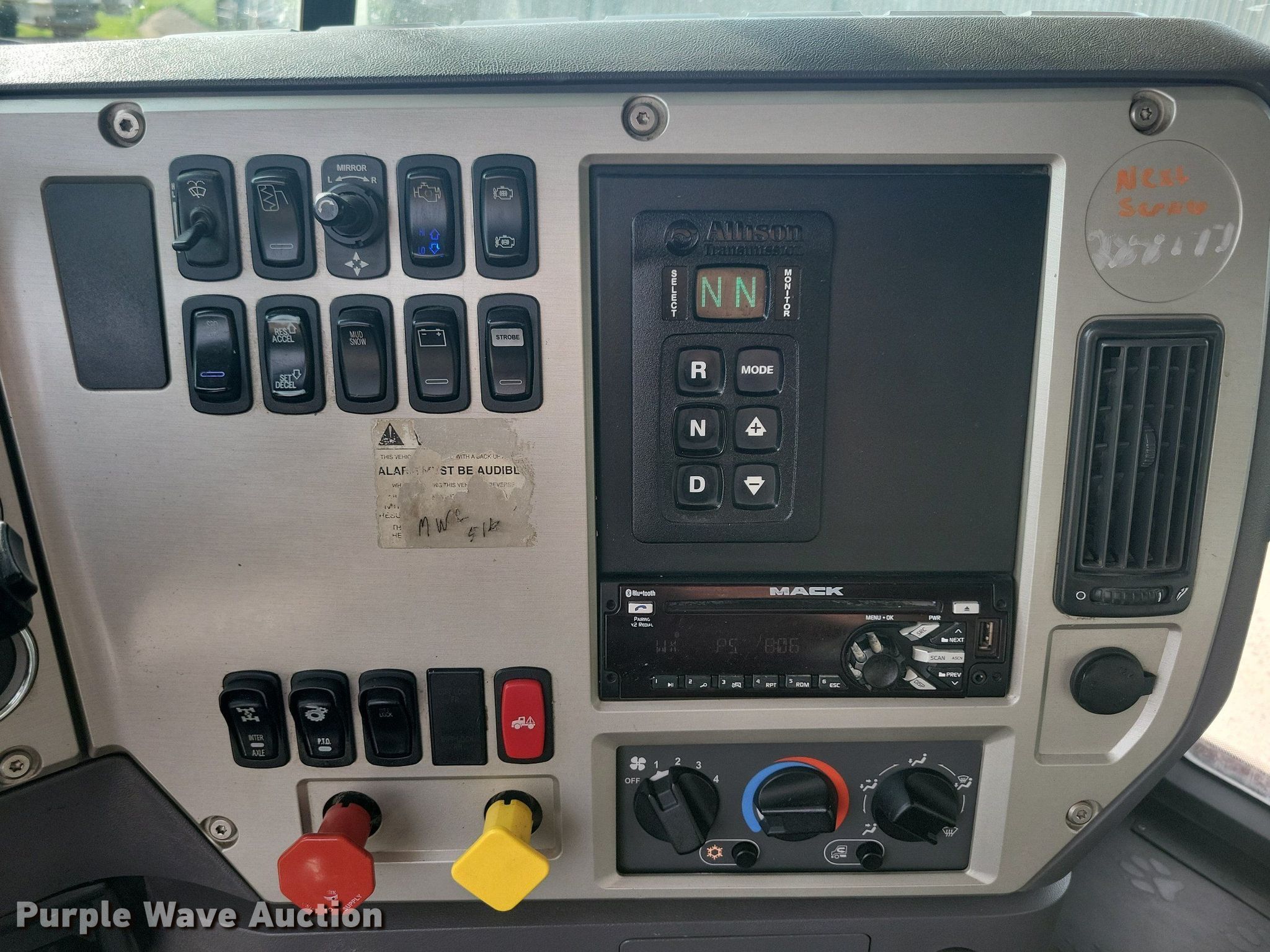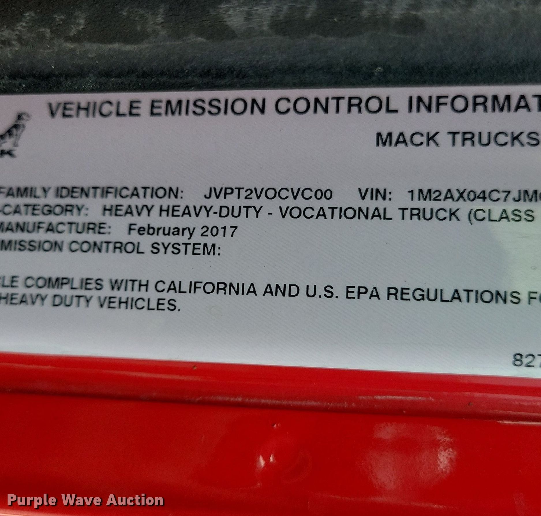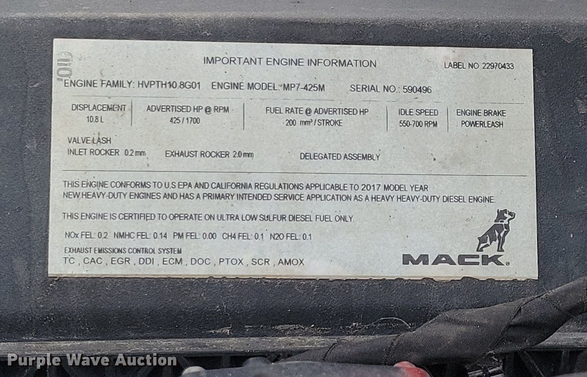 2018 Mack GU713 dump truck. Miles: 318,887 on odometer, Miles or hours may vary, unit still in use, Hours: 12,405 on meter, VIN: 1M2AX04C7JM037430. Engine Mack MP-7, Serial: 590496, Displacement: 10.8L, Cylinders: 6, Fuel type: Diesel, HP: 425, Engine brake. Transmission Allison, Automatic. Chassis Axles: 4, Pusher axle Steerable, Differential lock: Inter-axle, Suspension: Camelback, Brakes: Air, PTO, GVWR: 56,000 lbs FAWR: 18,000 lbs, IAWR: 19,000 lbs, RAWR: 19,000 lbs. Interior AC, Heat, Heated mirrors, Power windows, Cruise control, Brake controller. Features Dump bed J Craft, 19' L x 96" W, Side height: 42", Side board height: 8", Bed type: Steel, Bed vibrator, Ram: Single, End gate: Air operated, Double wall. Tires Front: 425/65R22.5, Rear: 11R22.5, Lift axle: 255/70R22.5. Notes Non-operational bed vibrator. Iowa title. TK Concrete Inc. Pella, IA 50219