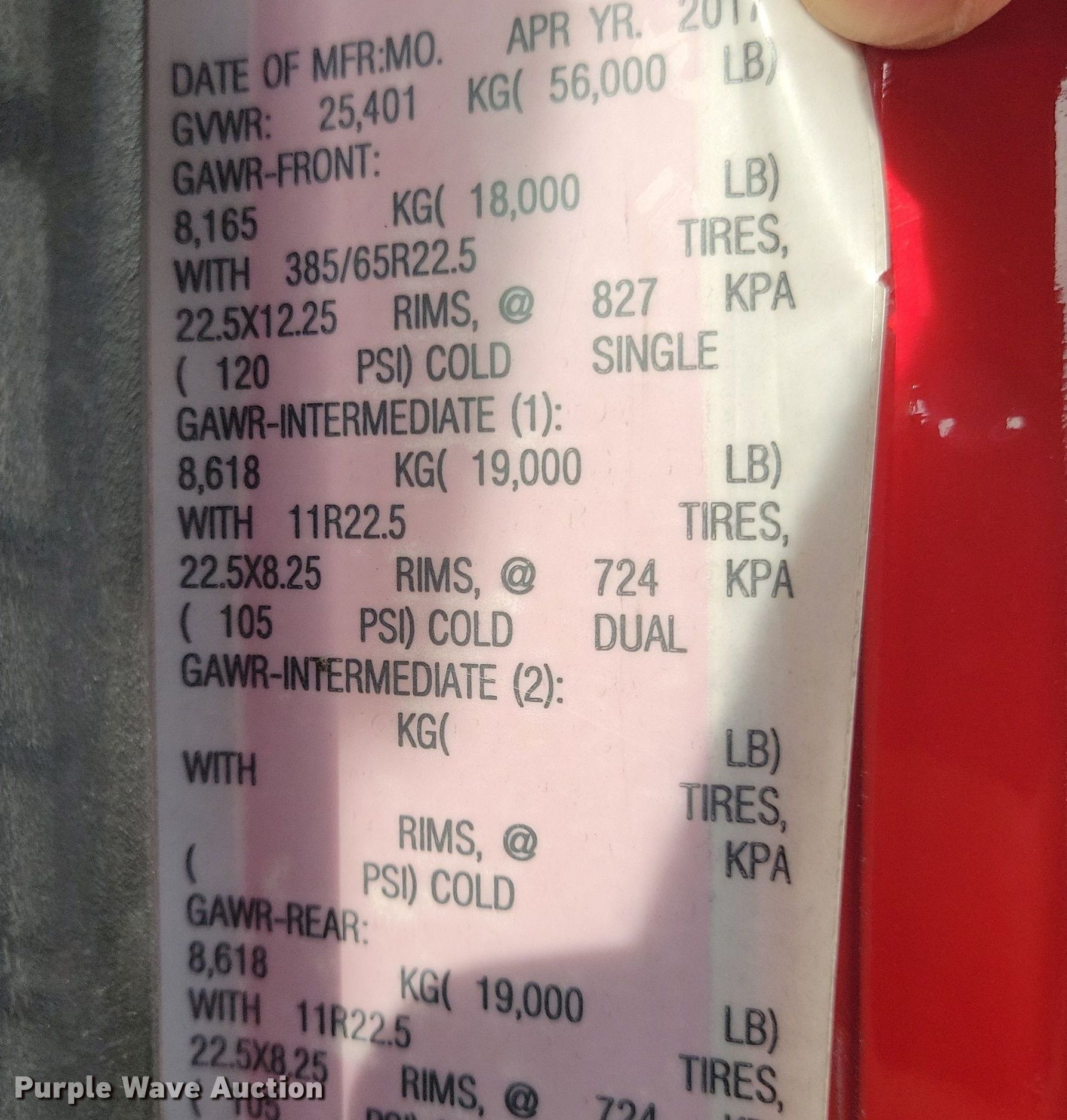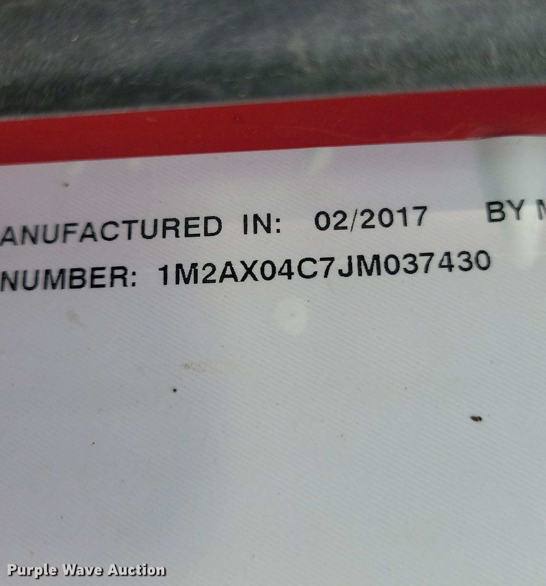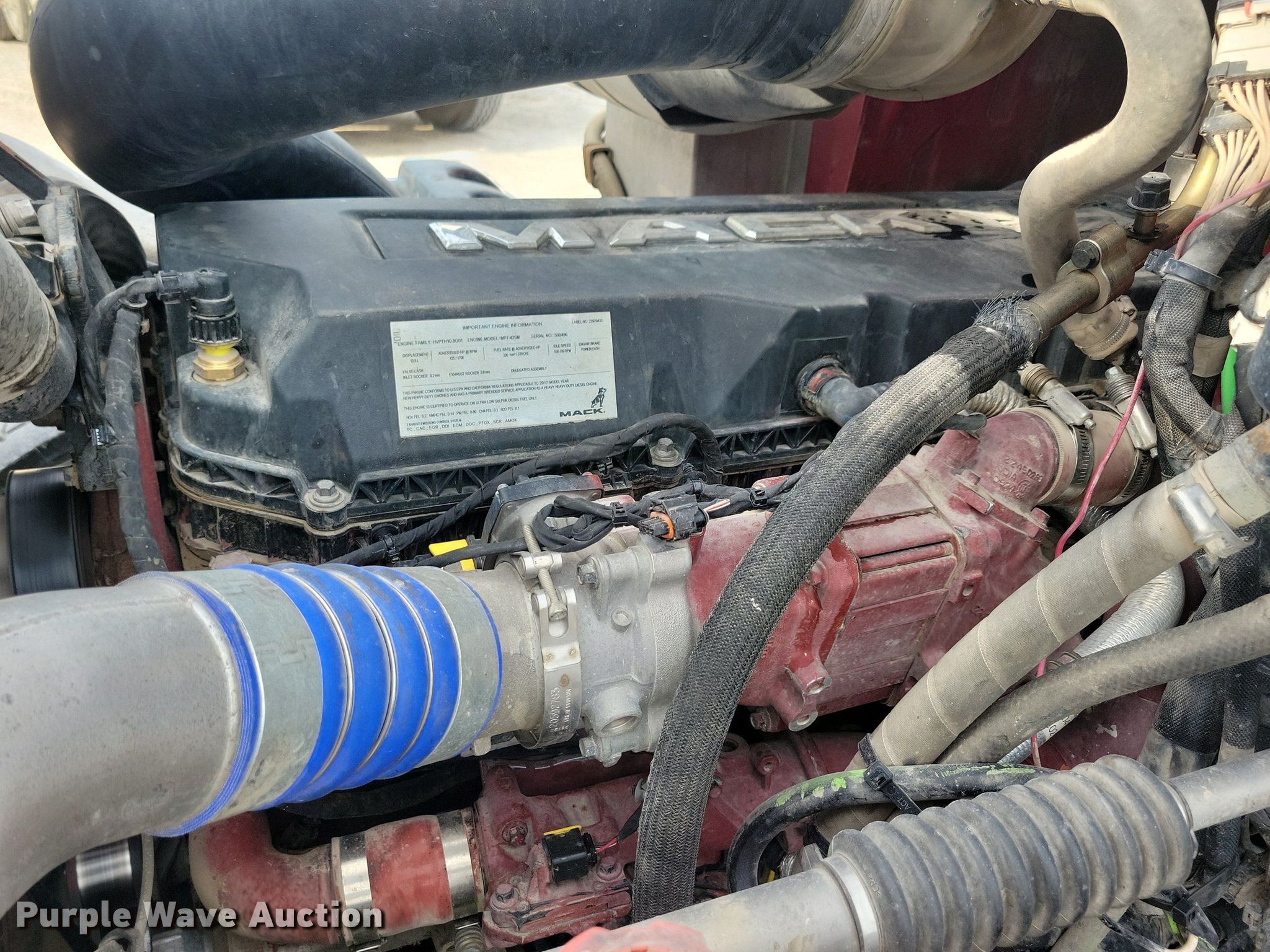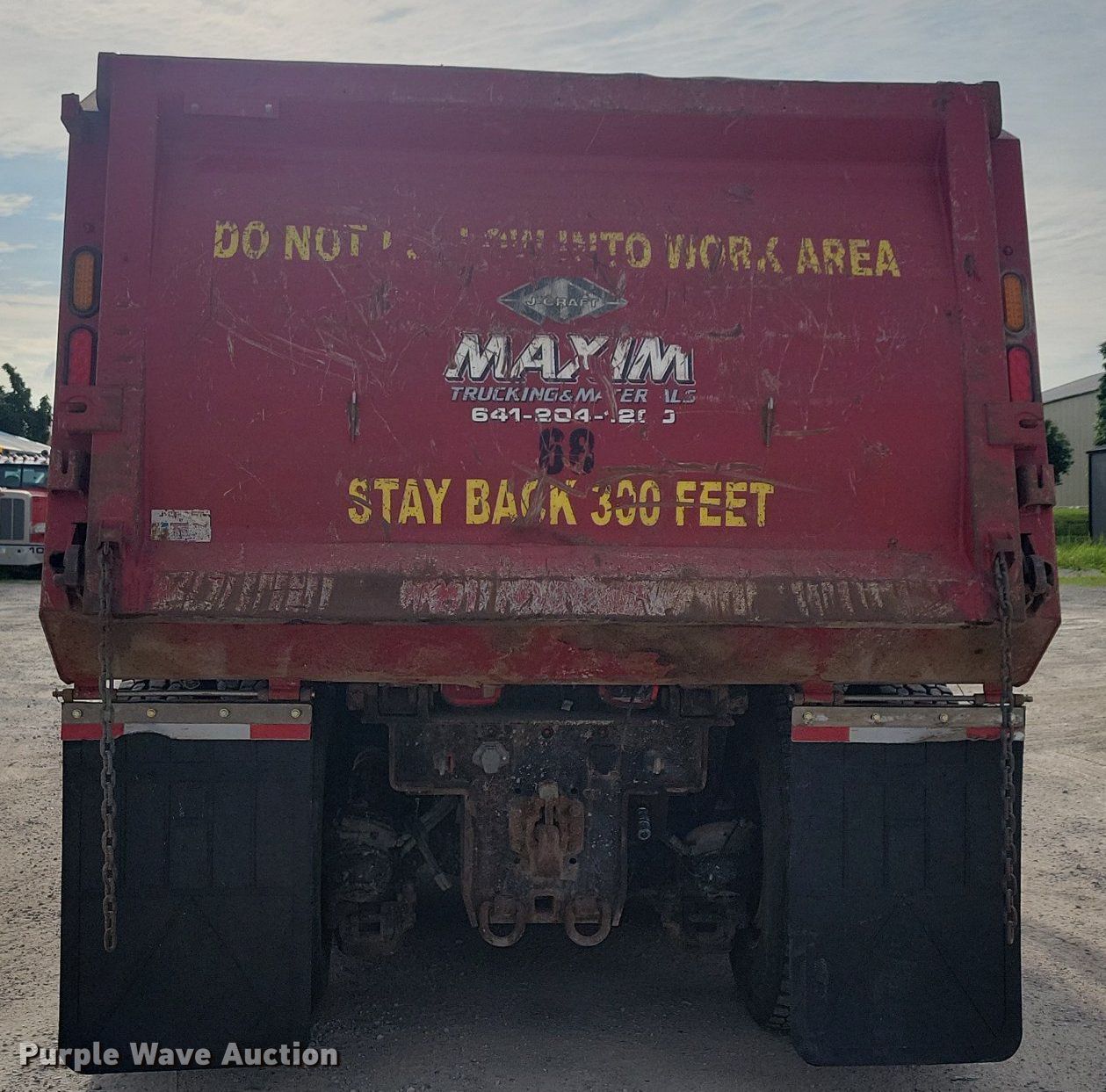 2018 Mack GU713 dump truck. Miles: 318,887 on odometer, Miles or hours may vary, unit still in use, Hours: 12,405 on meter, VIN: 1M2AX04C7JM037430. Engine Mack MP-7, Serial: 590496, Displacement: 10.8L, Cylinders: 6, Fuel type: Diesel, HP: 425, Engine brake. Transmission Allison, Automatic. Chassis Axles: 4, Pusher axle Steerable, Differential lock: Inter-axle, Suspension: Camelback, Brakes: Air, PTO, GVWR: 56,000 lbs FAWR: 18,000 lbs, IAWR: 19,000 lbs, RAWR: 19,000 lbs. Interior AC, Heat, Heated mirrors, Power windows, Cruise control, Brake controller. Features Dump bed J Craft, 19' L x 96" W, Side height: 42", Side board height: 8", Bed type: Steel, Bed vibrator, Ram: Single, End gate: Air operated, Double wall. Tires Front: 425/65R22.5, Rear: 11R22.5, Lift axle: 255/70R22.5. Notes Non-operational bed vibrator. Iowa title. TK Concrete Inc. Pella, IA 50219