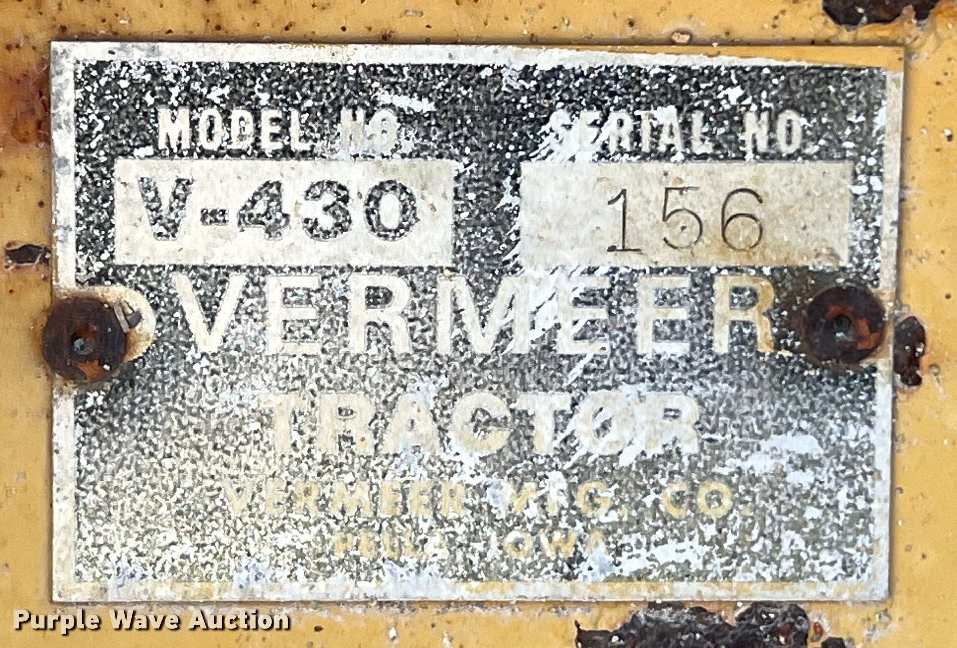 1982 Vermeer V-430 trencher. Hours: 951 on meter, Serial: 156. Engine Cylinders: 2, Fuel type: Diesel. Transmission Manual, 3F - 1R, Four wheel drive. Features Trencher Model: V-16, Serial: 182, Estimated dig depth: 48", Cutting width: 6", Teeth: Dirt, Manual crumber, Backfill blade Width: 60". Tires Size: 26x12.00-12, Brand: Deestone. Valley Mills, TX 76689